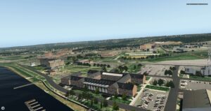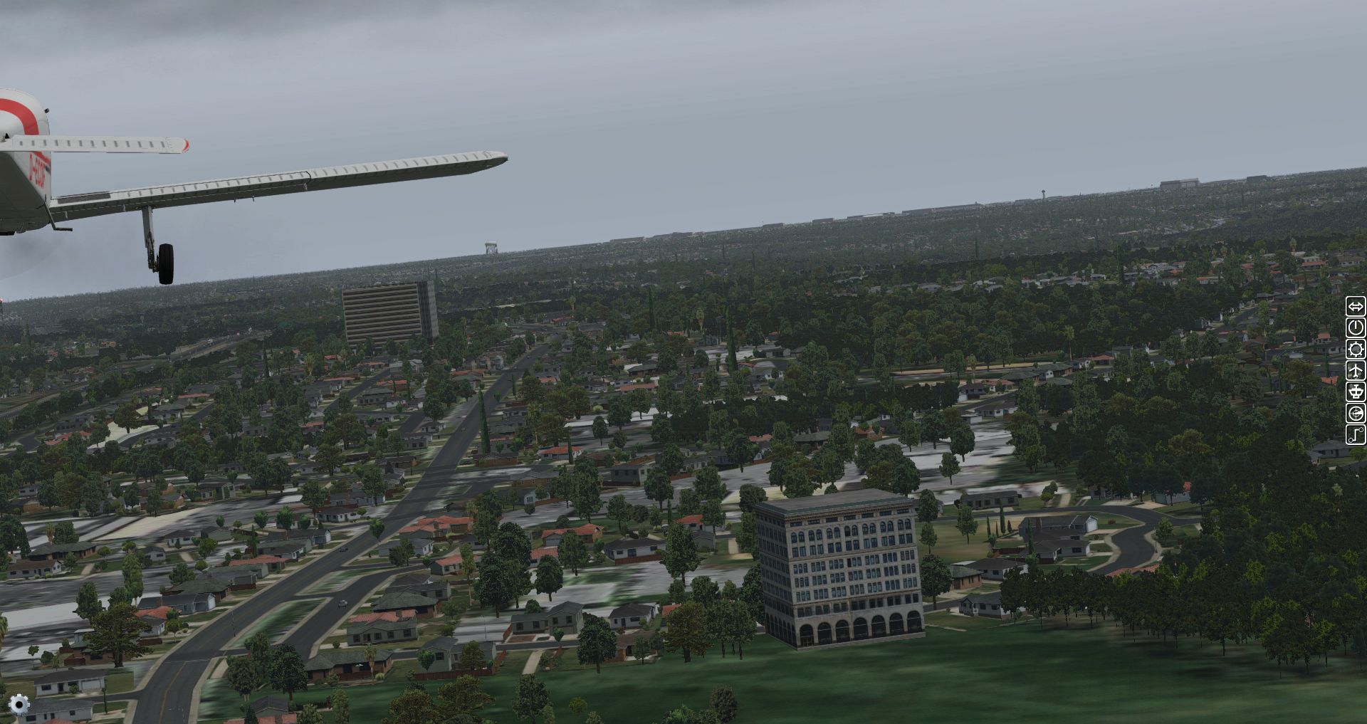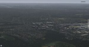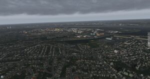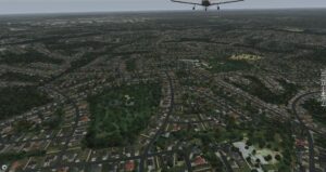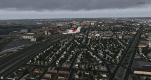 Was hingegen deutlich besser funktioniert als im FSX und P3D ist die Verschmelzug des AutoGen, der Straßen und der neuen Custom Gebäude zu einem gemeinsamen Ganzen. Das hat gleich mehrere Vorteile. Zum einen gibt es keine deutlich sichtbaren Kanten in der Bebauung. Zum anderen sparen diese immer gleichen Standardgebäude jede Menge Rechenzeit. Für die Grafikkarte ist der Aufwand für 5 oder 500 gleiche Gebäude nahezu gleich groß! Man kann also nahezu ohne Kosten weit mehr Gebäude der gleichen Art platzieren. Dadurch geht die unscharfe Fototextur im Umkreis nahezu unter und gleichzeitig erzeugt die Szenerie wenig Last.