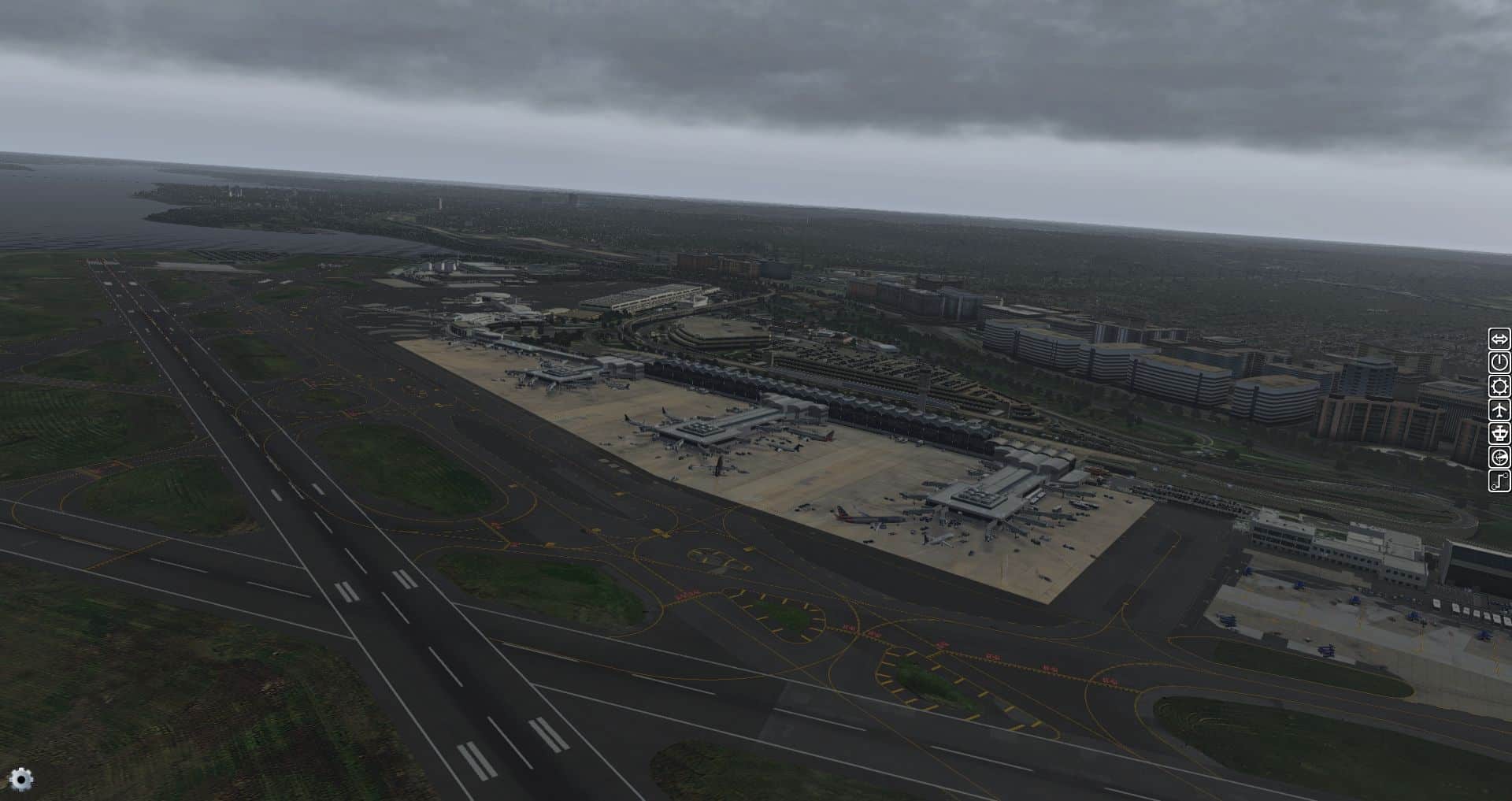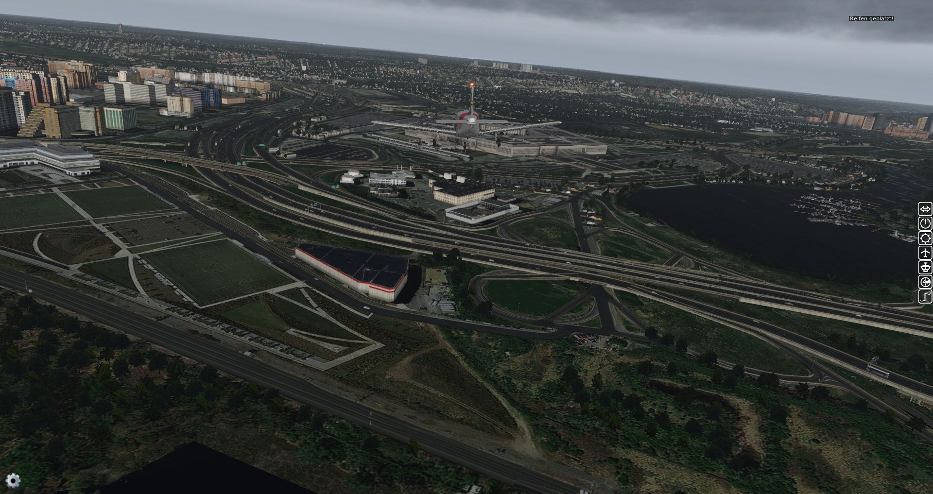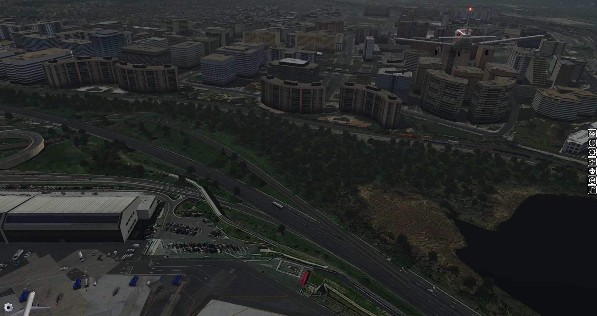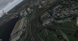 Nach dem Start sieht es jedoch etwas besser aus. Die Nachtbeleuchtung ist recht nett und auch am Tag sieht der Flughafen von oben ganz passabel aus. Noch stärker als der Flughafen selbst fallen jedoch die Hochhäuser im Hintergrund ins Auge. Auch die wesentlich ordentlicheren Highways fallen auf. Wenn man dem AutoGen derart komplexe Verbindungen überlässt kommt es gerne durcheinander. Hier wurde offensichtlich regelnd eingegriffen und es wurden noch kleine Löcher in die Auf- und Abfahrten platziert, damit der simulierte Autoverkehr nicht zu viele Entscheidungen treffen muss. Ein Auto kann in der Grafikkarte einen Weg folgen, aber wenn ein Auto entscheiden muß ob es rechts oder links lang geht, muss der Prozessor ran.