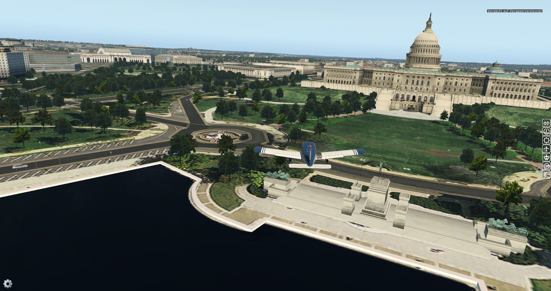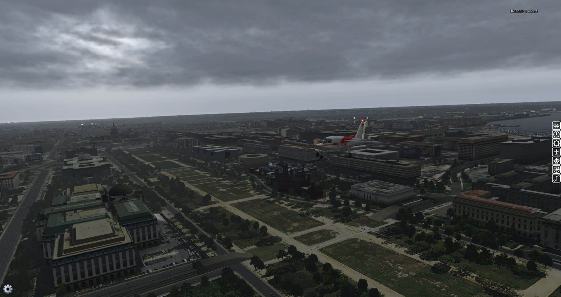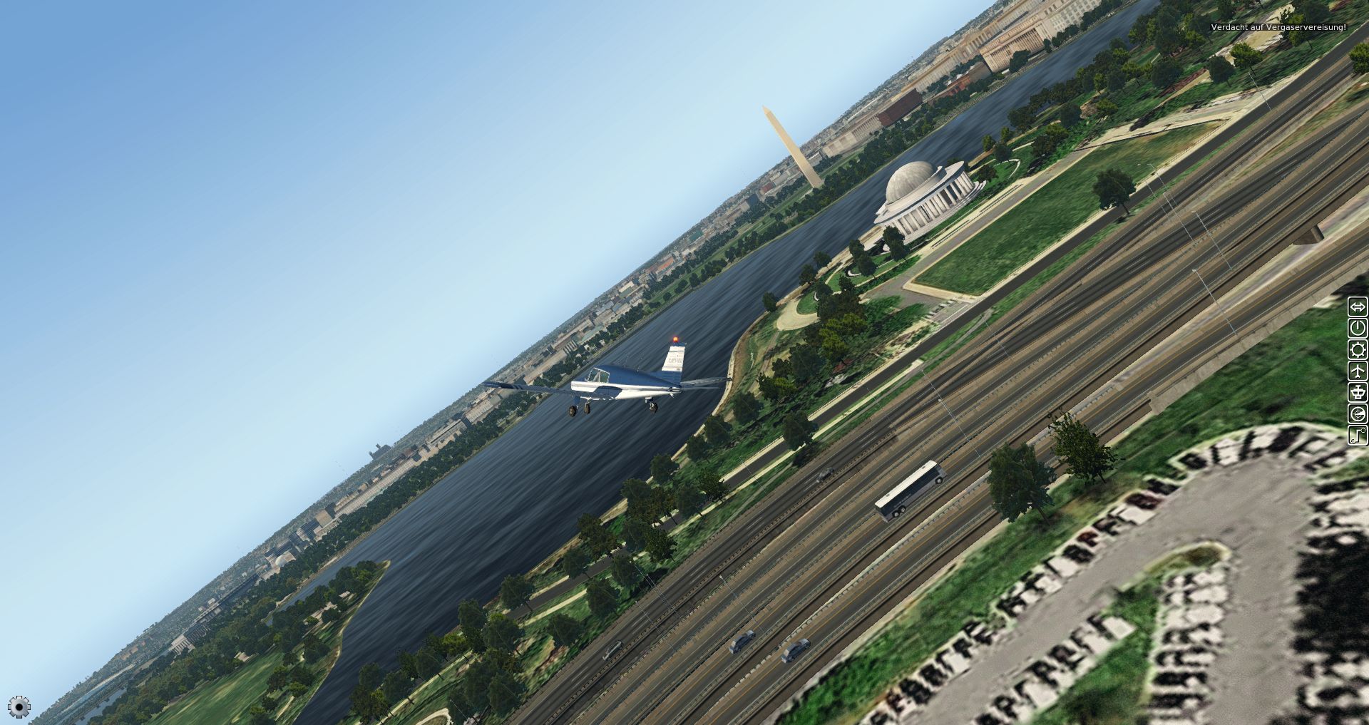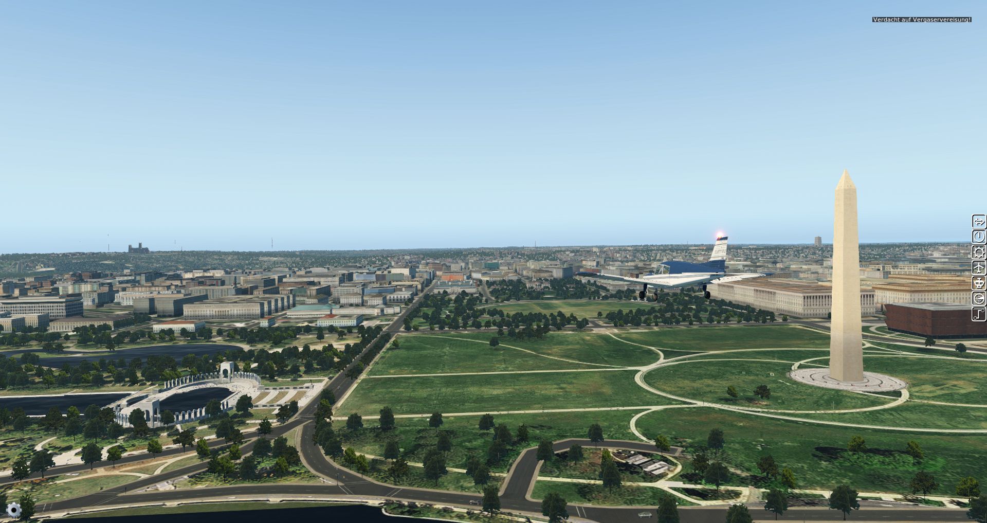 Wir fliegen dieses Mal vom Jefferson Memorial zwischen dem World War II Memorial und dem Washington Monument hindurch, weiter zum Weißen Haus um dort abzubiegen.