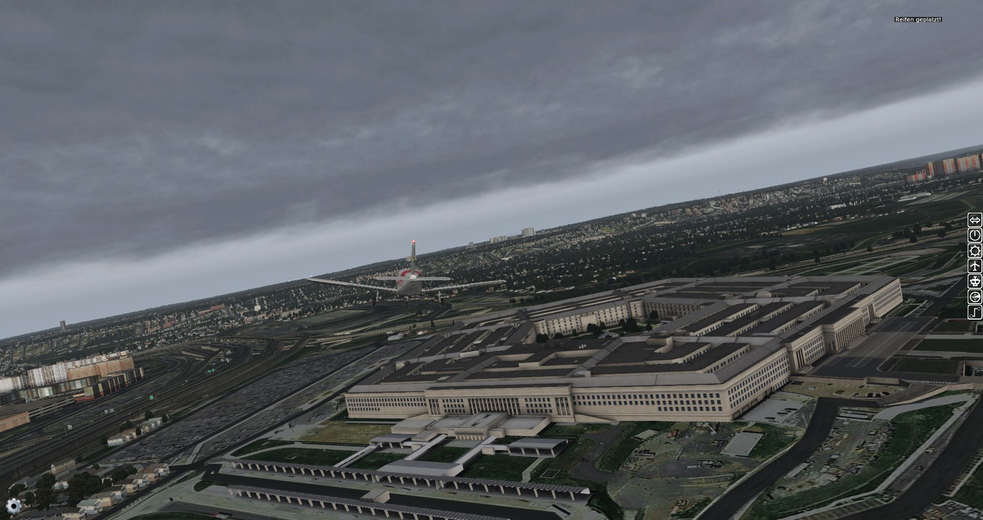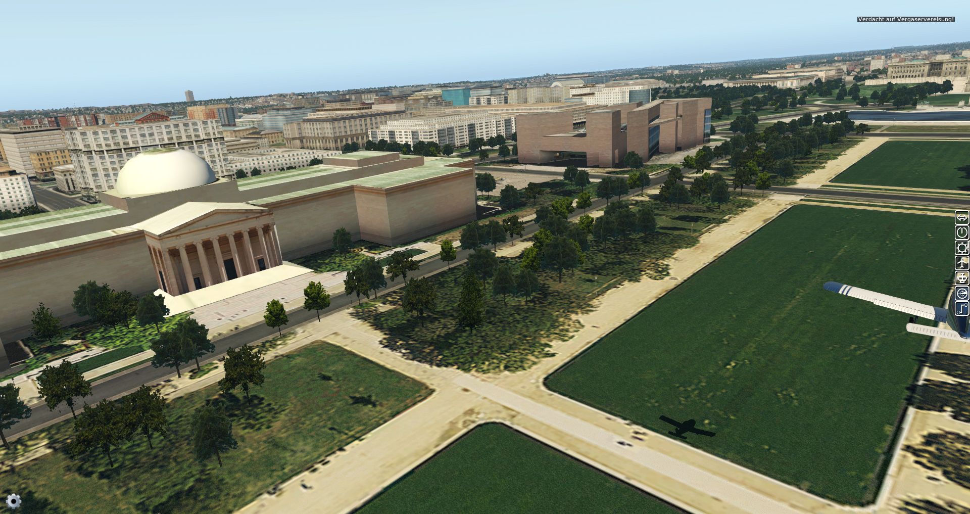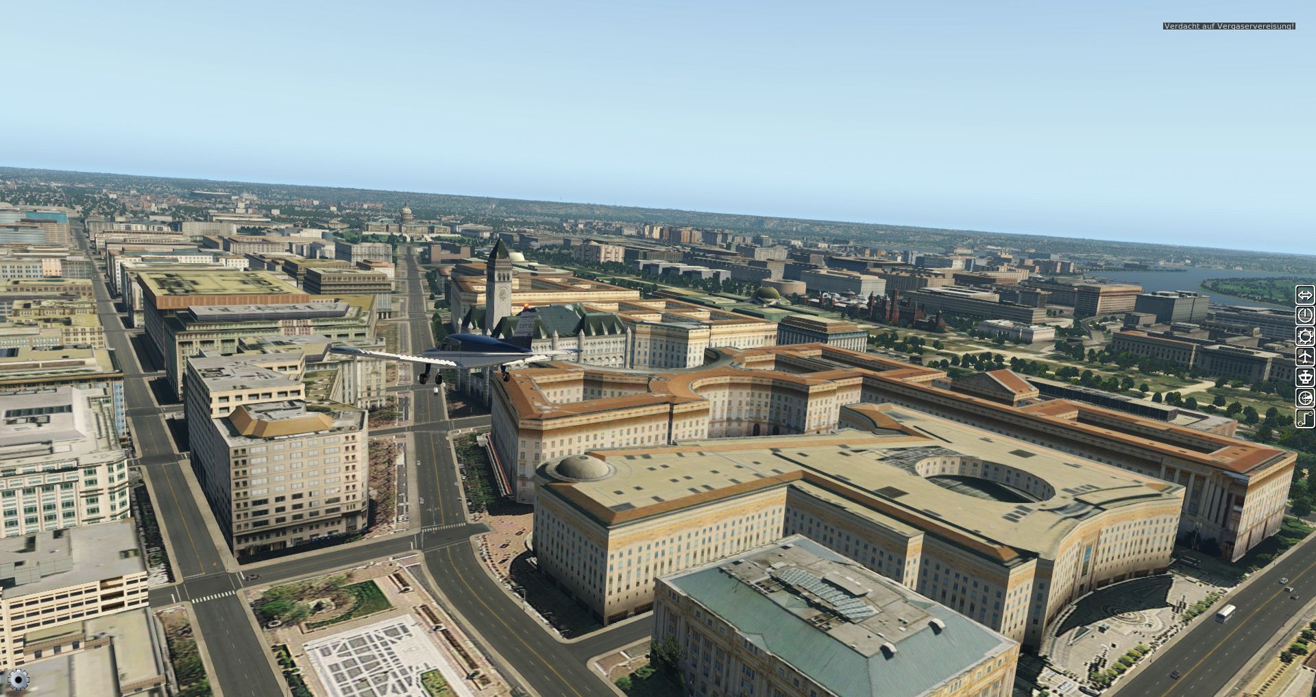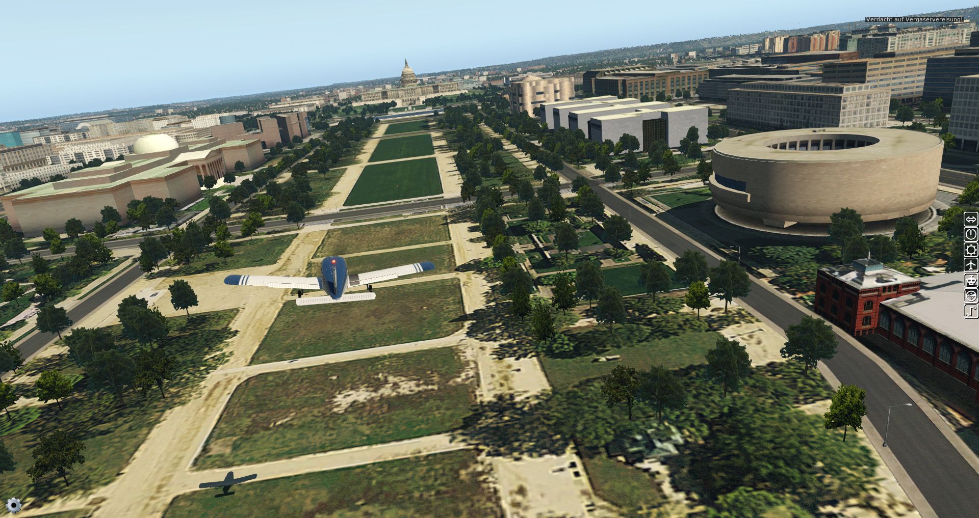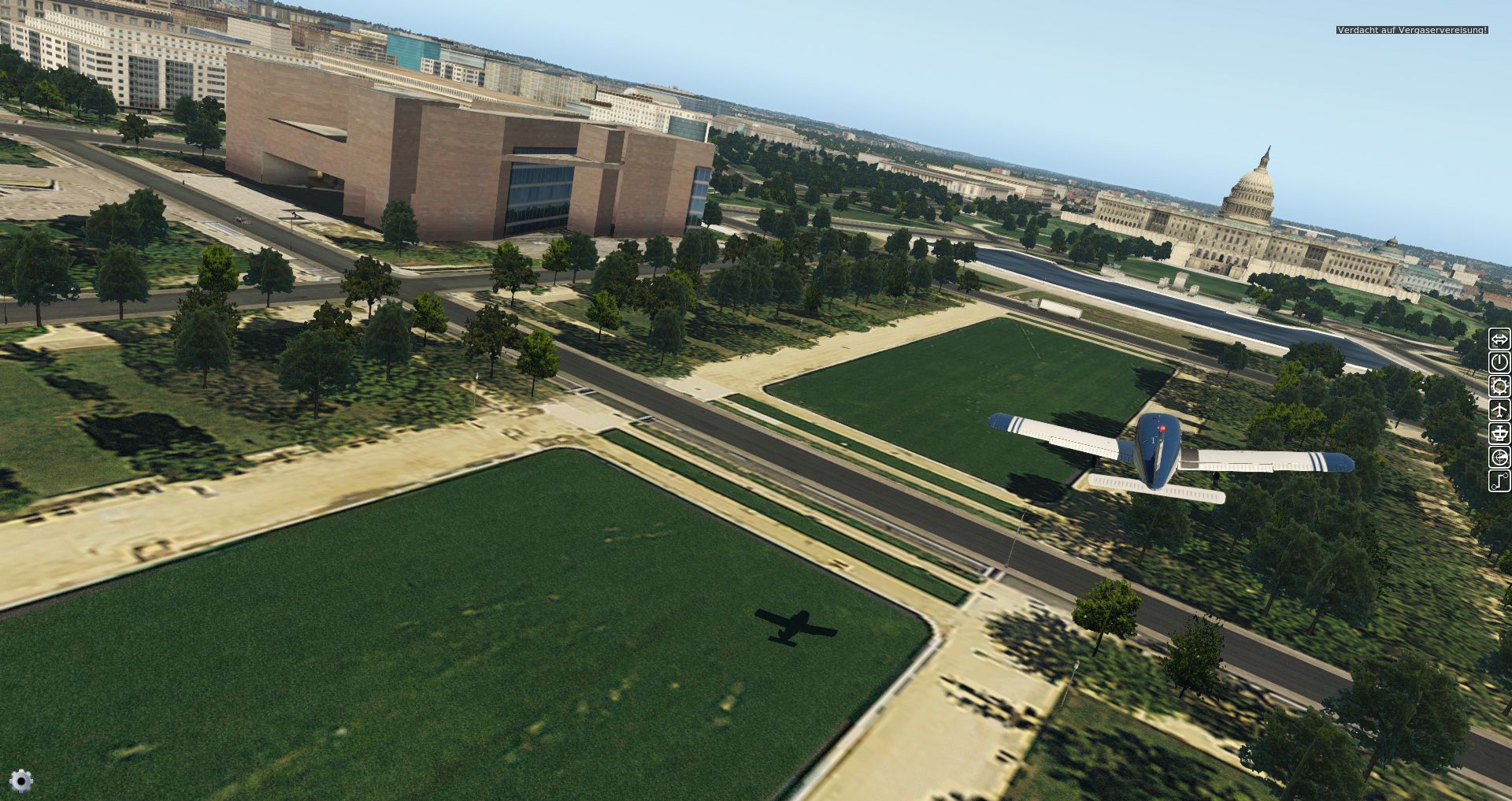 Wir fliegen dieses Mal vom Jefferson Memorial zwischen dem World War II Memorial und dem Washington Monument hindurch, weiter zum Weißen Haus um dort abzubiegen.