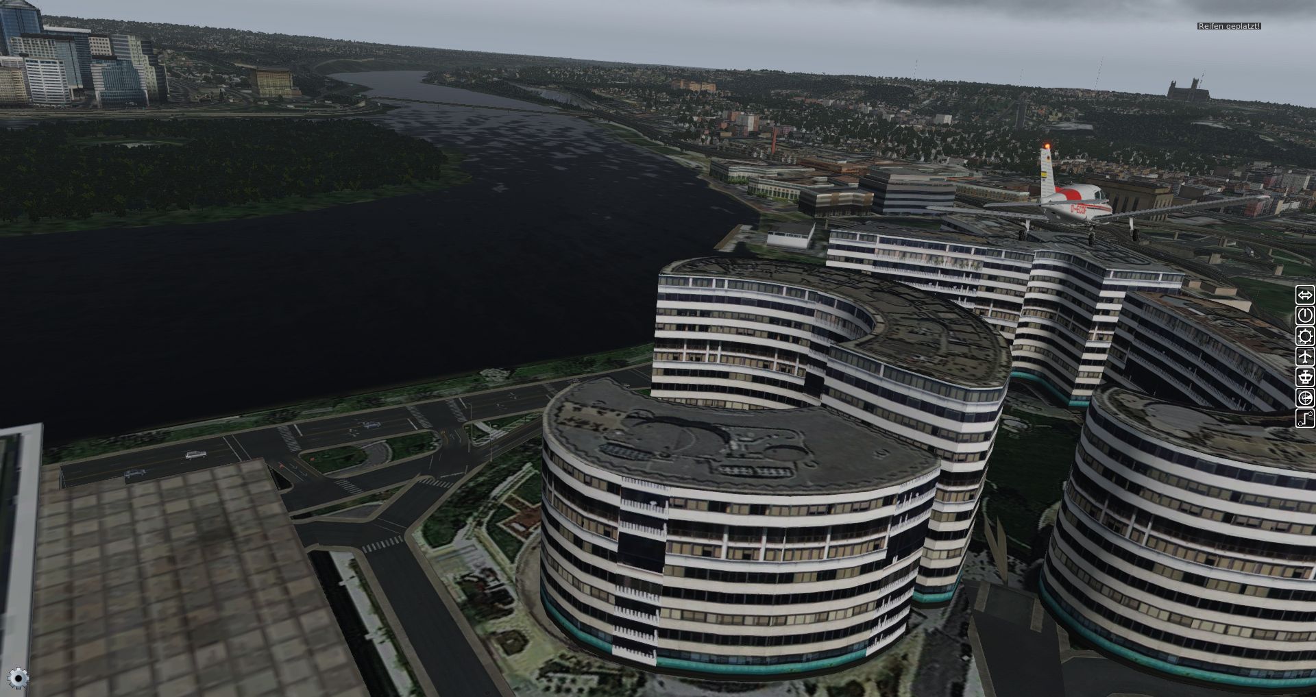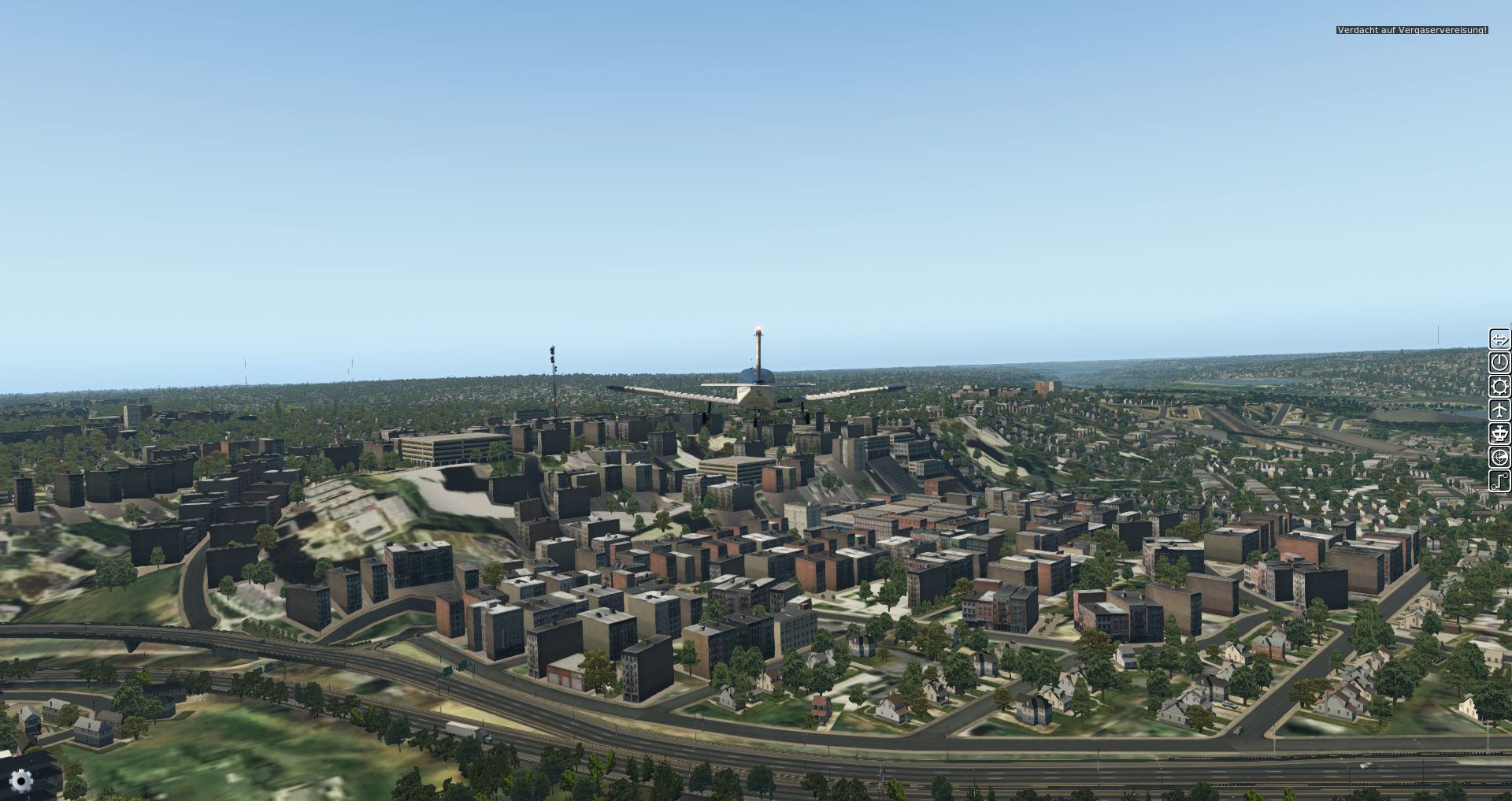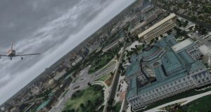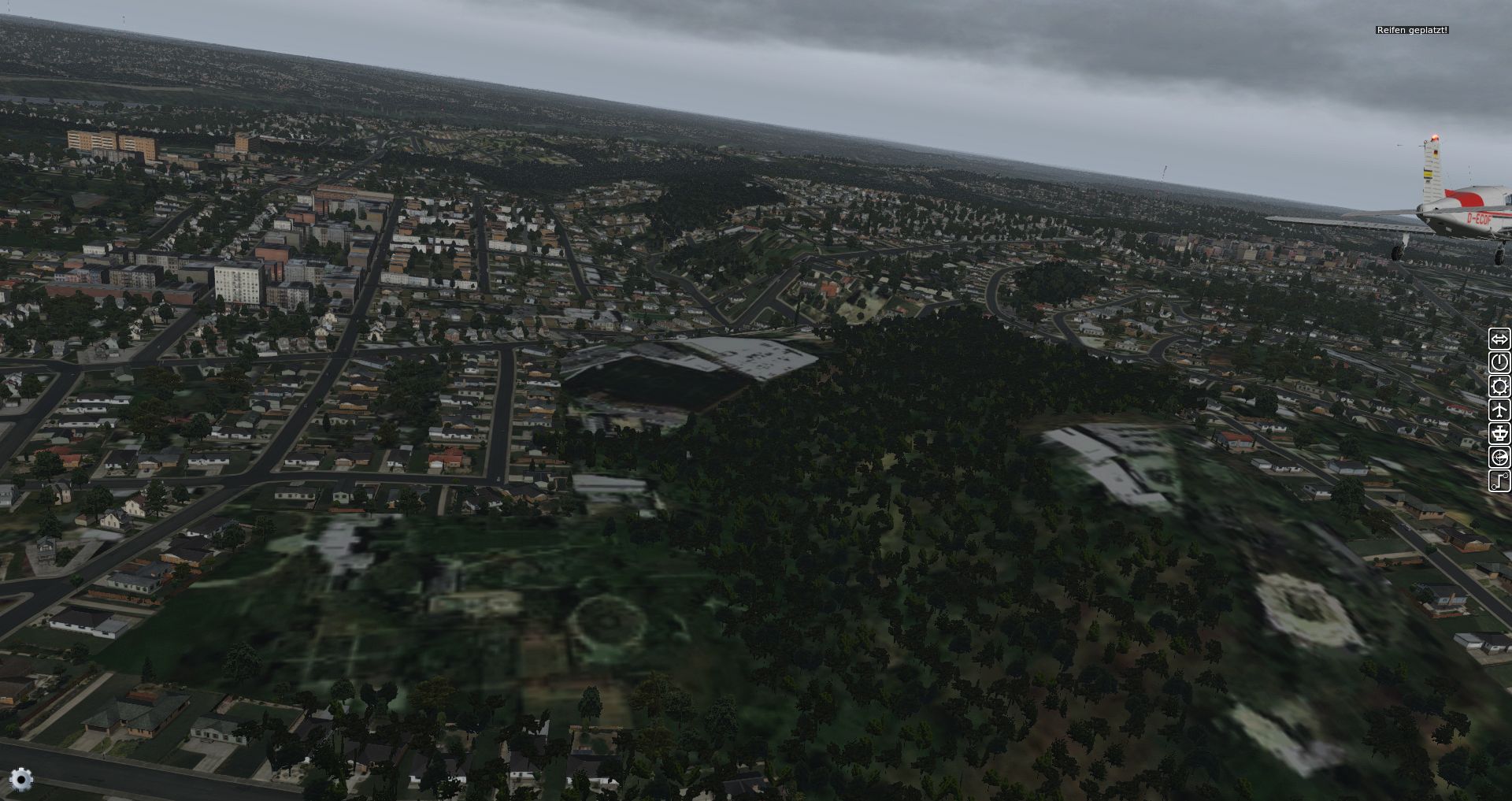 Allerdings werden wir direkt mit einer Bastelei von Drzewiecki Design konfrontiert. Das irreguläre Mesh von X-Plane ist deutlich komplizierter, als das reguläre Mesh vom FSX und seinen Ablegern. Daher gibt es noch keine wirklich komfortablen Möglichkeiten, das Mesh anzupassen. Manche Hersteller kommen damit zurecht , Drzewiecki Design nur mit Schwierigkeiten Während der Anflug an den Kongress halbwegs stimmt gibt es auf der anderen Seite, nach dem Überflug, kein derart starkes Gefälle, das abrupt endet.