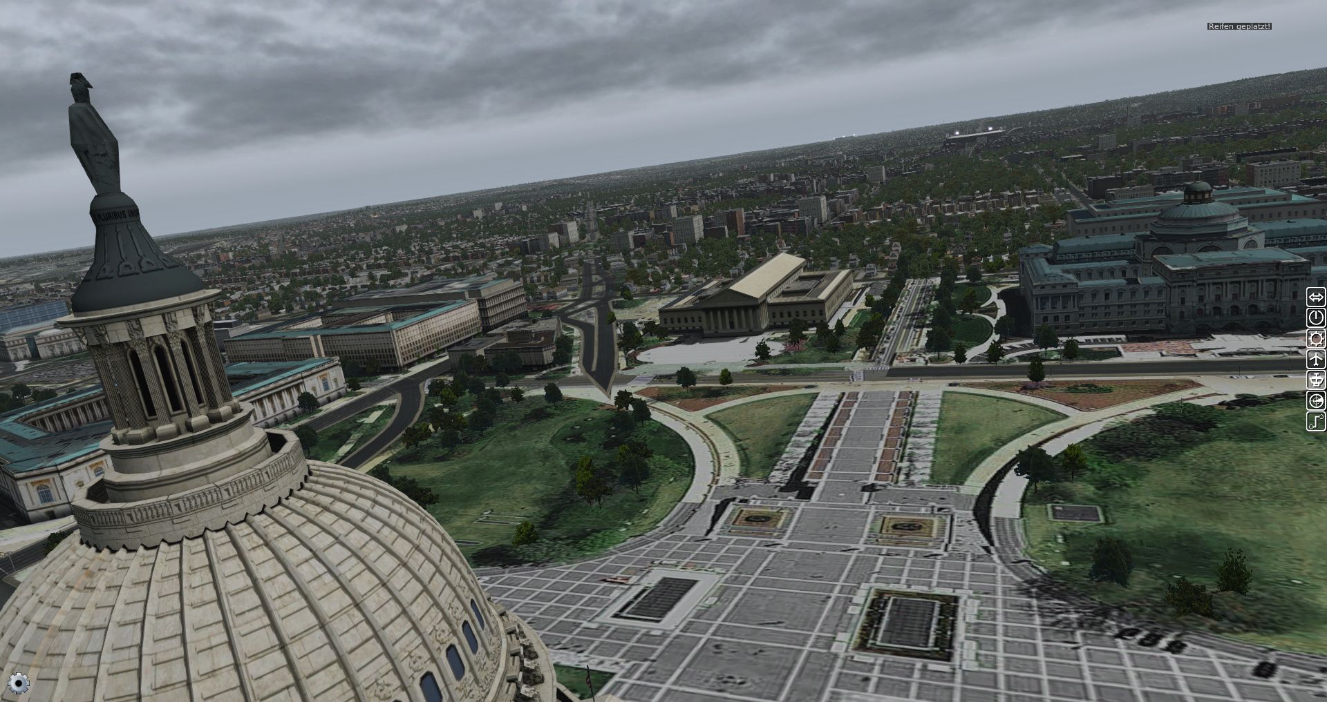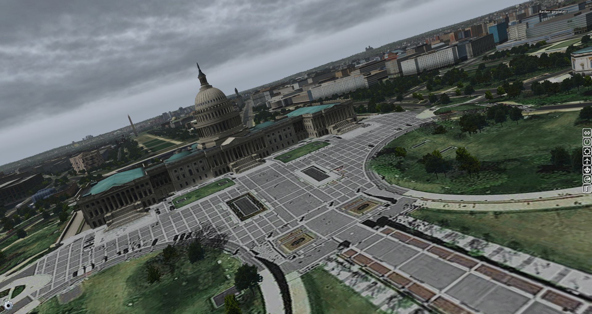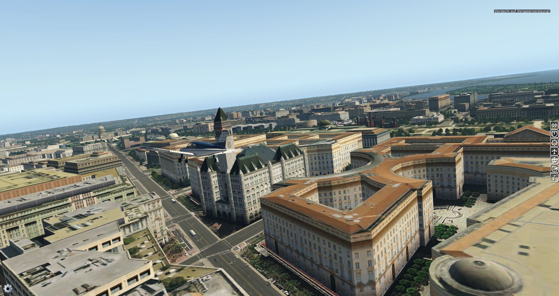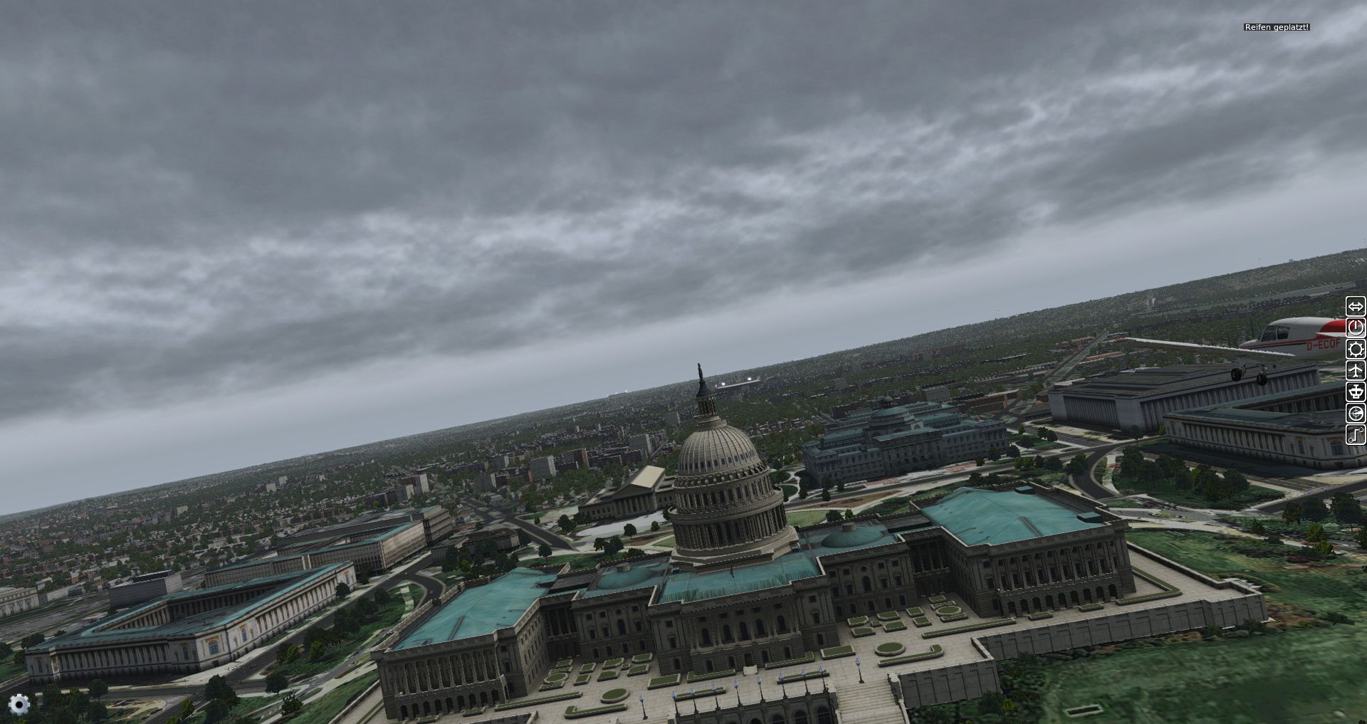 Es geht noch einmal im Tiefstflug an den Museen vorbei, wobei an den Statuen vor dem Capitol das Fehlen der dritten Dimension auffällt.