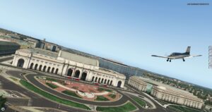 Damit kommen wir zur bekannten Union Station. Ursprünglich als zentraler Umsteigebahnhof geplant, um den Wechsel zwischen verschiedenen Privatbahnen zu ermöglich, spielt heute der klassische Bahnverkehr eine untergeordnete Rolle. Statt dessen ist es eine sehr zentrale U-Bahn-Station, und auch mehrere Buslinien haben hier einen Halt. Bei Touristen ist es gleichzeitig ein sehr beliebtes Baudenkmal, in dessen Foodcourt man etwas günstiges zu essen findet. Doch es ist kaum zu übersehen, dass Drzewiecki Design hier rationiert hat. Die Züge stehen nur in der Gegend herum und die Autos sind reine Fototexturen. Dadurch bricht die Performance auch bei unseren Tiefflug nicht ein.