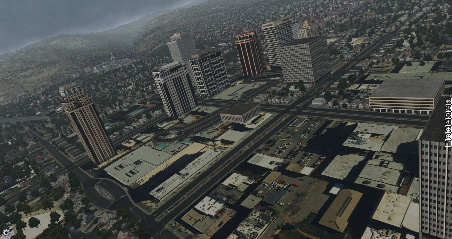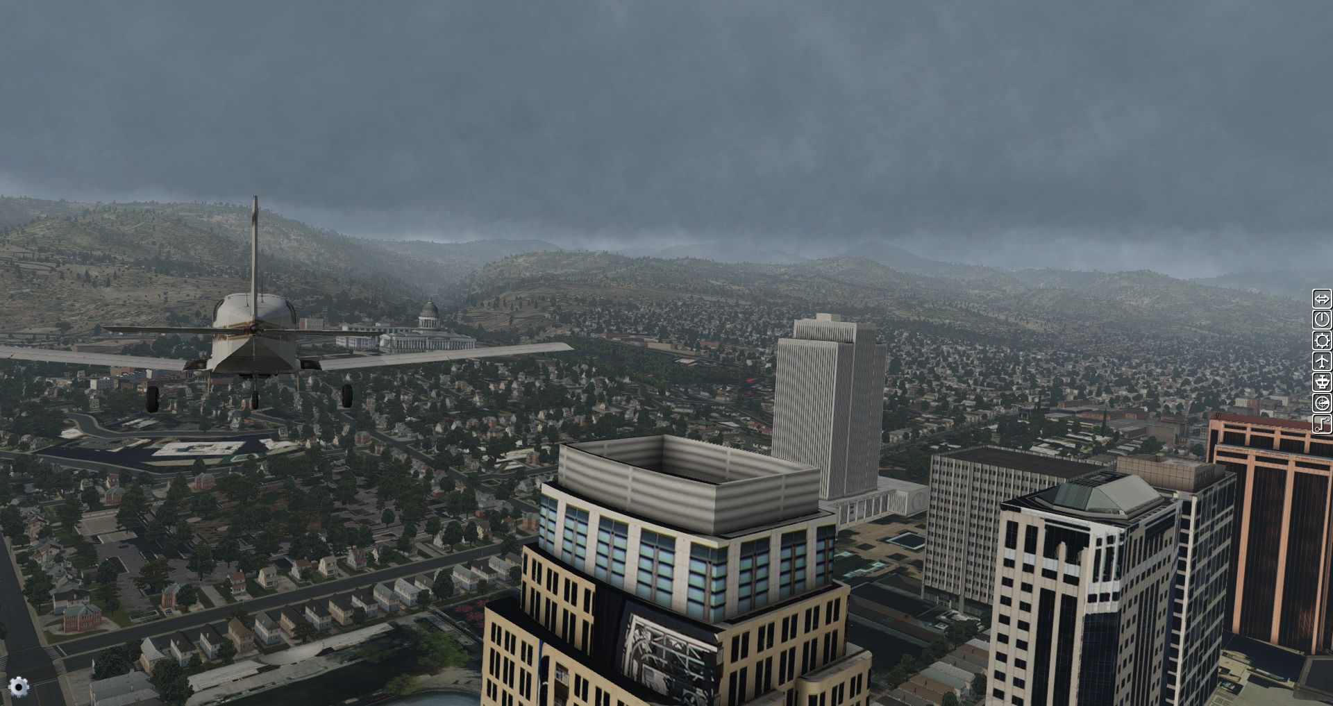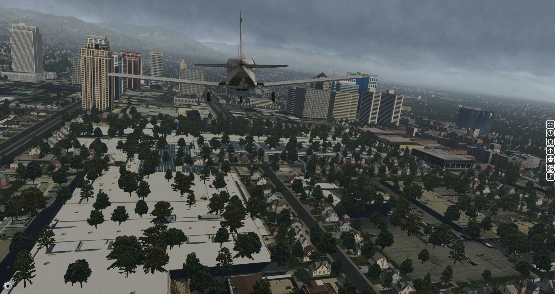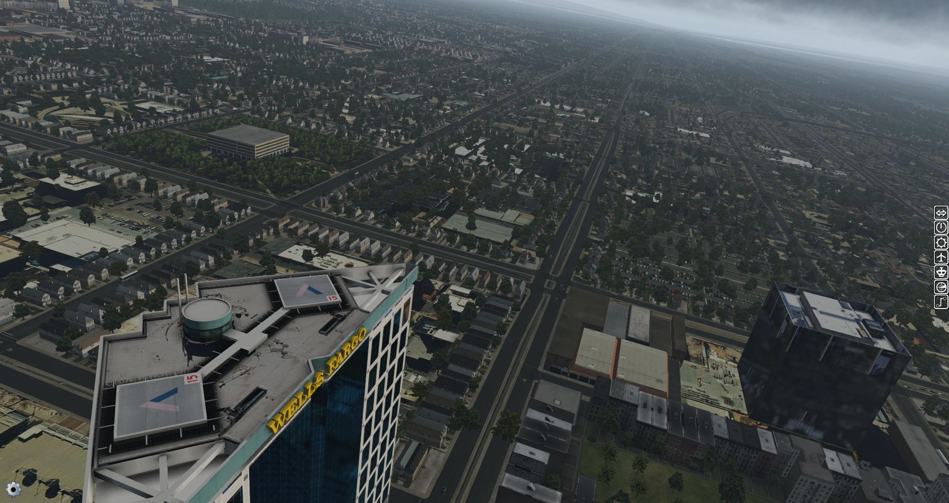 Wir erreichen Downtown, mit seinen spezifischen Hochhäusern. Vor allem das Wells Fargo Gebäude ist dabei hervor zu heben, da es einen Helikopterlandeplatz besitzt, der auch in X-Plane entsprechend modelliert wurde und damit genutzt werden kann.