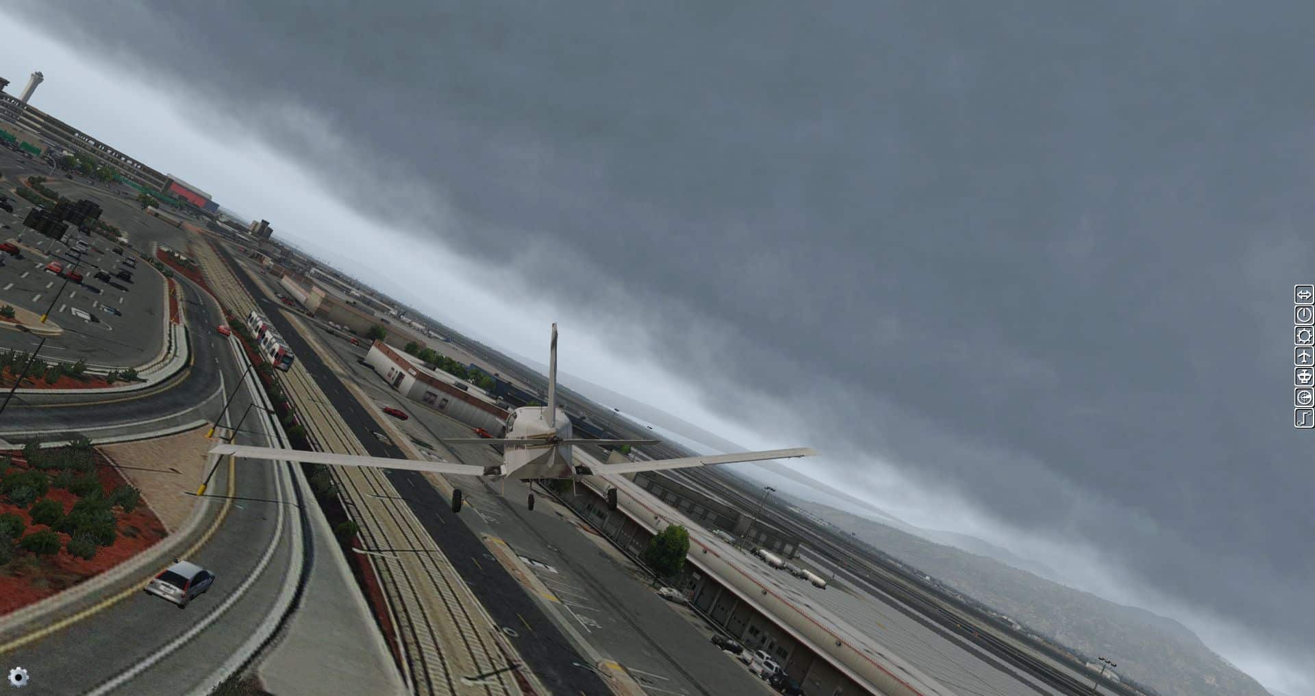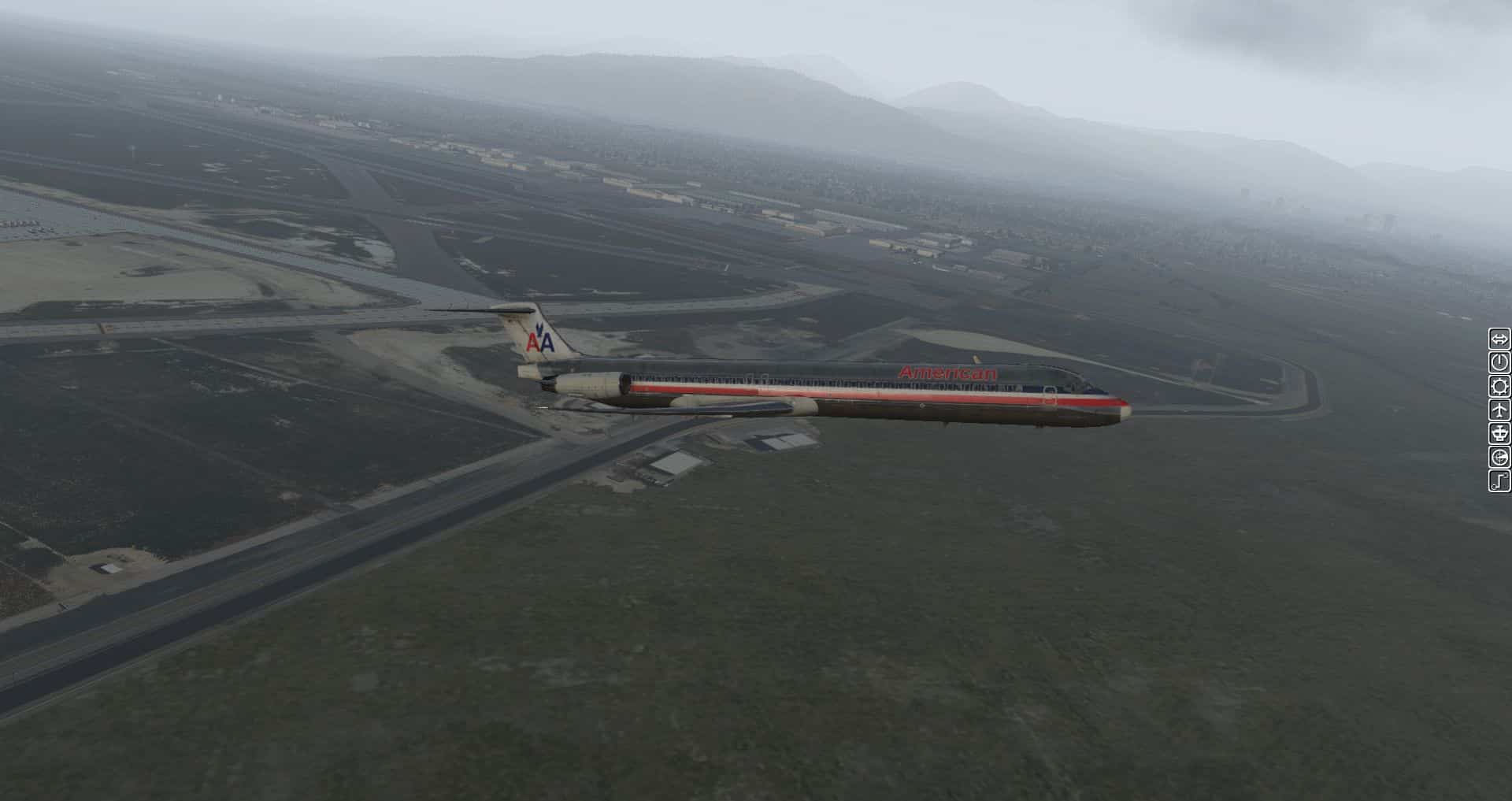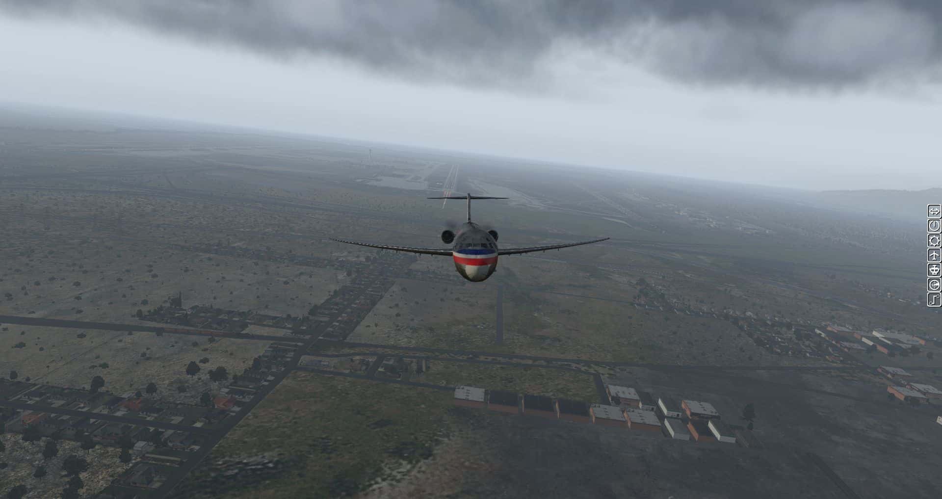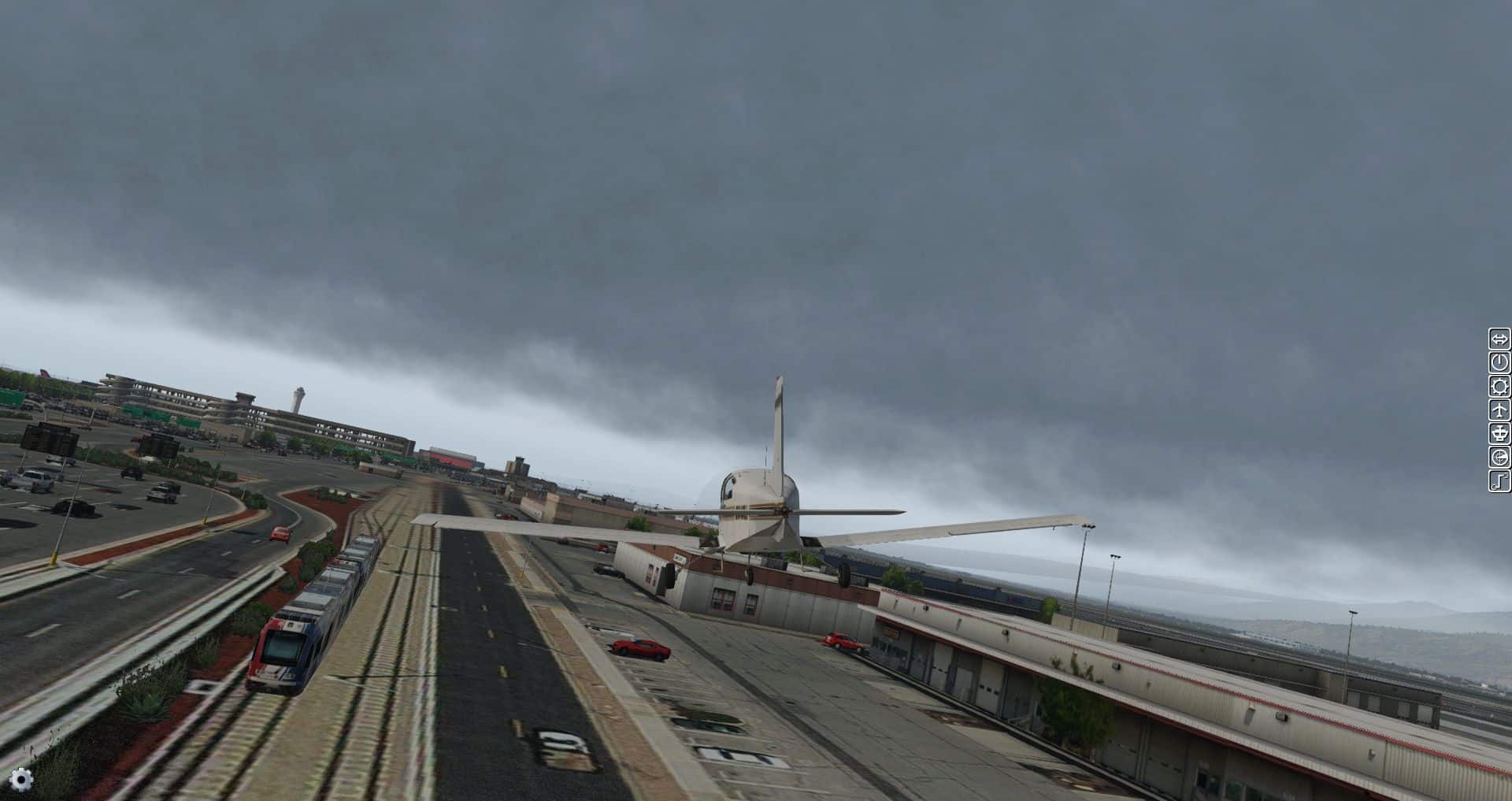 Nach dem Start sehen wir den Parkplatz, die Übergänge der Flughafentextur zur Default-Landclass, die Wartungshangars mit dem General Aviation Bereich und in der Entfernung im Nebel, sowie die Gebäude der Downtown.