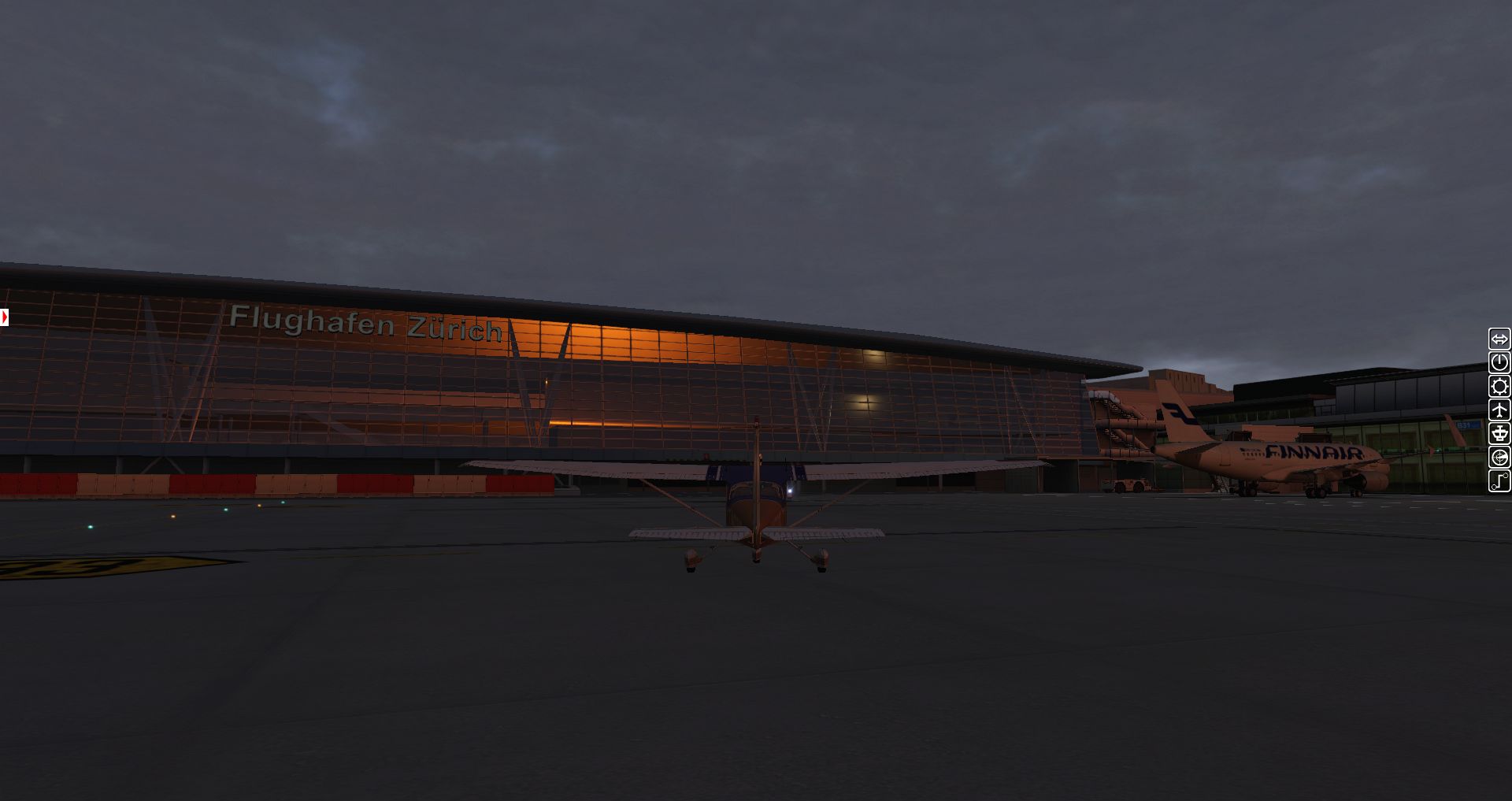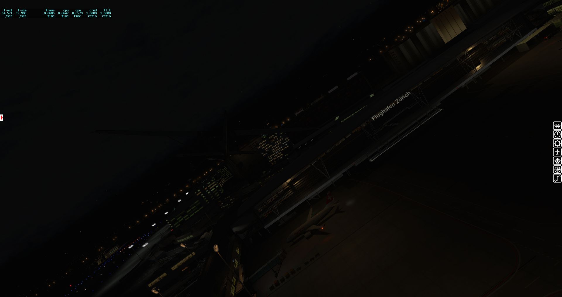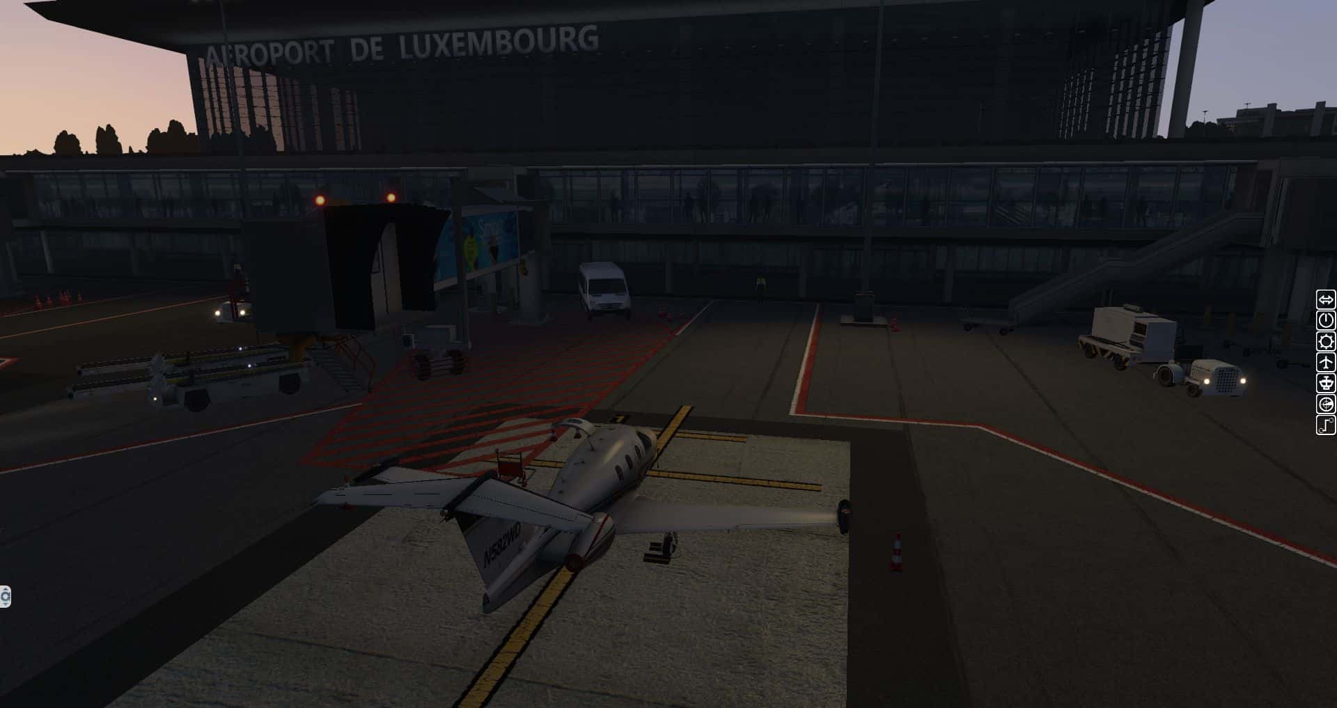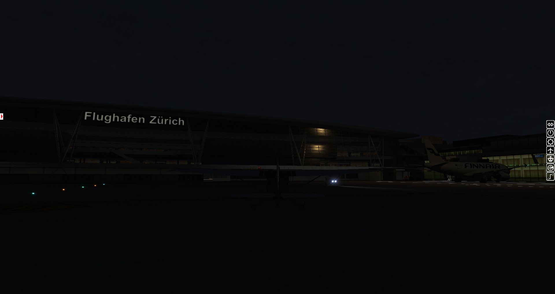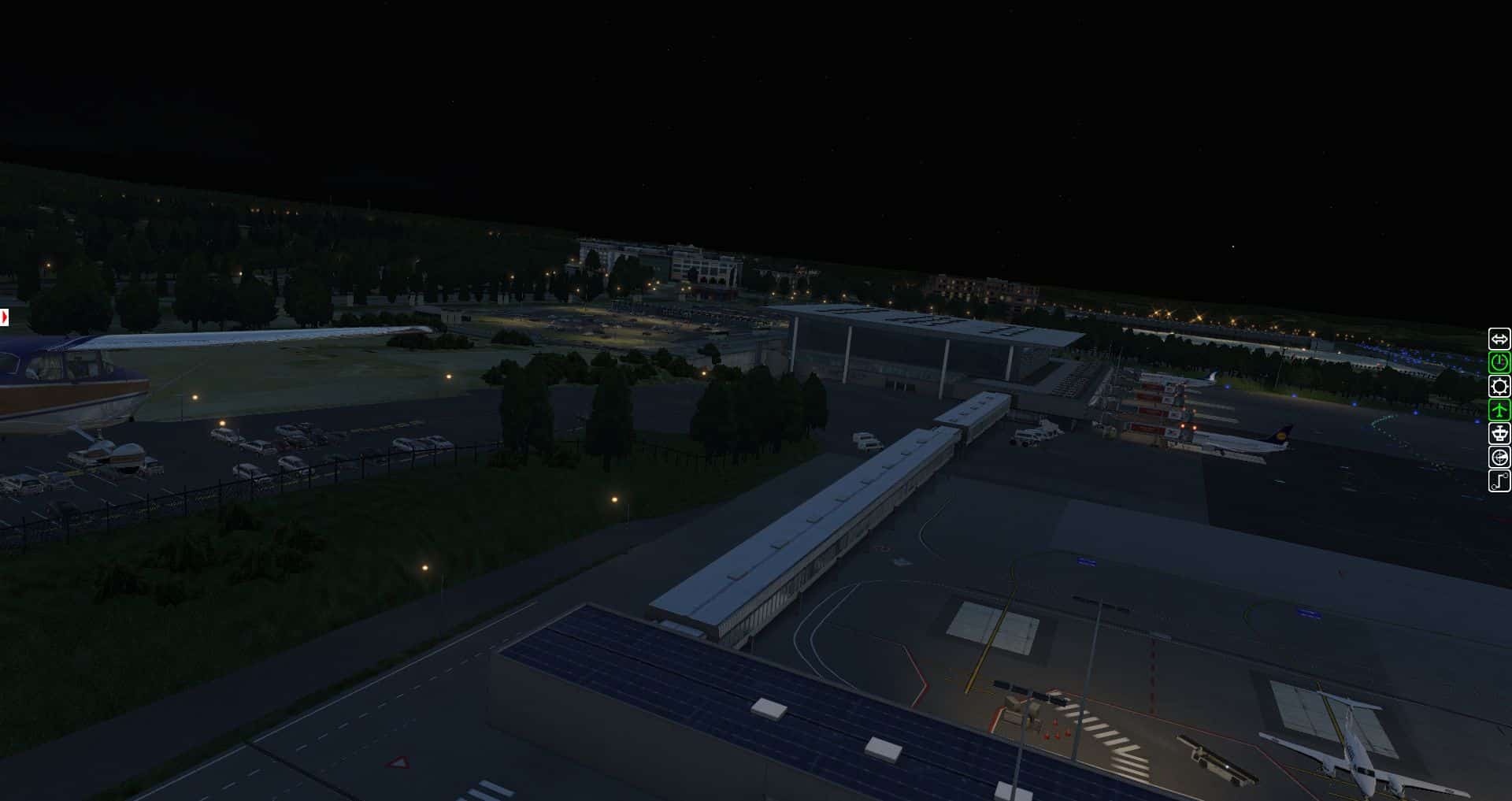 Wir fangen mit einer Aerobask Eclipse an. Das Terminal schafft es eine halbwegs glaubhafte Mischung aus Transparenz und Reflektion hin zu bekommen. Auch die Bodentexturen und die nächtliche Ausleuchtung sind ordentlich.