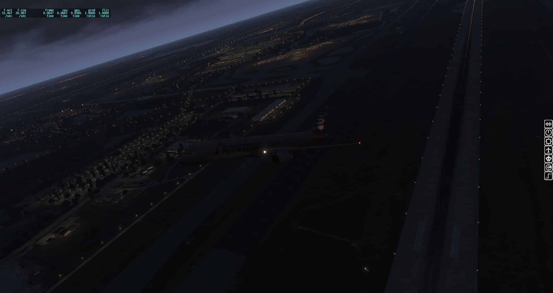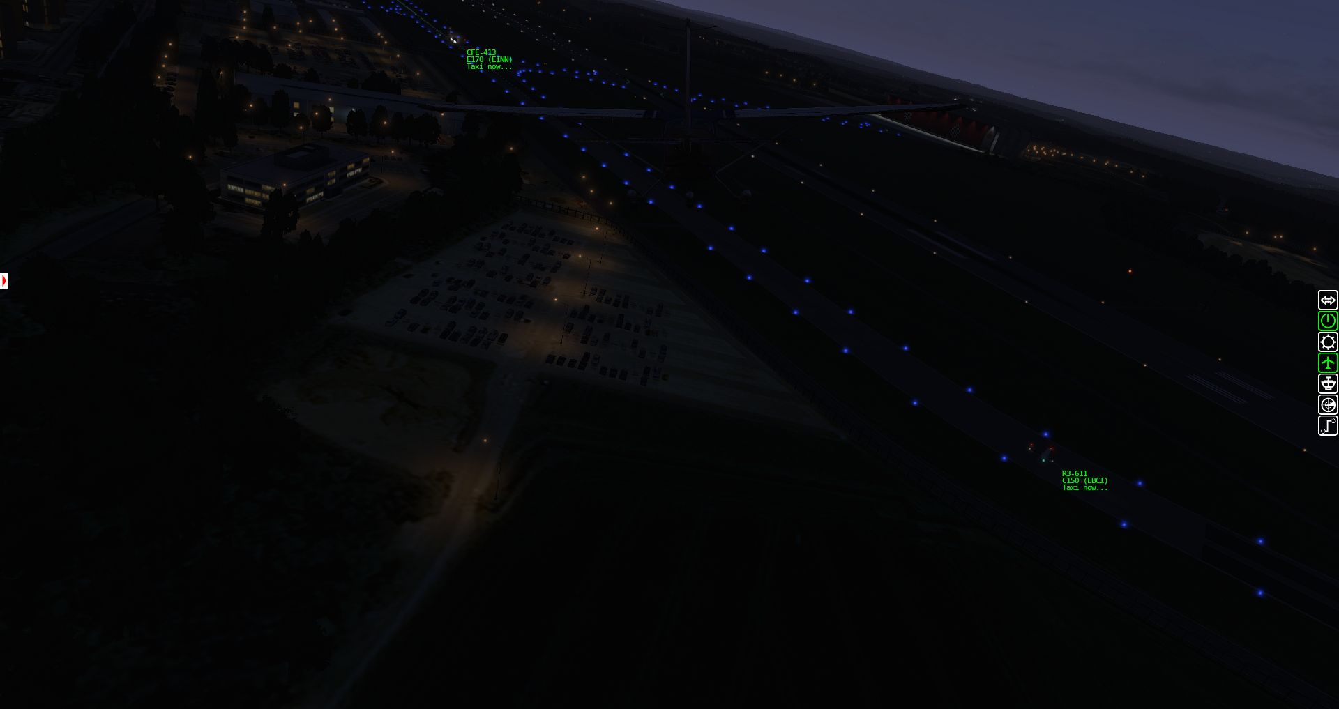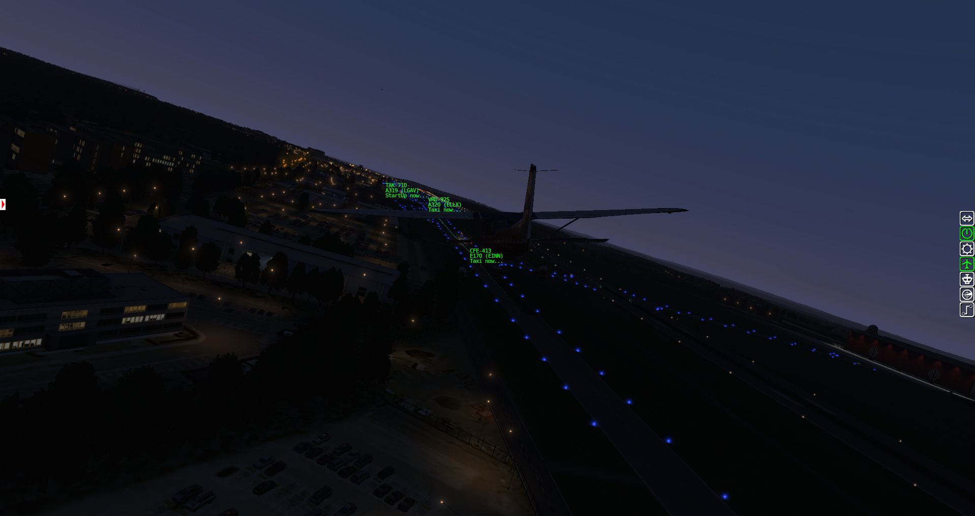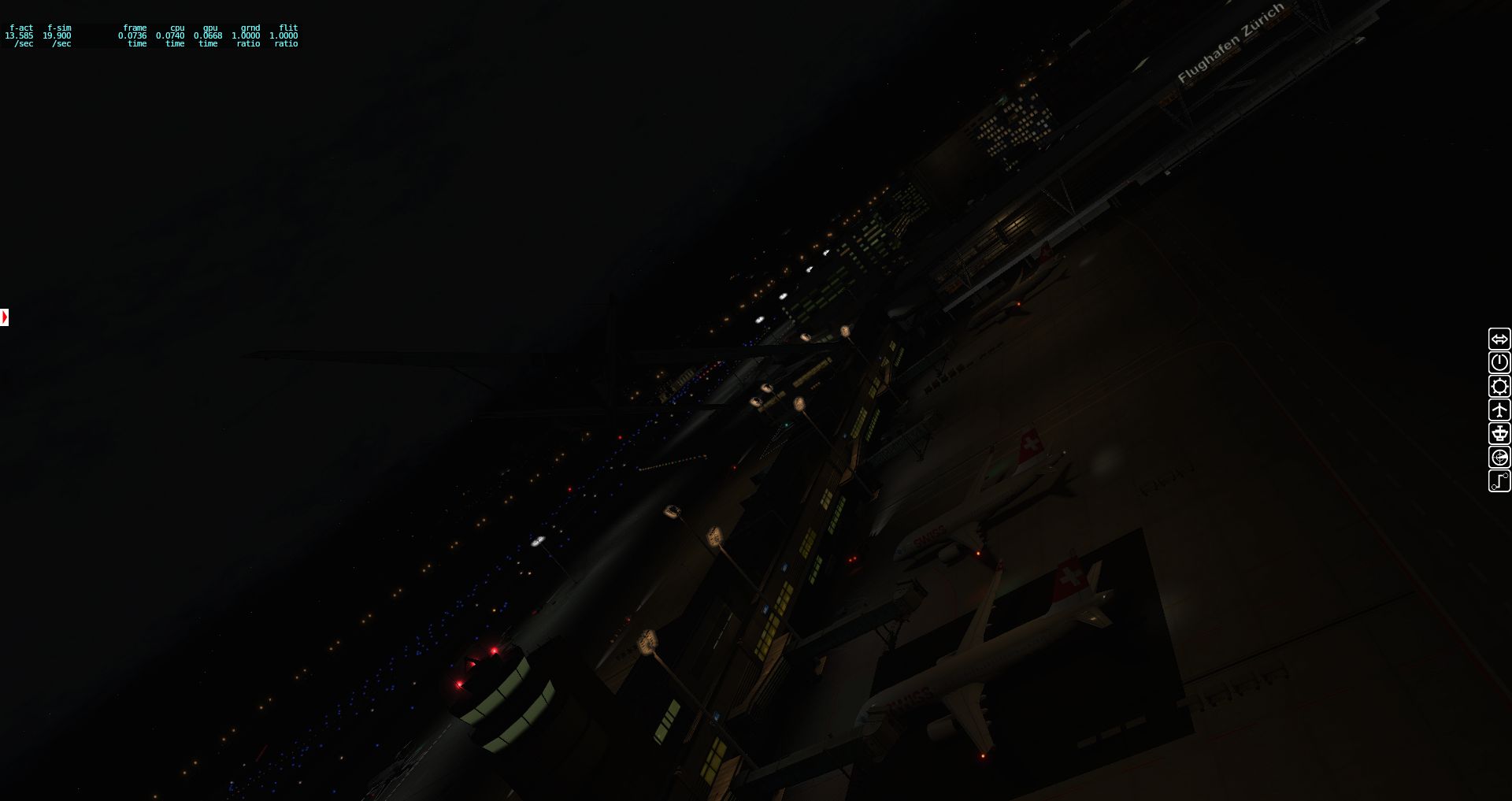 Wir fangen mit einer Aerobask Eclipse an. Das Terminal schafft es eine halbwegs glaubhafte Mischung aus Transparenz und Reflektion hin zu bekommen. Auch die Bodentexturen und die nächtliche Ausleuchtung sind ordentlich.