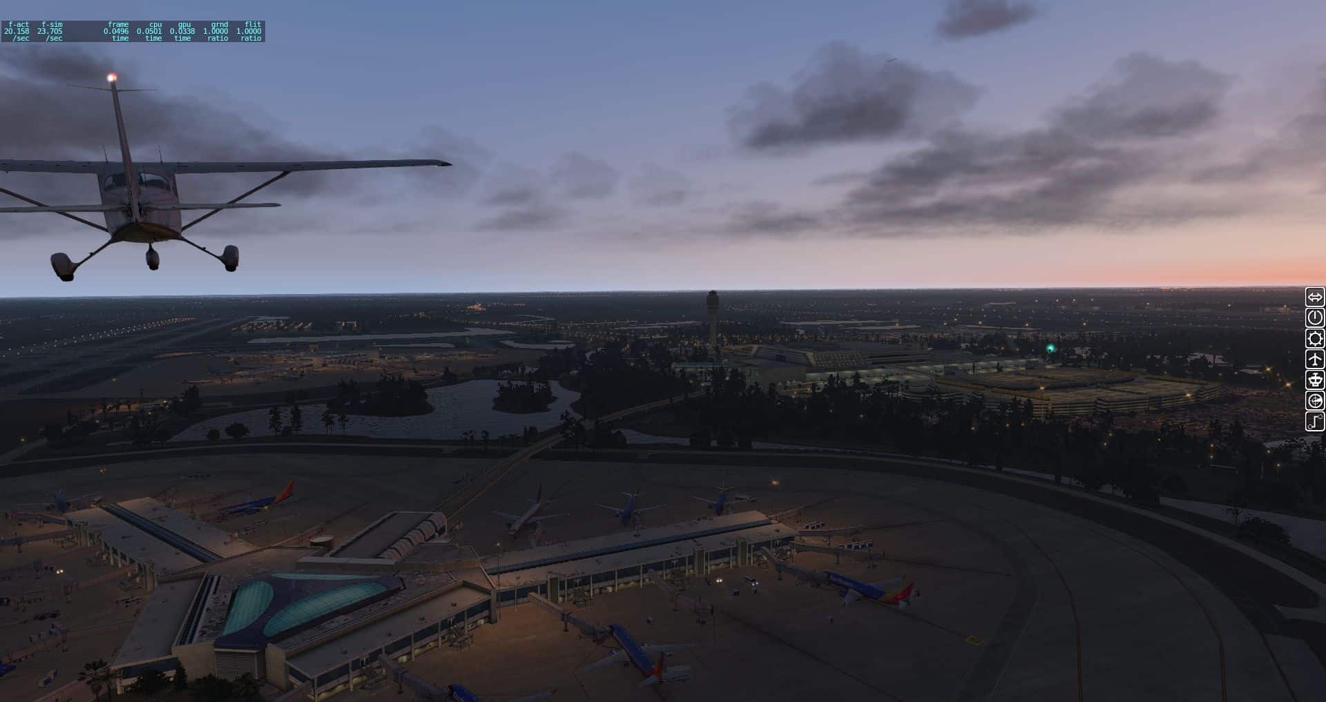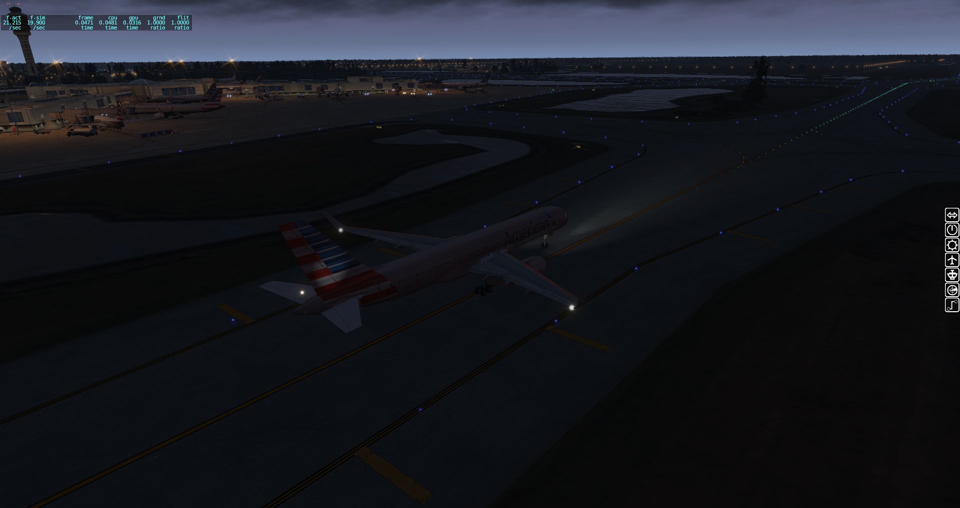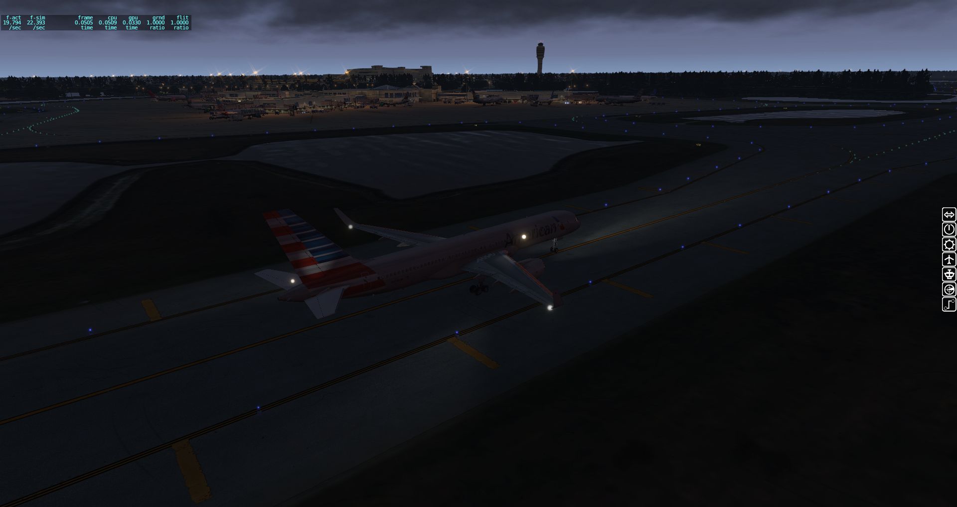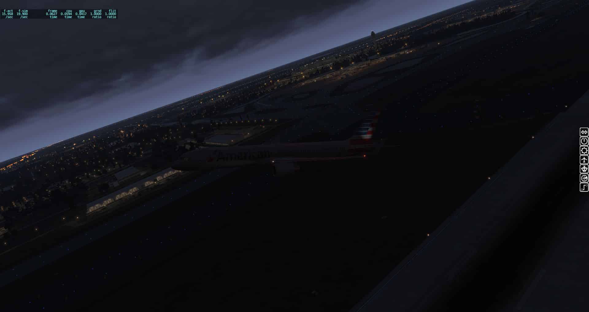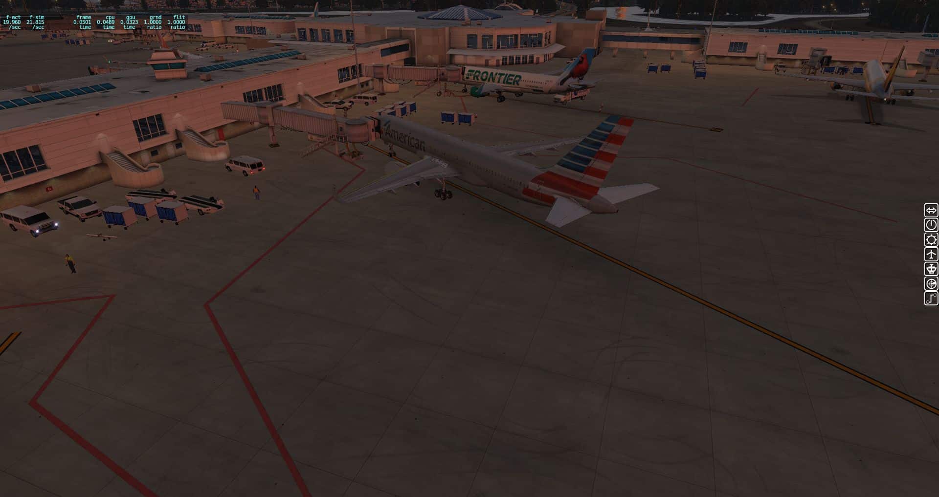 Wir fangen mit einer Aerobask Eclipse an. Das Terminal schafft es eine halbwegs glaubhafte Mischung aus Transparenz und Reflektion hin zu bekommen. Auch die Bodentexturen und die nächtliche Ausleuchtung sind ordentlich.