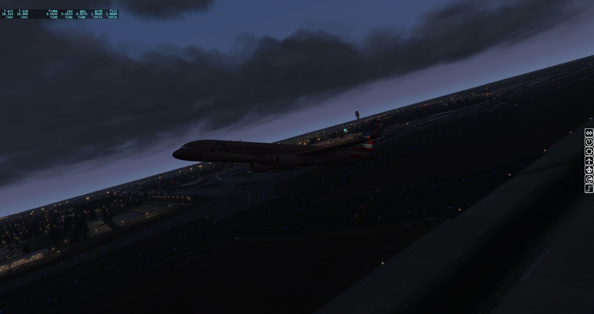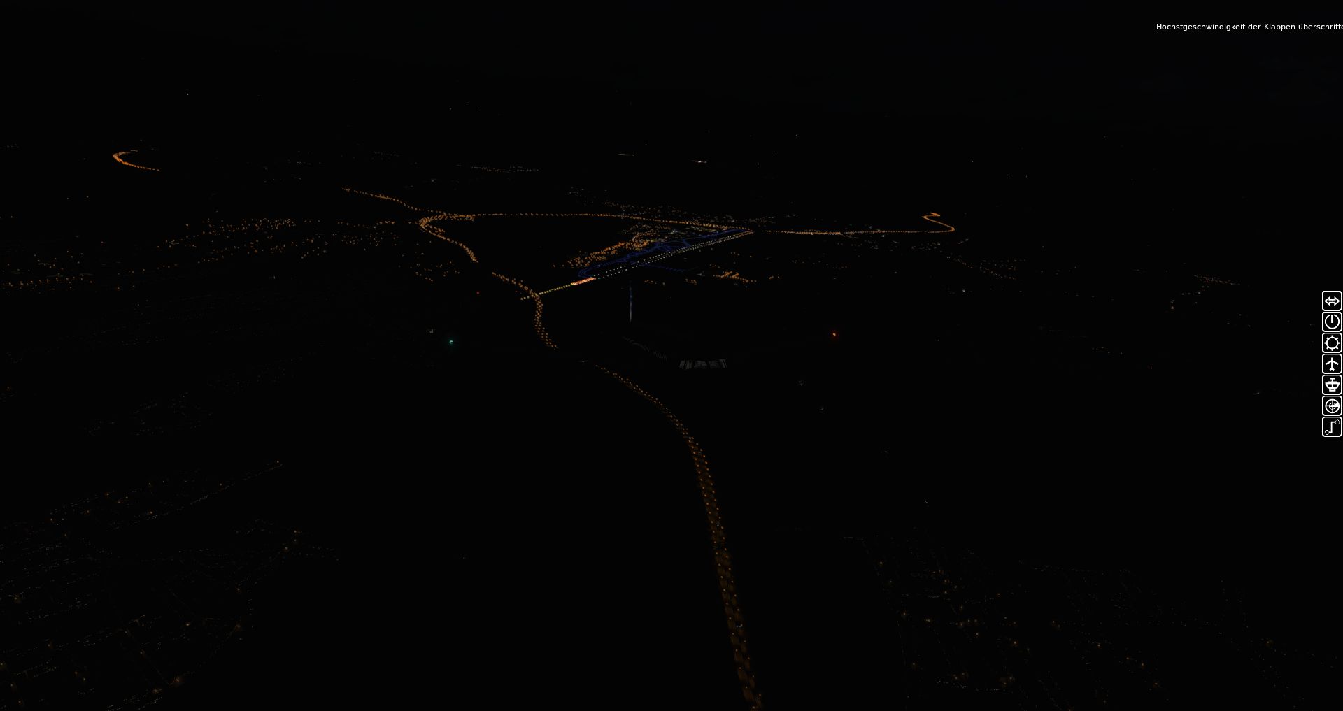 Es wird so langsam dunkel und die Maschine legt ab, wir sehen die nächtliche Ausleuchtung der Terminals und starten. Und dabei haben wir keinerlei Performanceprobleme.