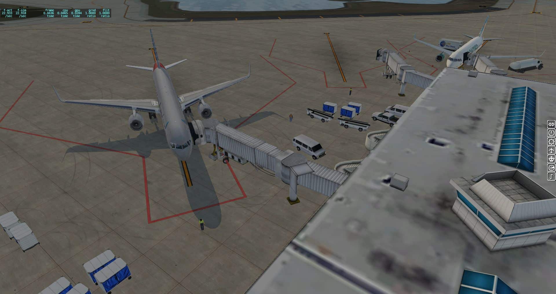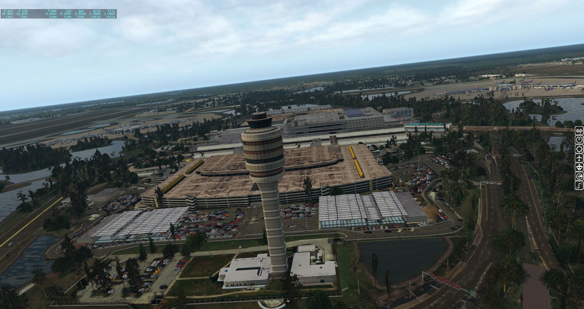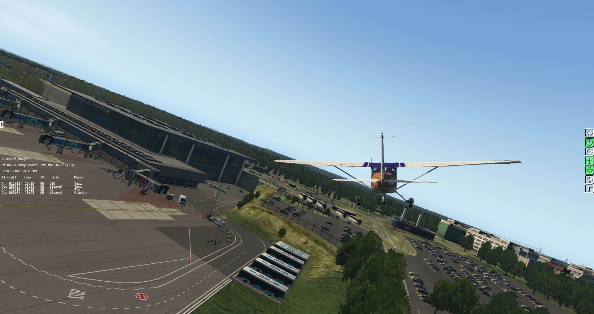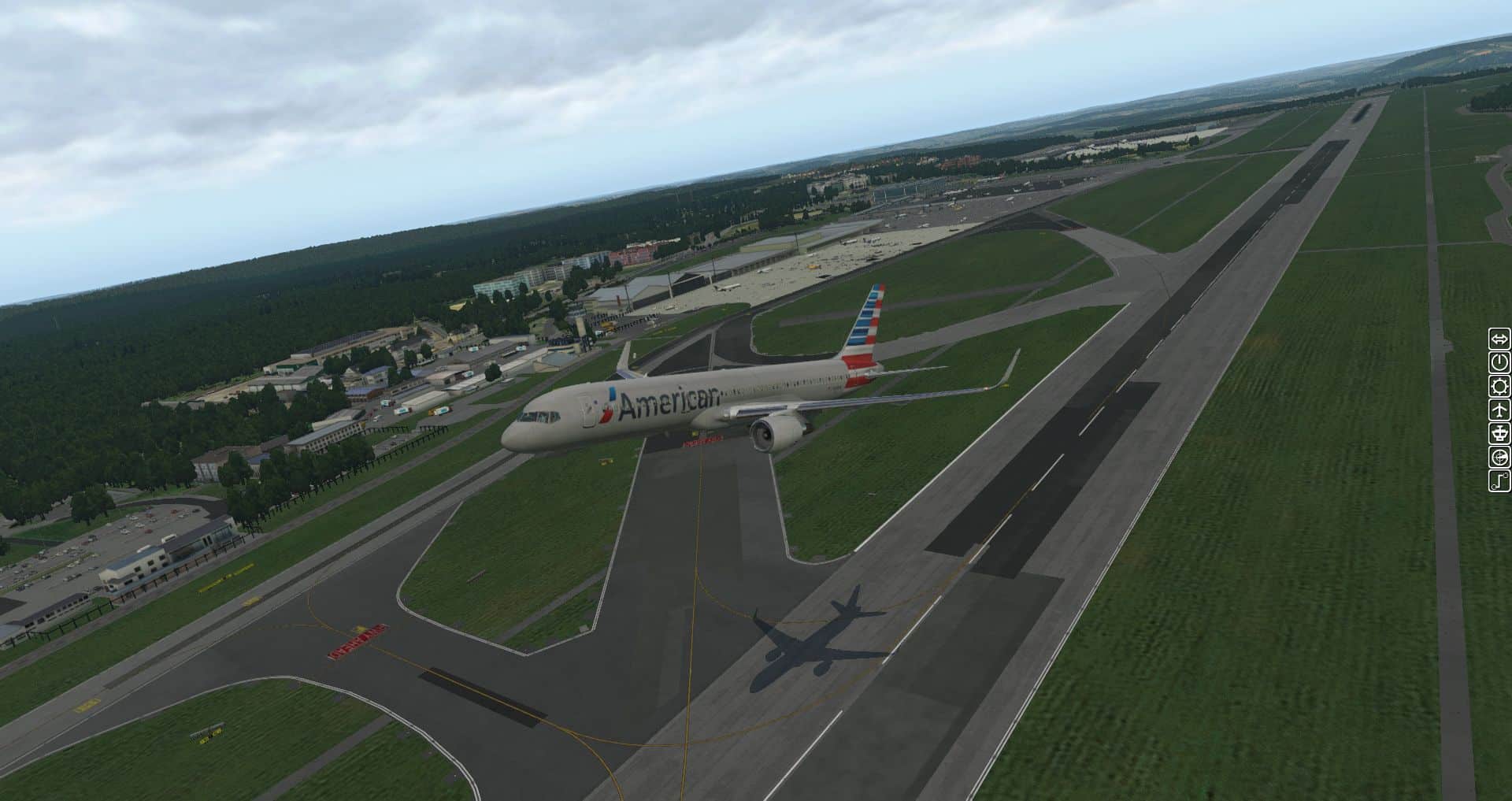 Beim Start mit der 757 erleben wir sowohl die Autogates in Aktion, wie auch die Landebahn und wir bekommen am Ende einen ungefähren Überblick über die gesamte Szenerie. In etwa so groß ist der tatsächlich modellierte Flughafen.