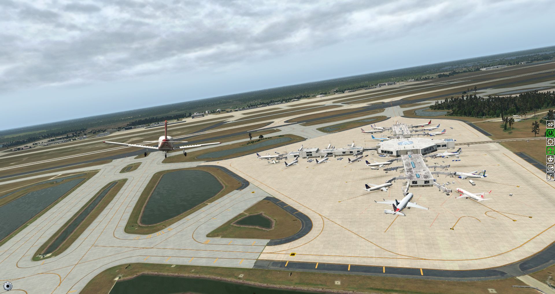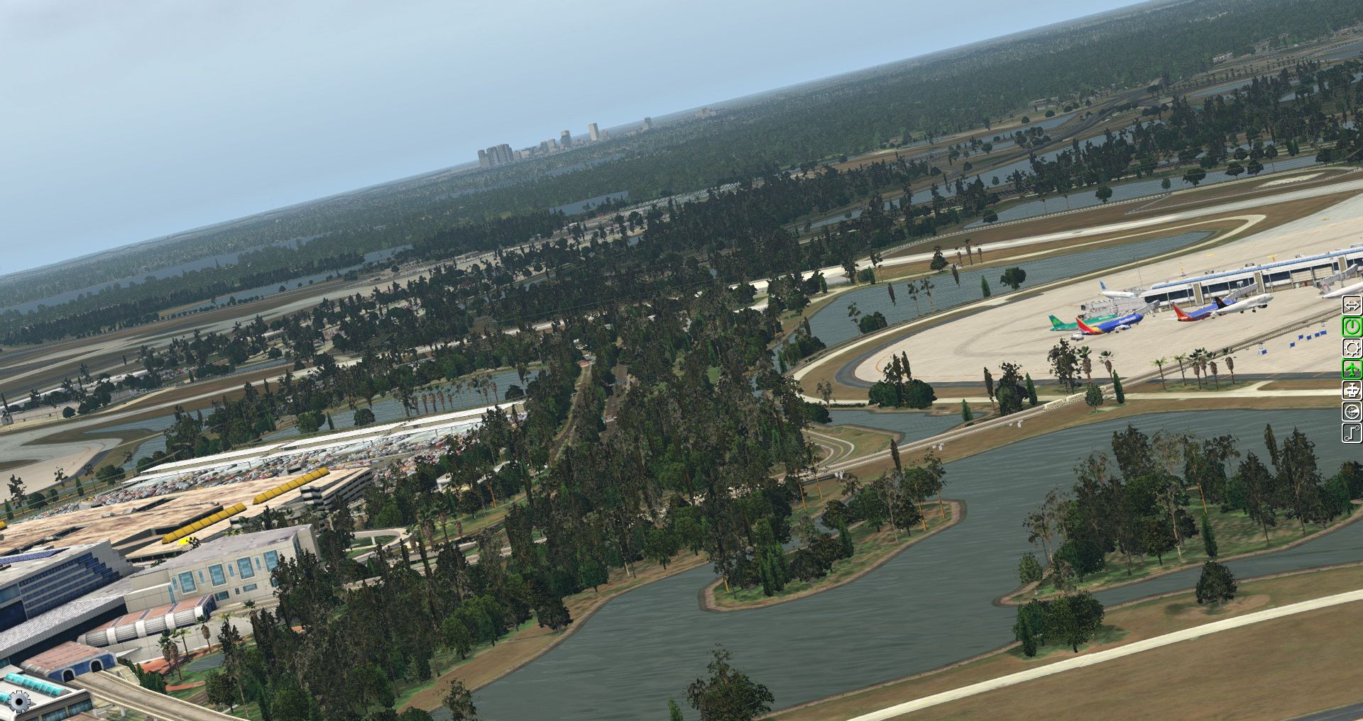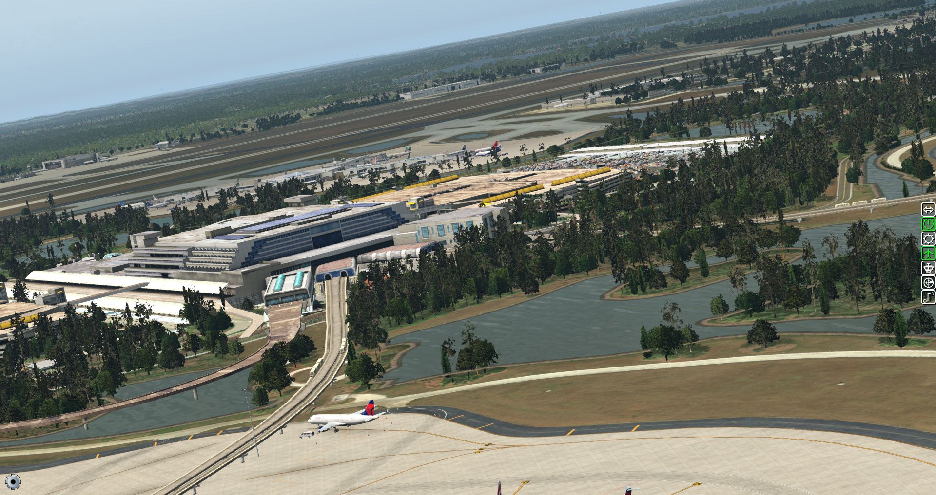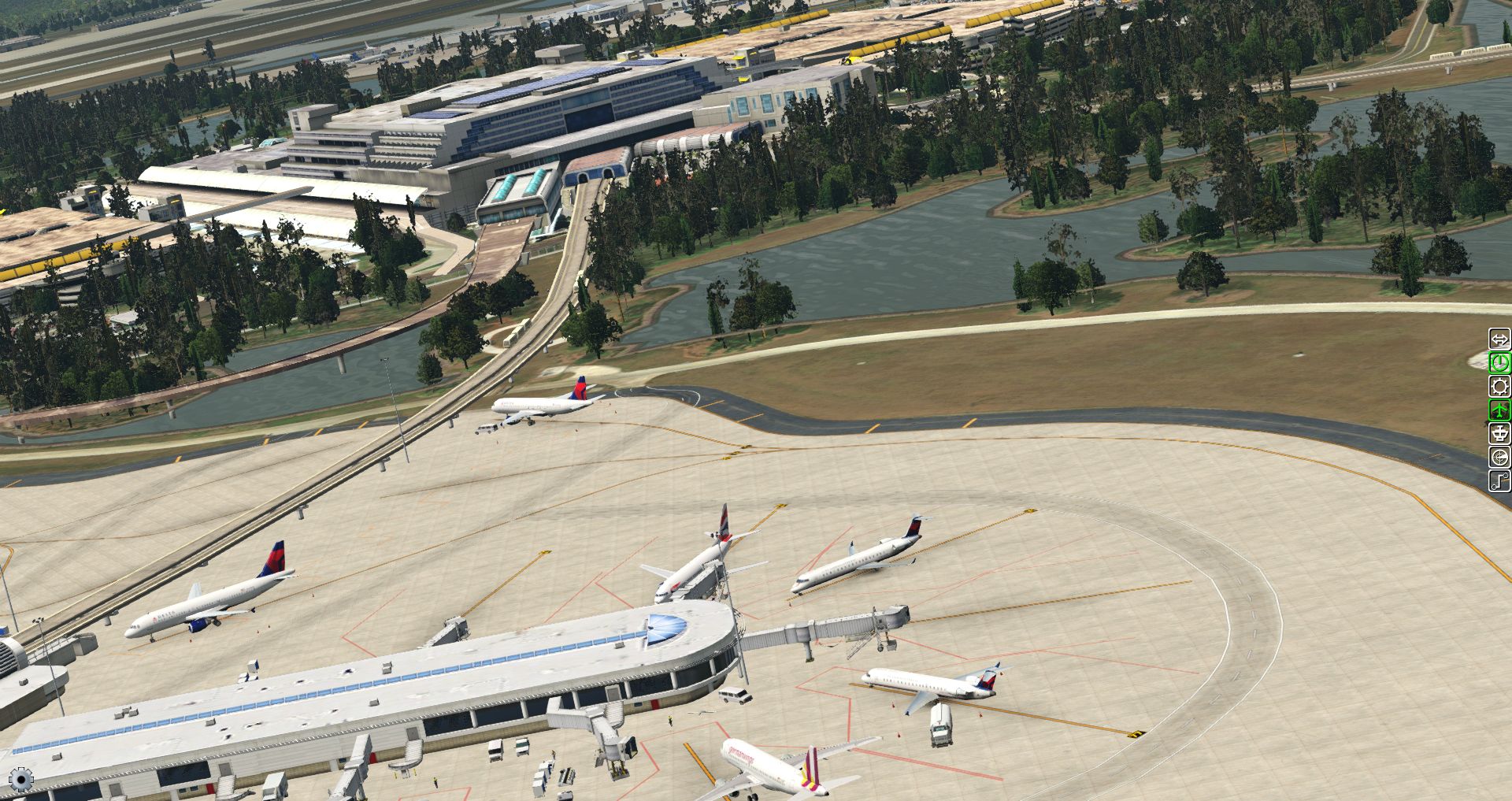 Dabei sind die ganzen Komplexe umgeben vom Bäumen und kleinen Seen, wie auch Grasflächen, wobei teilweise die Flugzeuge auch Brücken zu überqueren haben.
