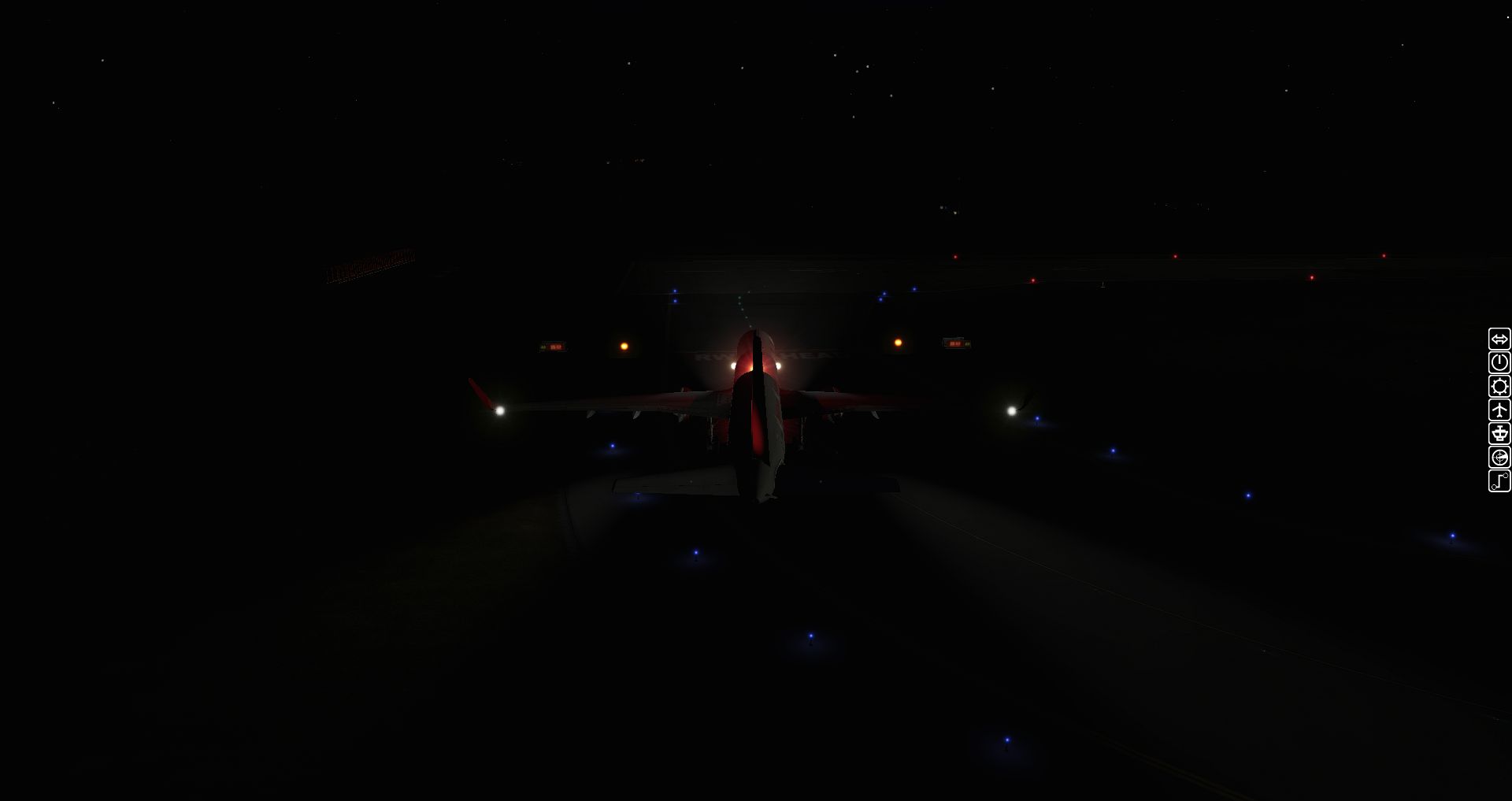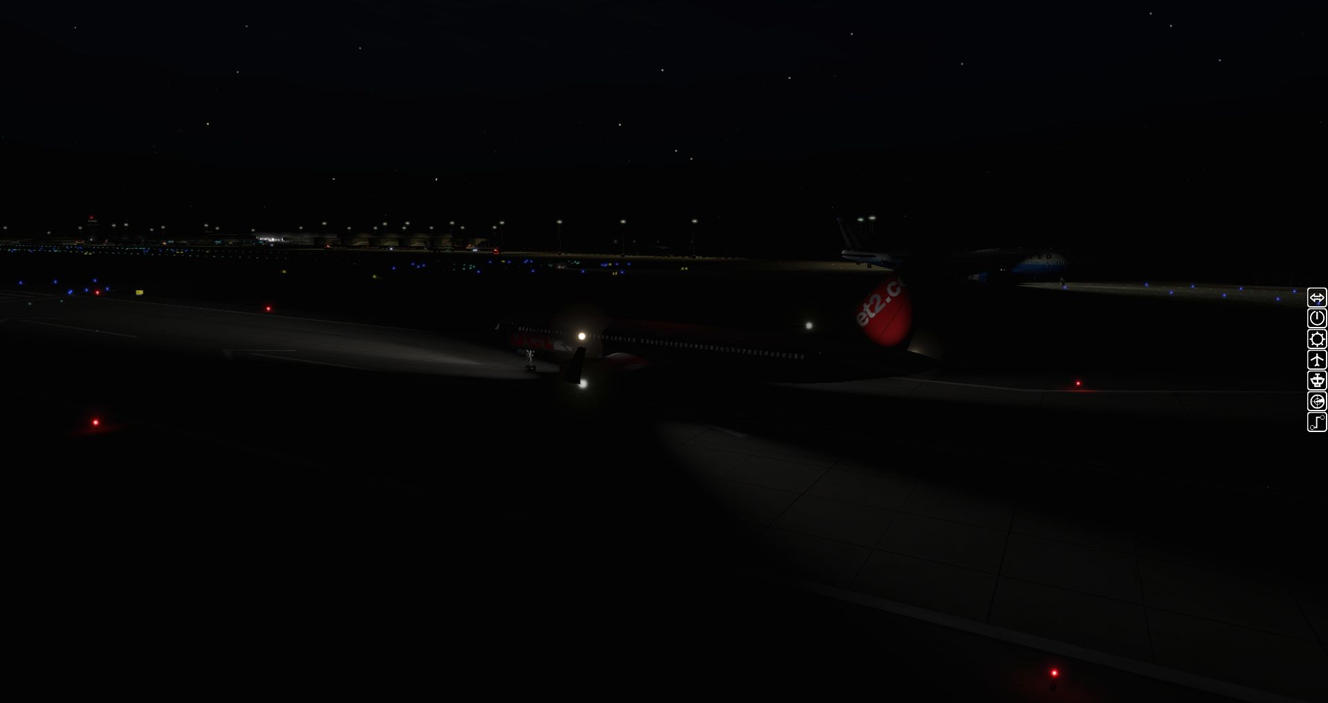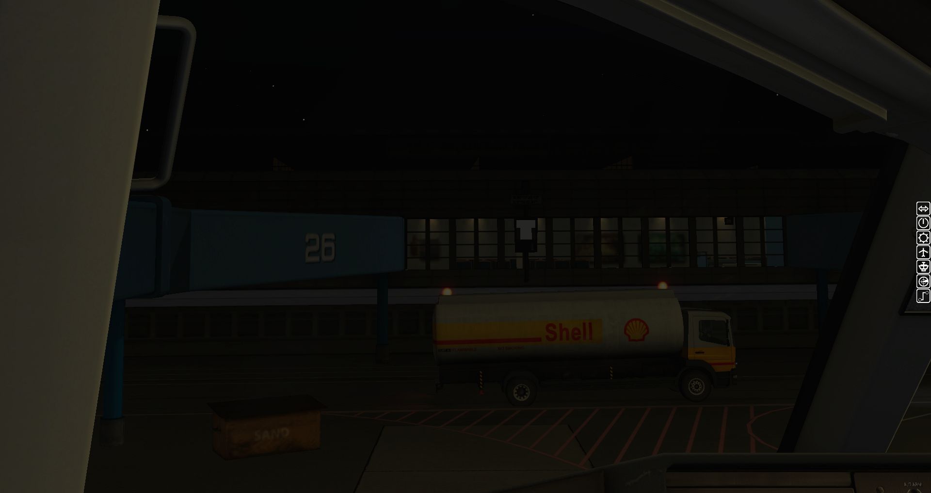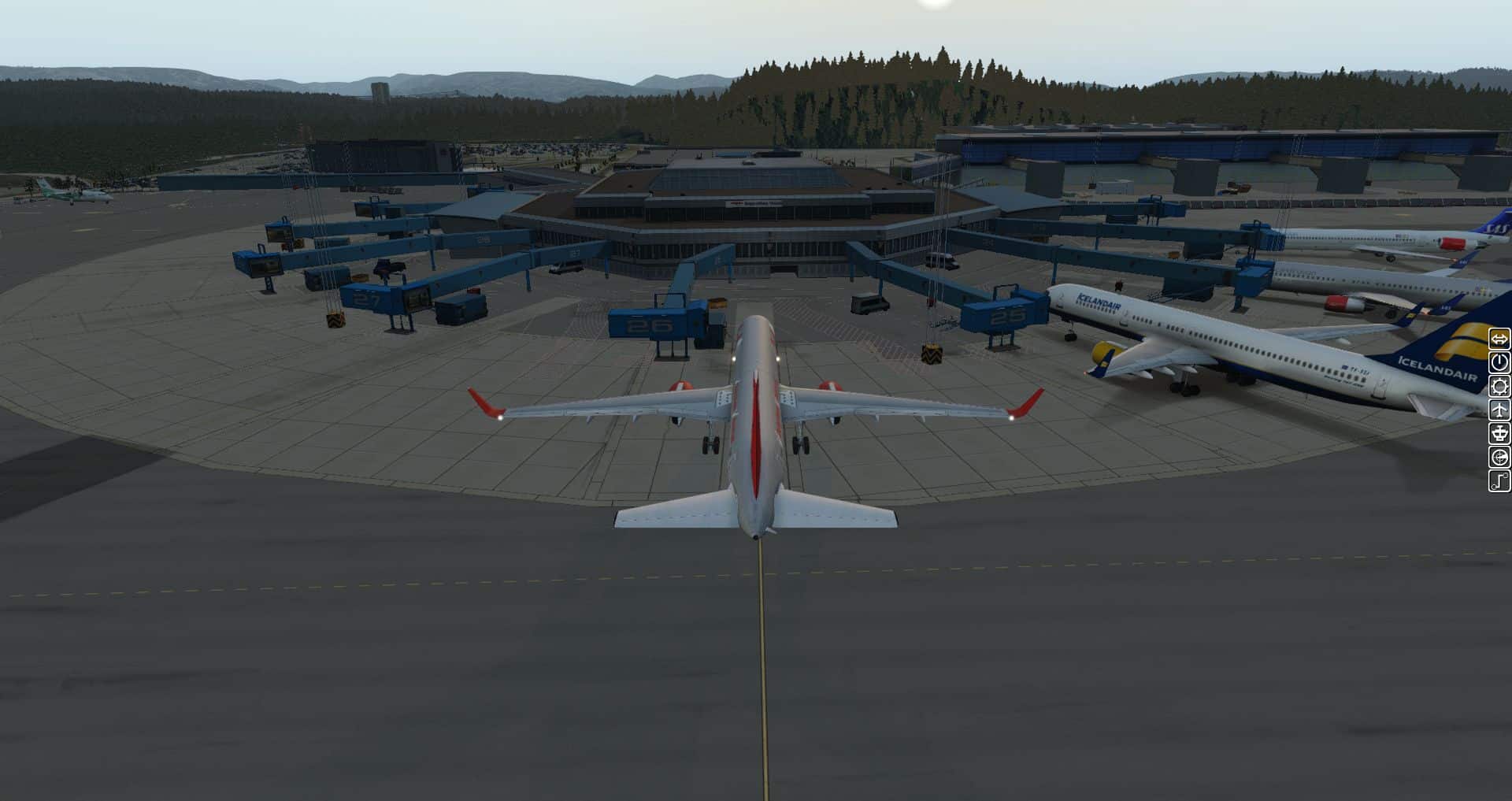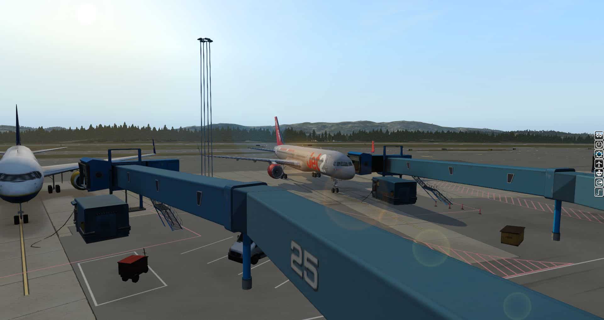 Wie wir sehen, wird die 757 vollkommen korrekt automatisch angedockt. Bei den Gebäuden hat man auf jegliche Spielereien mit Reflektionen verzichtet, stattdessen versucht man sich mittels Nachttexturen bei den Wartehallen durch zu mogeln.