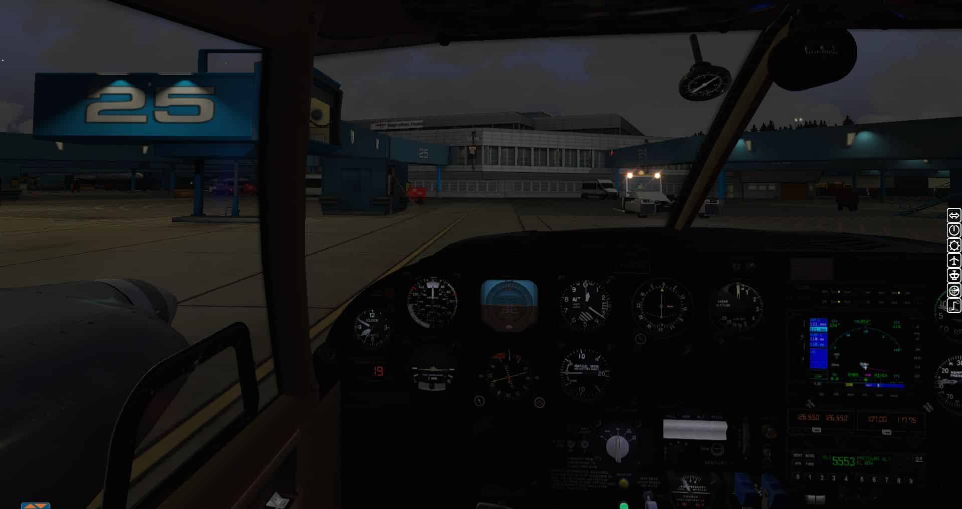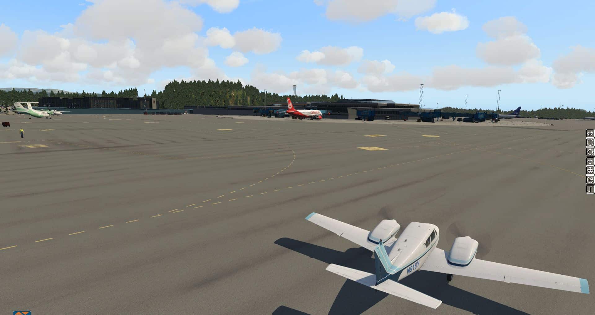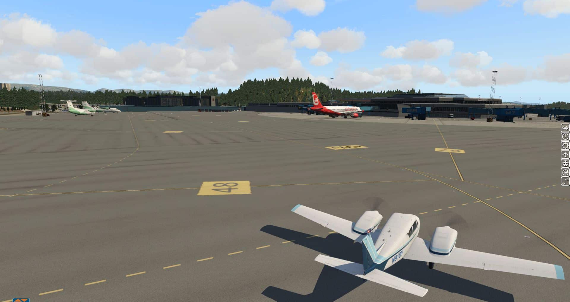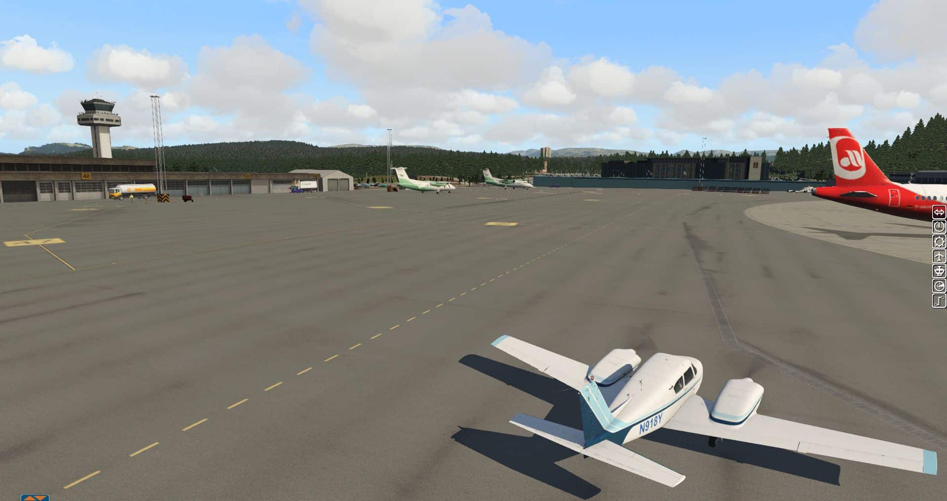 Wenn wir uns ein wenig auf dem Flughafen umsehen, bemerken wir die statischen Flugzeuge, die X-Plane 11 an den Standplätzen aufgebaut hat. Ebenso wie die üblichen Bodenfahrzeugen die ihre Runden fahren. Wie bei Oslo, gibt es auch hier ein Tool mit dem man zwischen lokalen und globalen Bodenfahrzeugen umschalten kann.