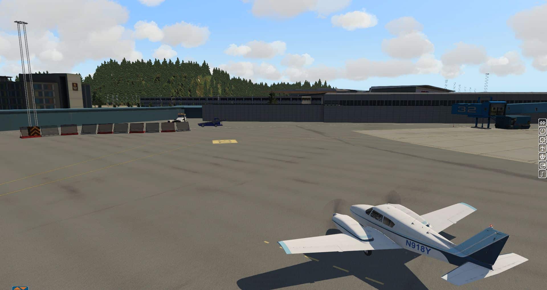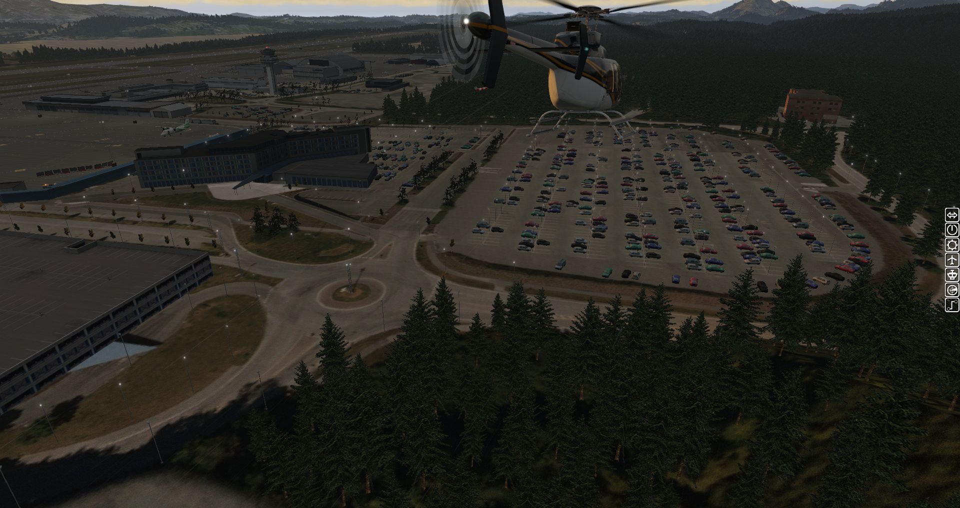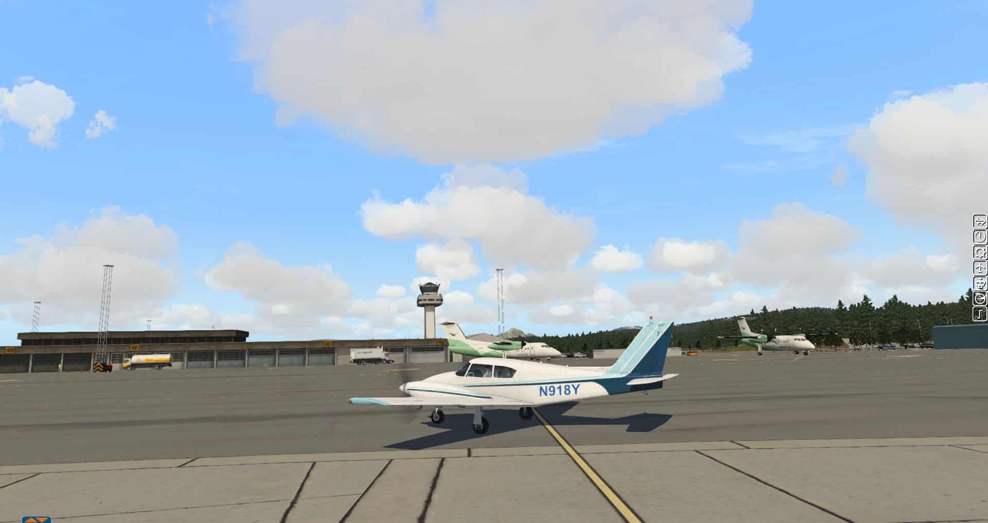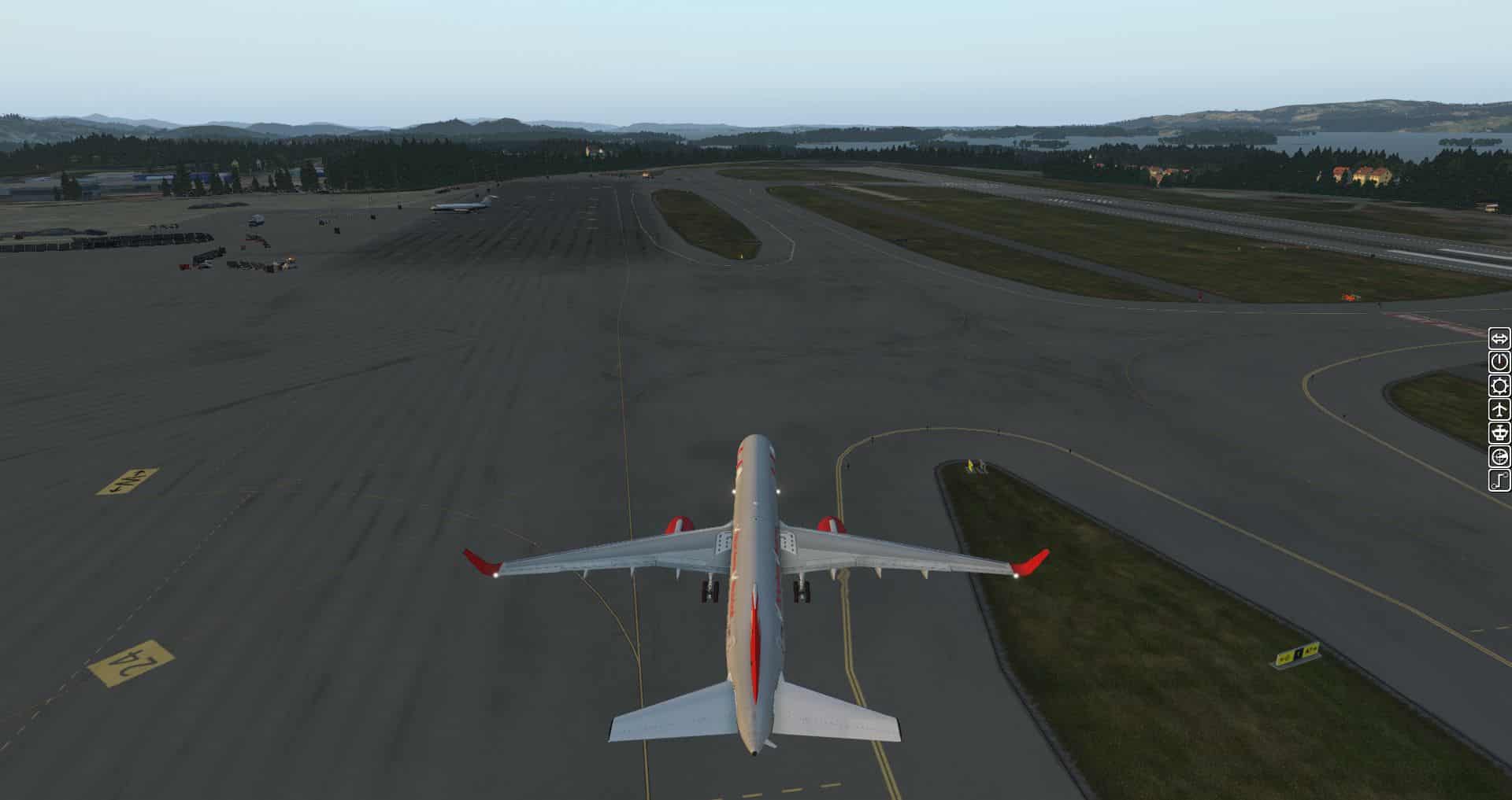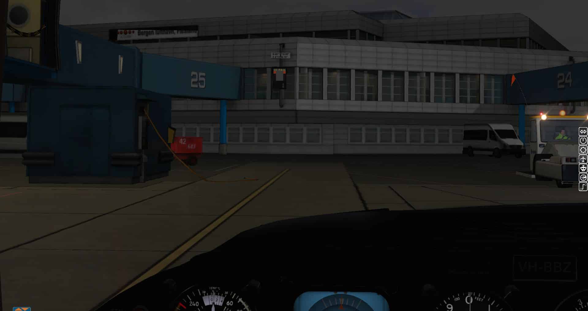 Wenn wir uns ein wenig auf dem Flughafen umsehen, bemerken wir die statischen Flugzeuge, die X-Plane 11 an den Standplätzen aufgebaut hat. Ebenso wie die üblichen Bodenfahrzeugen die ihre Runden fahren. Wie bei Oslo, gibt es auch hier ein Tool mit dem man zwischen lokalen und globalen Bodenfahrzeugen umschalten kann.