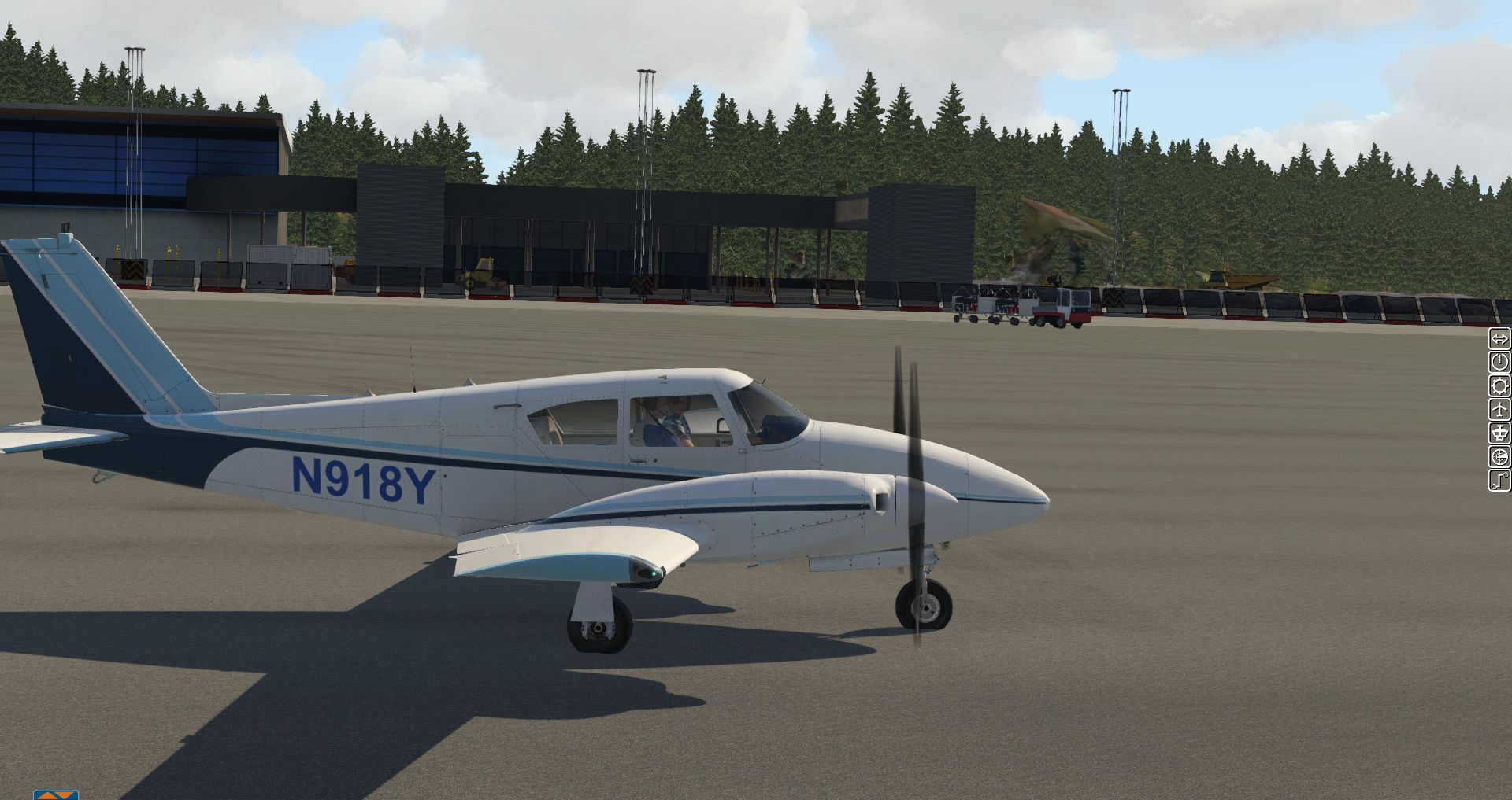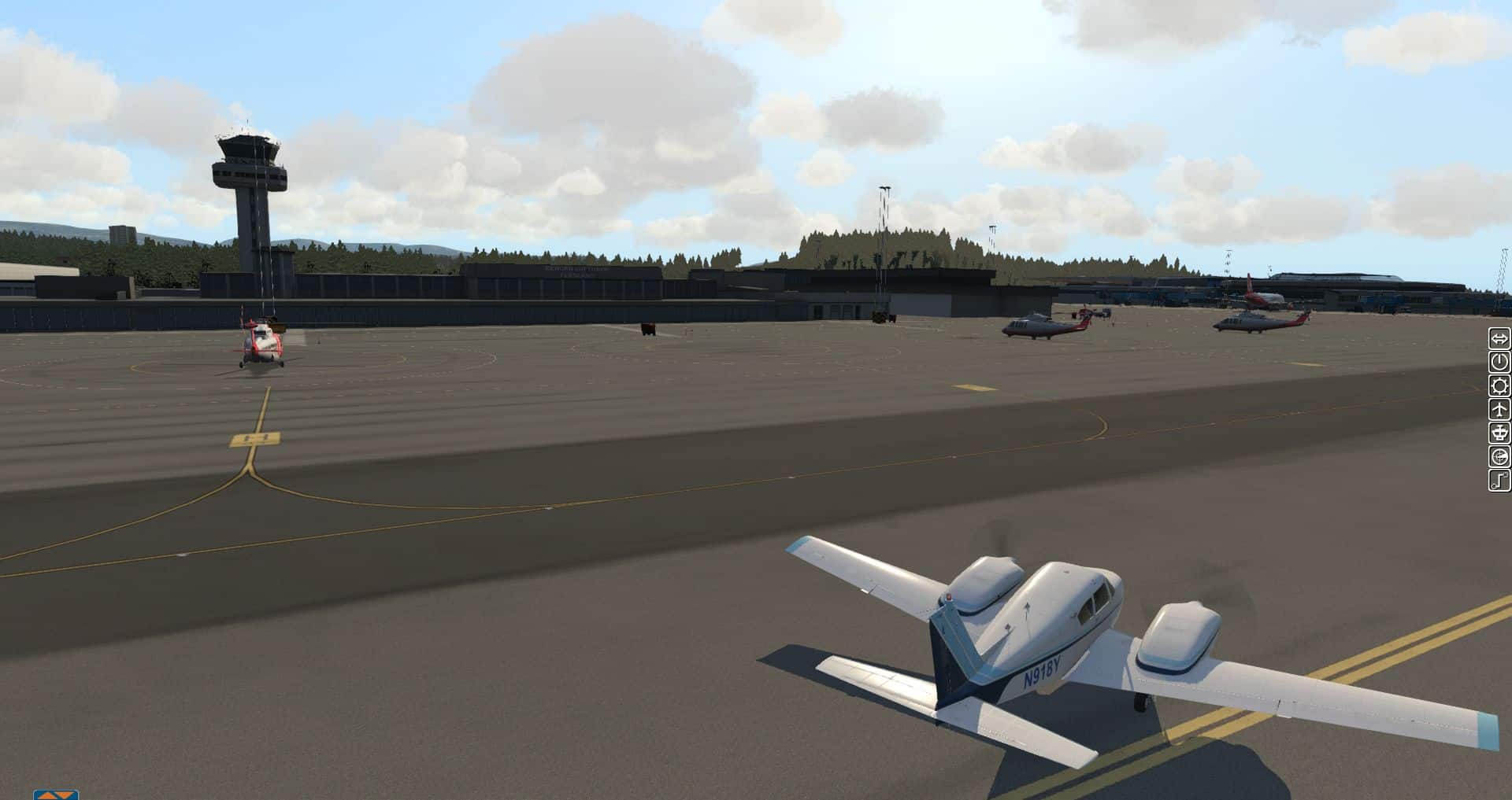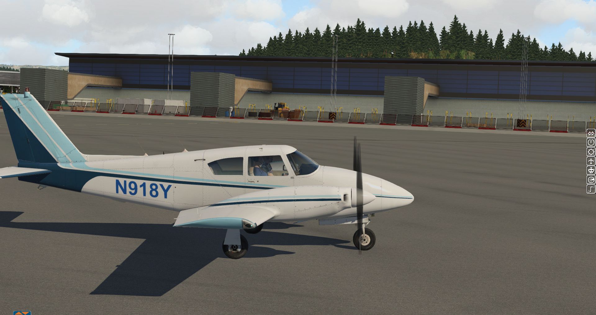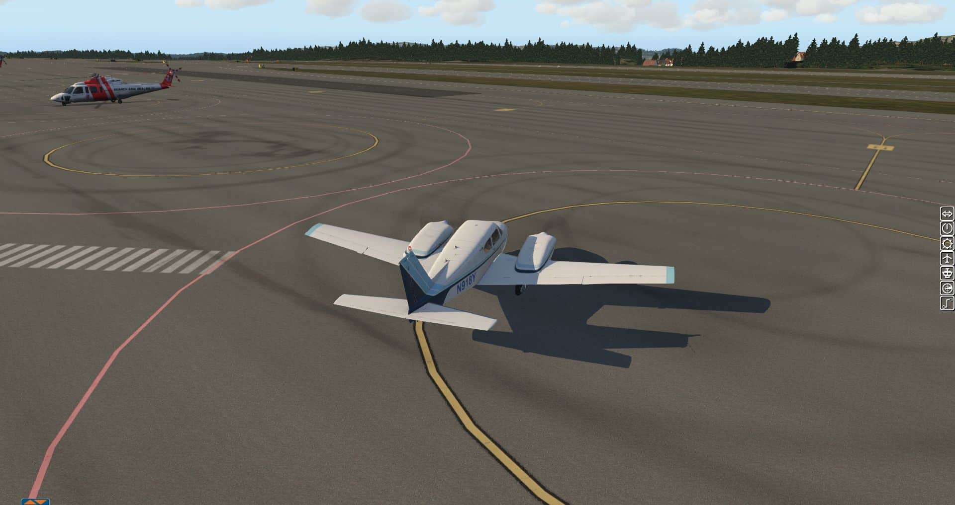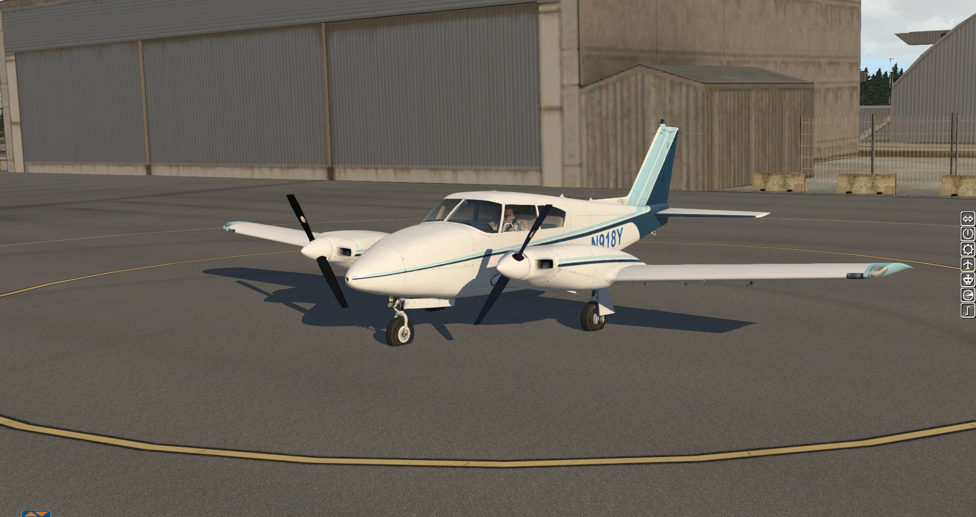 Wir finden uns zuerst auf dem Helikopter Terminal wieder, das primär für die Verbindungen zu den Ölplattformen dient. Der Flughafen macht schon einmal einen recht guten Eindruck. Doch das wirklich auffällige ist die Twin Comanche. Diese ist vFlyteAirs erstes reine X-Plane 11 Flugzeug, nachdem sie, aufgrund der Upgrades ihrer alten Flugzeuge auf PBR-Texturen, schon einiges an Erfahrung sammeln konnten.