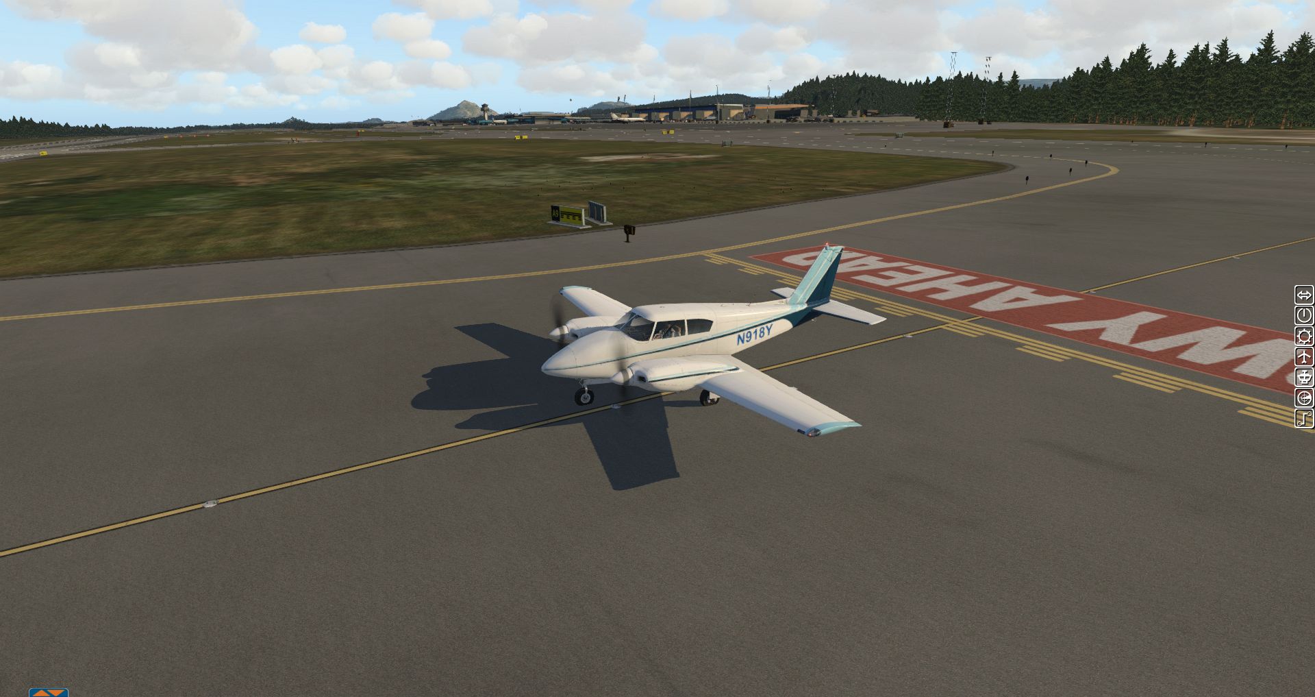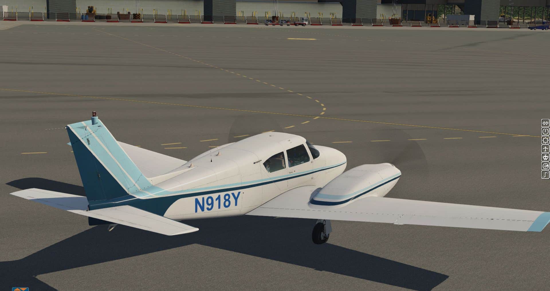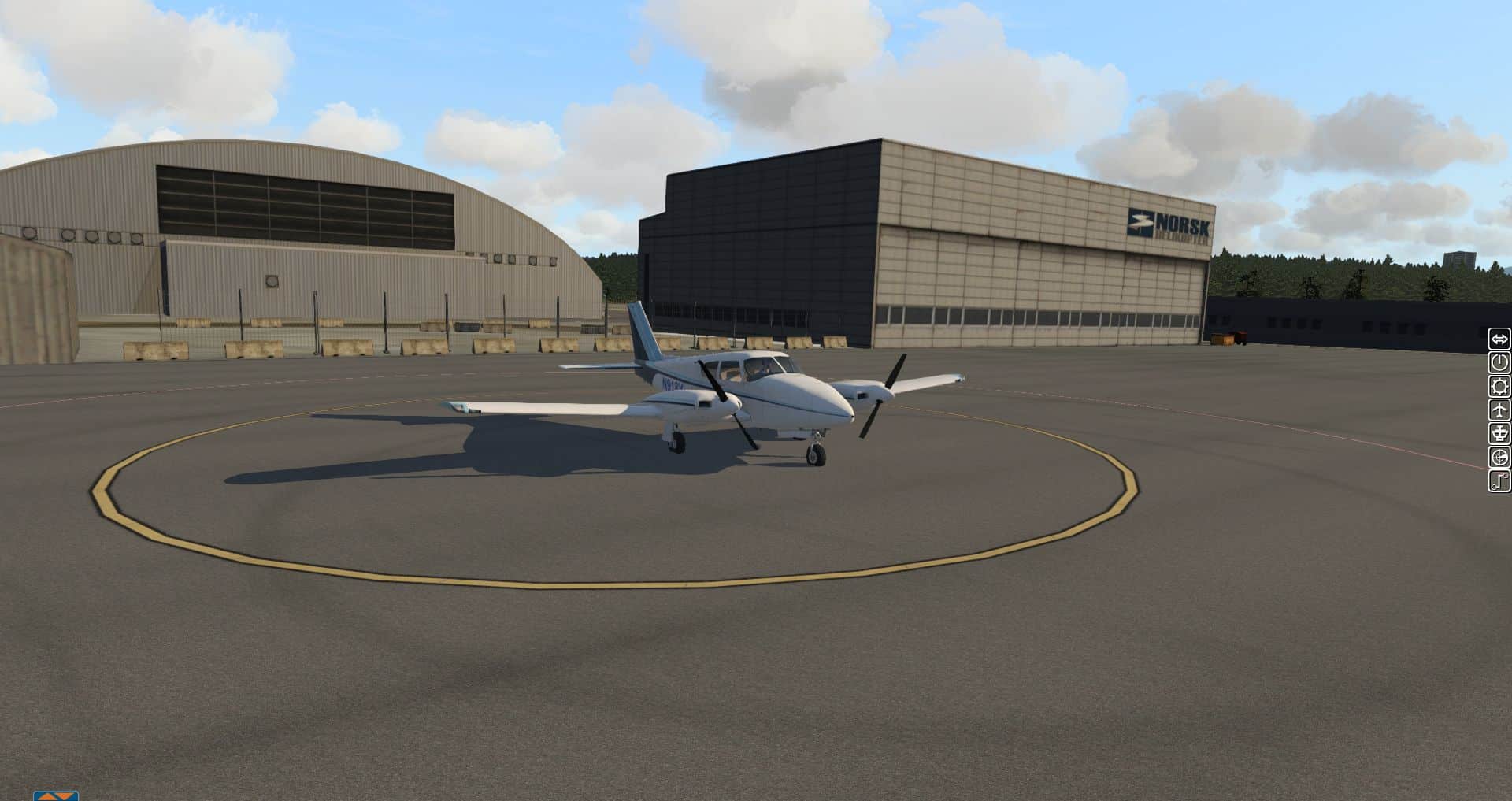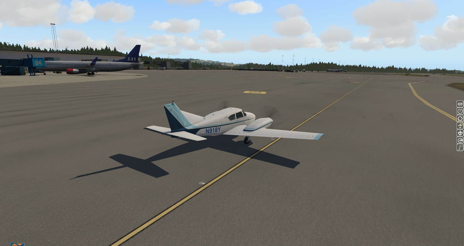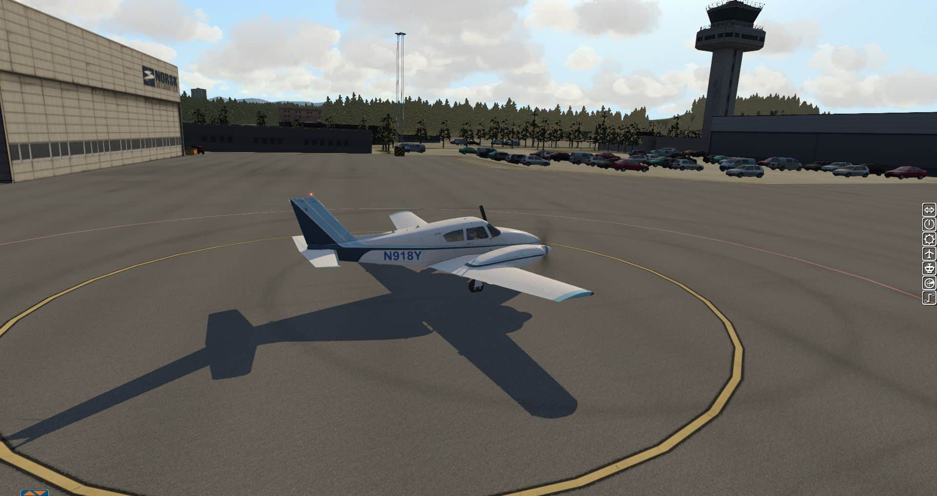 Wir finden uns zuerst auf dem Helikopter Terminal wieder, das primär für die Verbindungen zu den Ölplattformen dient. Der Flughafen macht schon einmal einen recht guten Eindruck. Doch das wirklich auffällige ist die Twin Comanche. Diese ist vFlyteAirs erstes reine X-Plane 11 Flugzeug, nachdem sie, aufgrund der Upgrades ihrer alten Flugzeuge auf PBR-Texturen, schon einiges an Erfahrung sammeln konnten.