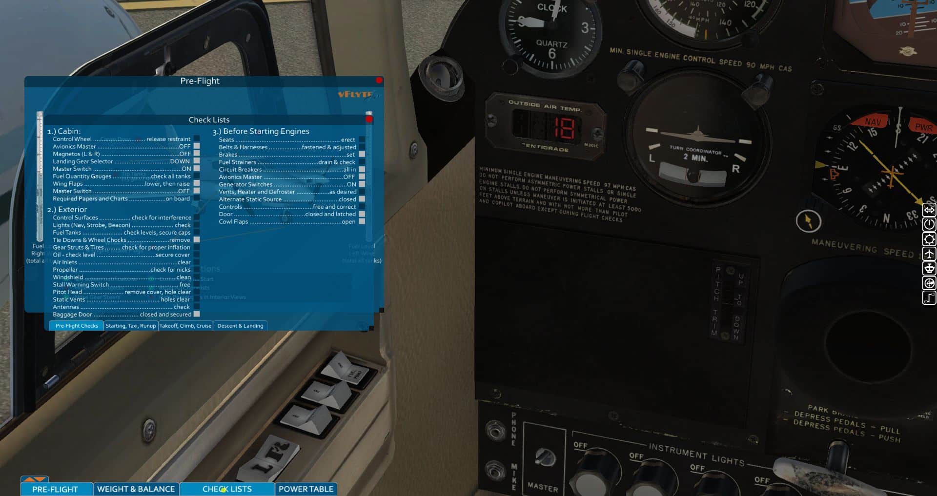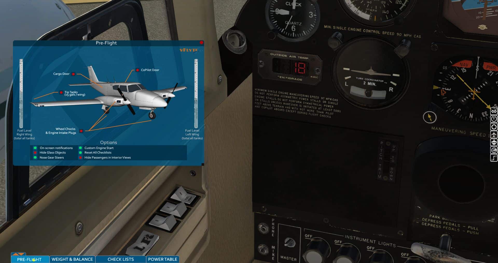 Sehr vieles ist auch unter der Oberfläche passiert. So kann die Twin Comanche mit einer eigenen Starterlogik genutzt werden, die auch auf Temperaturen Rücksicht nimmt. Dabei wird jeder Zylinderkopf einzeln betrachtet und man kann sich auch die Temperatur jedes einzelnen Zylinderkopfs ansehen. Auch die Treibstofflogik wird inzwischen per Custom Logik überwacht, so dass einem Piloten der Treibstoff ausgehen kann, wenn der selektierte, von bis zu 6 Tanks, keinen Sprit mehr hat.