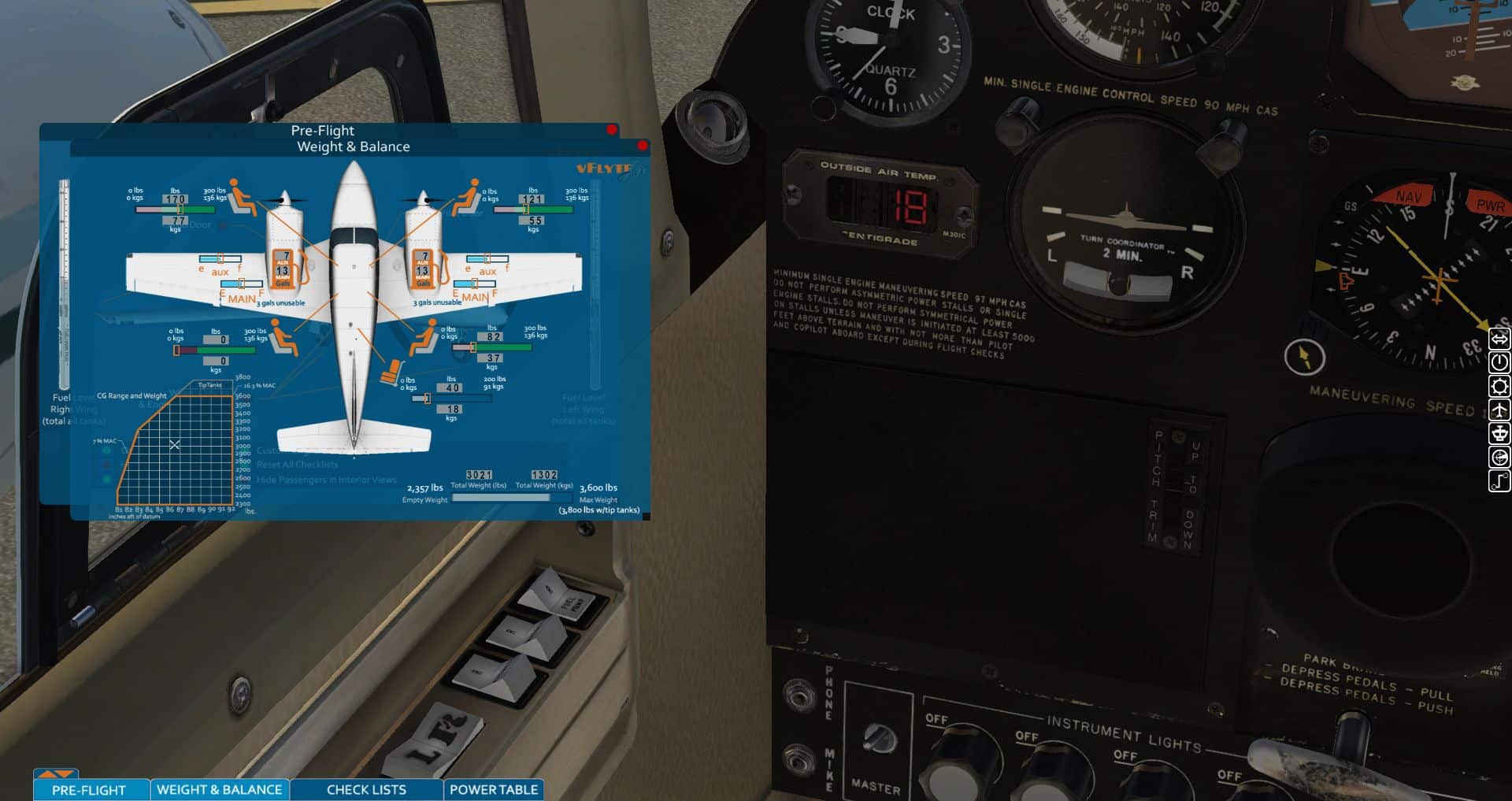 Die grafisch dargestellte Gewichtsverteilung wirkt sich nicht nur auf das Flugmodell aus, sondern es werden auch entsprechende Passagiere dargestellt, deren Aussehen jedoch sehr gemischt ist. Und diese kann man auf Wunsch nur von außen oder auch innerhalb des Cockpits sehen. Außerdem hat man in die neuen Menüs die Checklists, wie auch die Performance Tables integriert, womit man die Triebwerke in effizienten Bereichen halten kann.