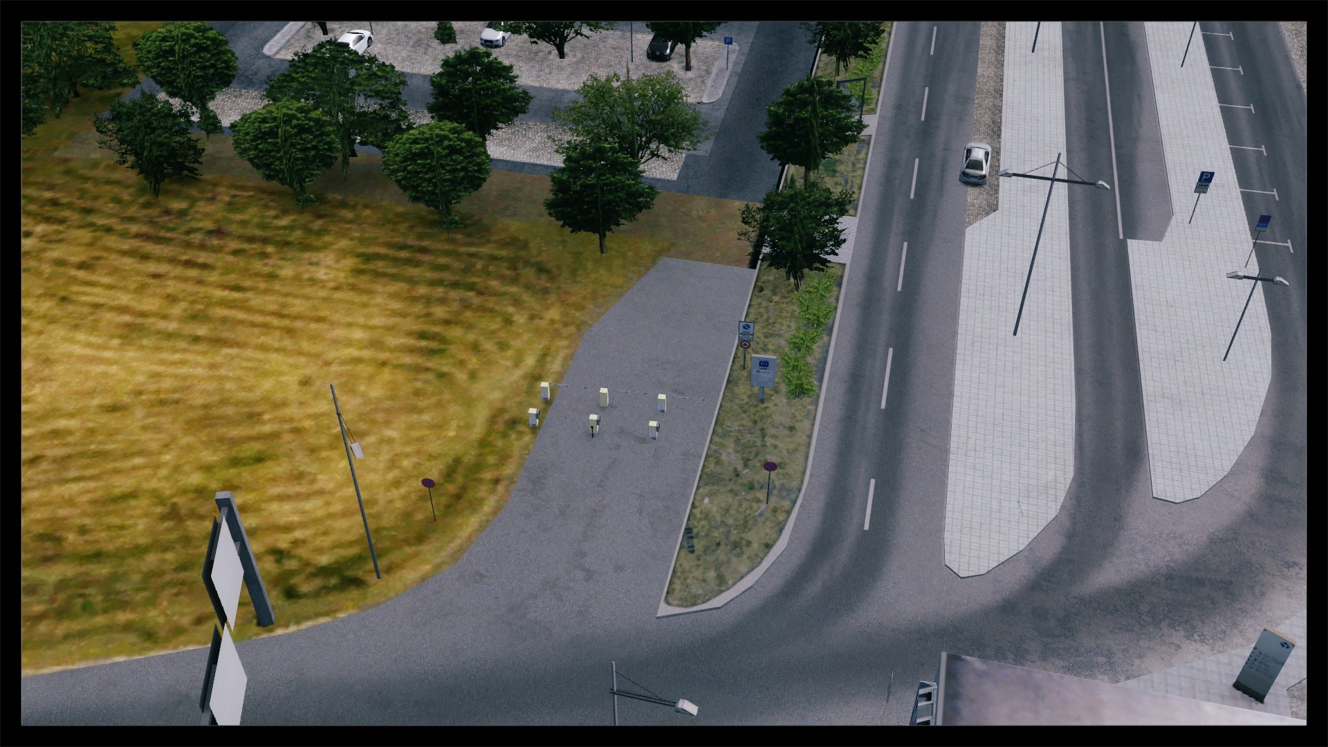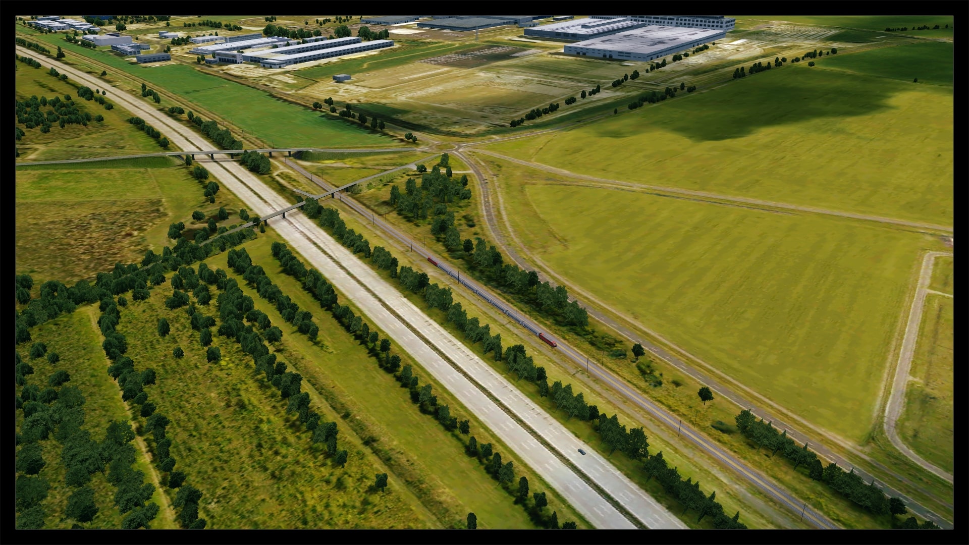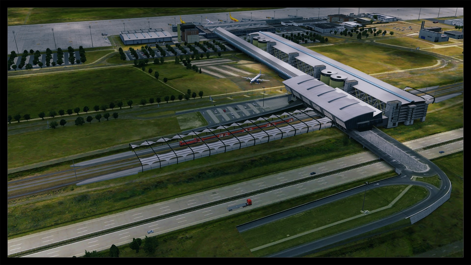 Eine Detailstufe niedriger, zumindest im Bereich Detaillierung mit Objekten und Straßentexturen, erfolgte dann die Umsetzung des Parkhaus- und Bahnhofsbereiches, wobei hier auch Laternen, Oberleitungsmasten und parkende Fahrzeuge zu finden sind. Schön anzusehen ist auch der dynamische Autobahn- und Schienenverkehr.