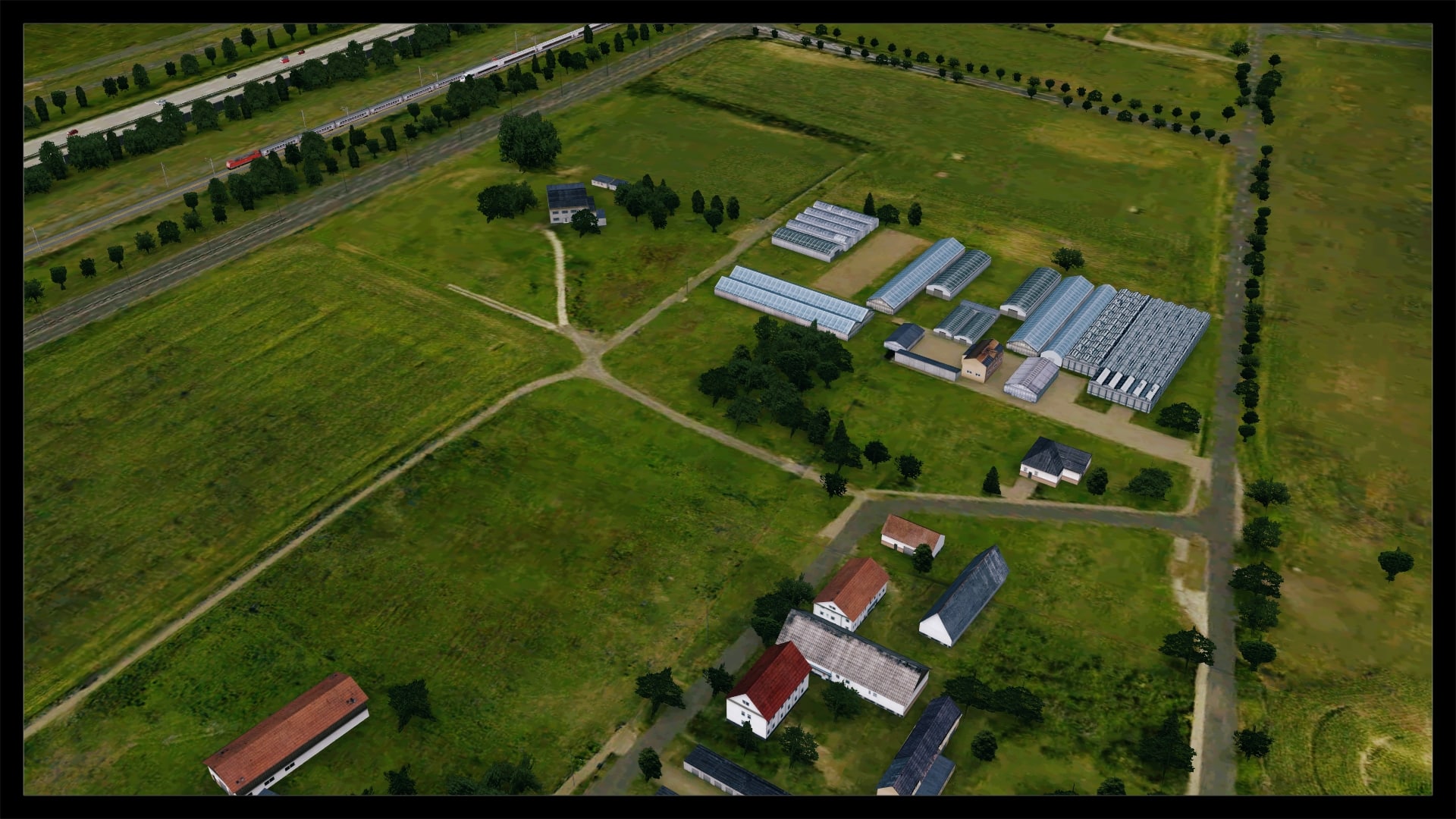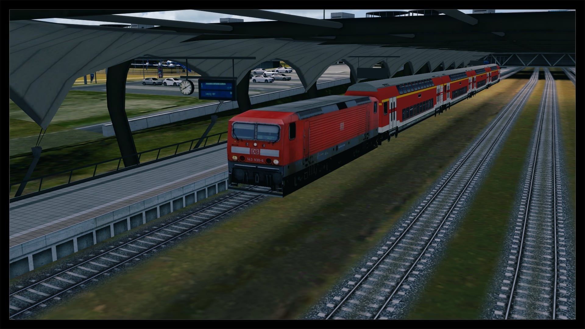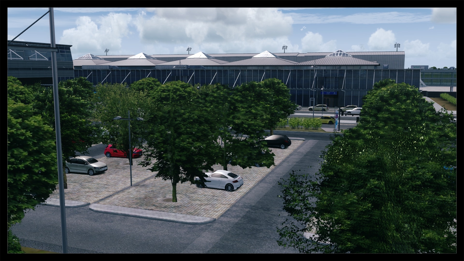 Eine Detailstufe niedriger, zumindest im Bereich Detaillierung mit Objekten und Straßentexturen, erfolgte dann die Umsetzung des Parkhaus- und Bahnhofsbereiches, wobei hier auch Laternen, Oberleitungsmasten und parkende Fahrzeuge zu finden sind. Schön anzusehen ist auch der dynamische Autobahn- und Schienenverkehr.