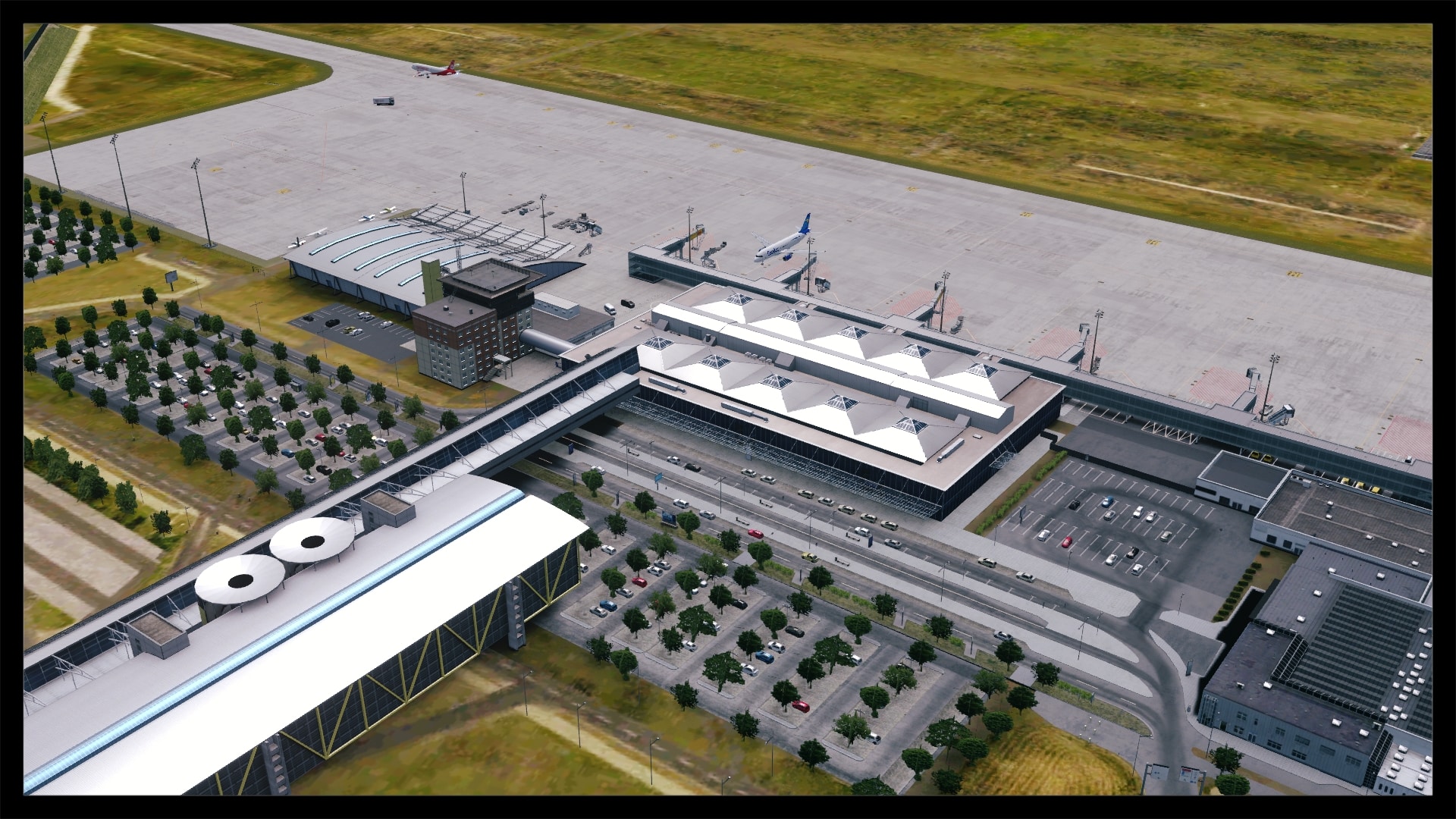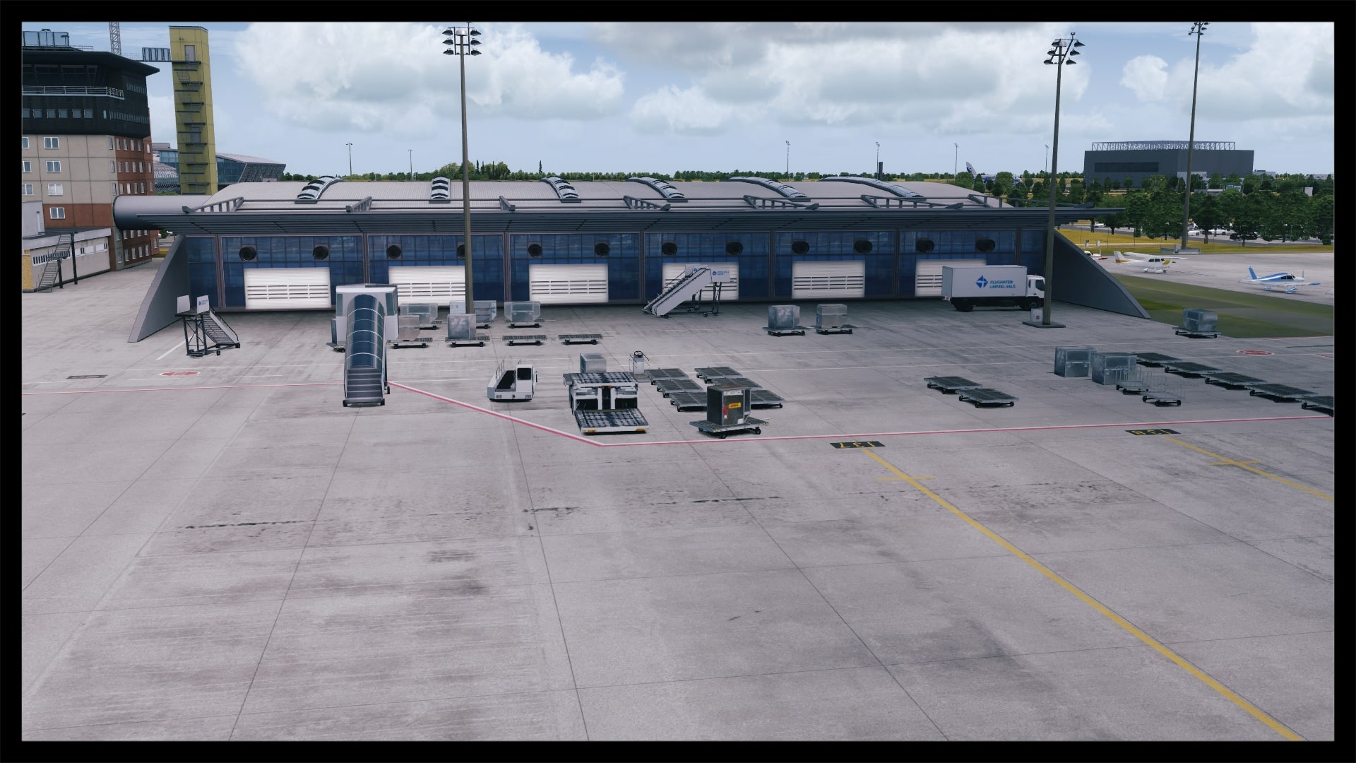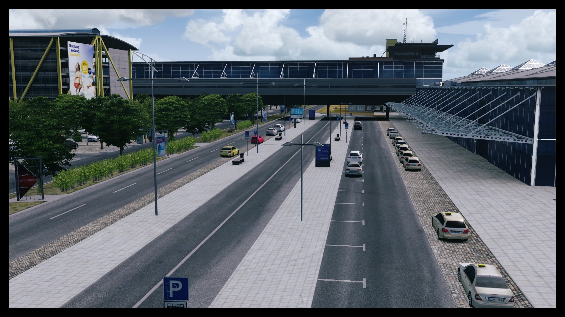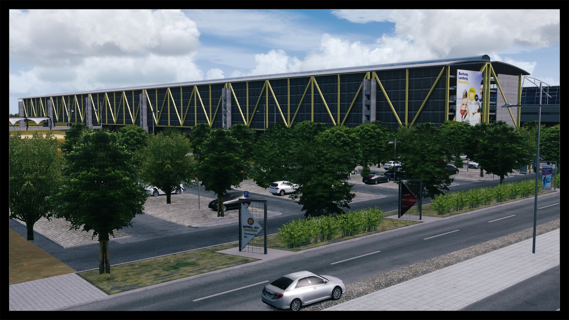 Oftmals, und zum Teil auch berechtigt, wird die Landseite von Addon Flughäfen vernachlässigt – nicht so bei Leipzig. Sicher, Leipzig hat mit dem ausladenden Parkhaus und dem angrenzenden Bahnhof auch eine besondere Infrastruktur, bei der eine ordentliche Umsetzung fast zwingend ist, um eine solide Szenerie zu kreieren. Dies ist Digital Design auch ohne Abstriche gelungen. Die direkte Zufahrt zum Terminal glänzt mit eigenen Straßentexturen inkl. Abnutzungsspuren, Werbetafeln, parkende Fahrzeuge und einer ausgewogenen Beschilderung.