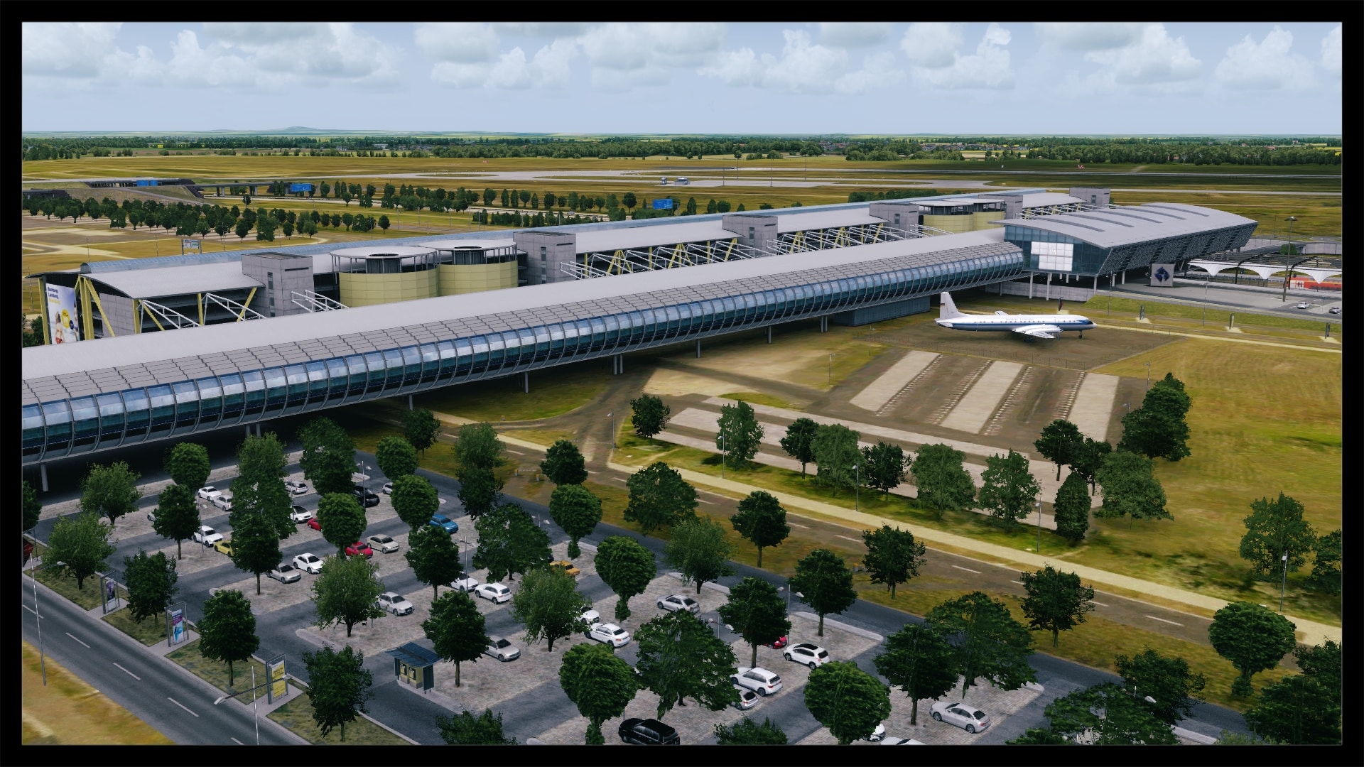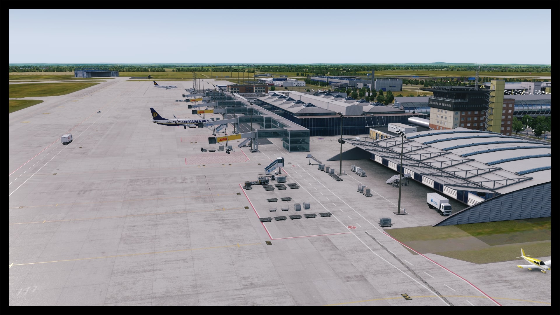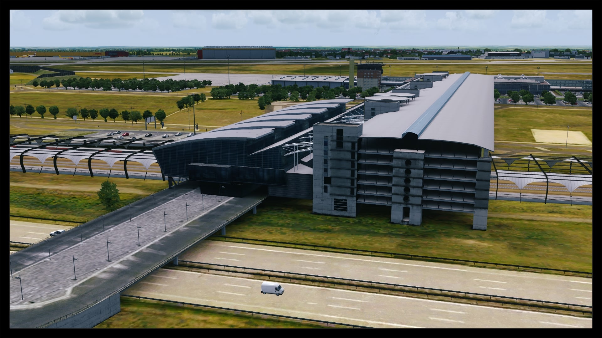 Oftmals, und zum Teil auch berechtigt, wird die Landseite von Addon Flughäfen vernachlässigt – nicht so bei Leipzig. Sicher, Leipzig hat mit dem ausladenden Parkhaus und dem angrenzenden Bahnhof auch eine besondere Infrastruktur, bei der eine ordentliche Umsetzung fast zwingend ist, um eine solide Szenerie zu kreieren. Dies ist Digital Design auch ohne Abstriche gelungen. Die direkte Zufahrt zum Terminal glänzt mit eigenen Straßentexturen inkl. Abnutzungsspuren, Werbetafeln, parkende Fahrzeuge und einer ausgewogenen Beschilderung.