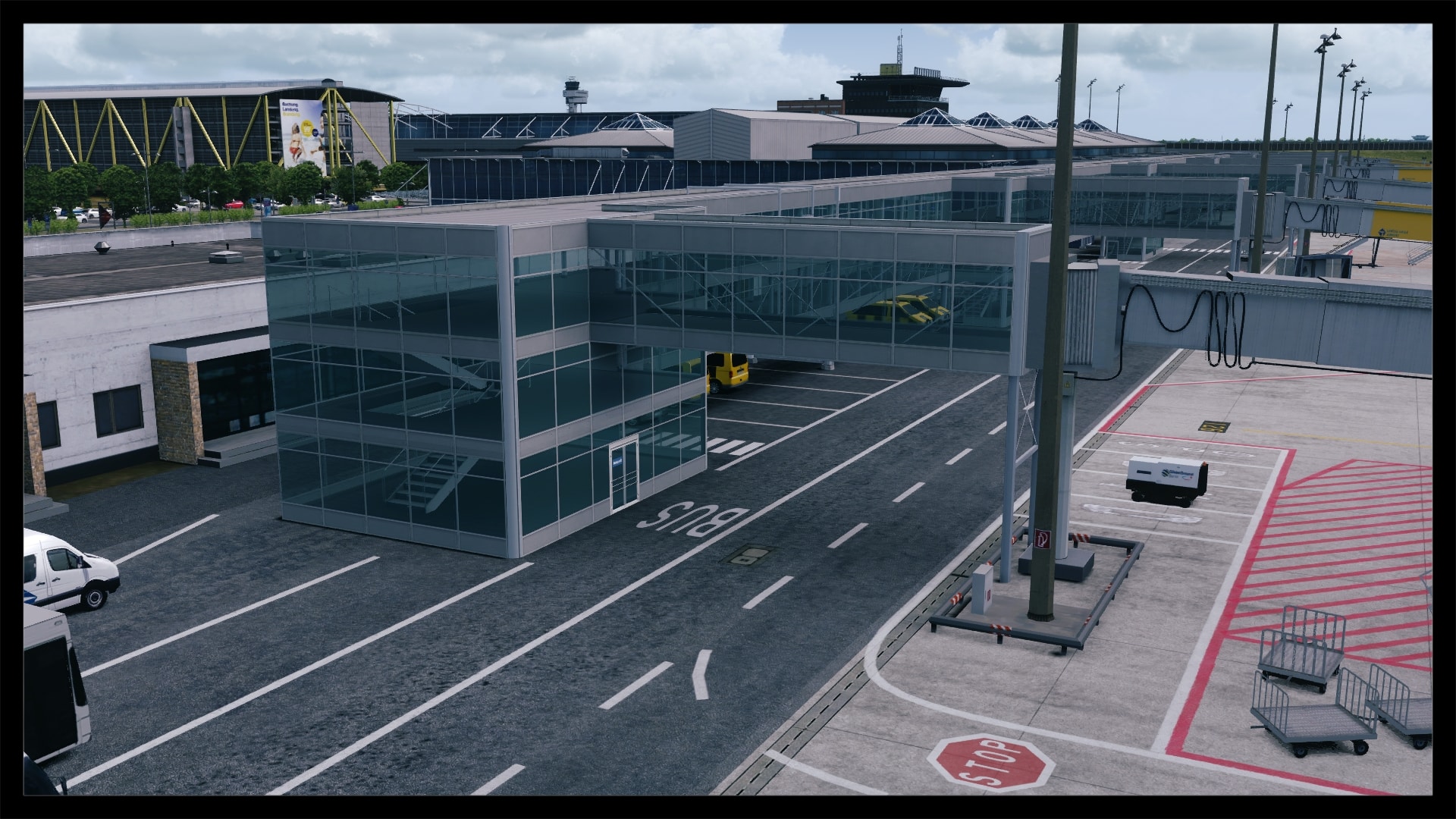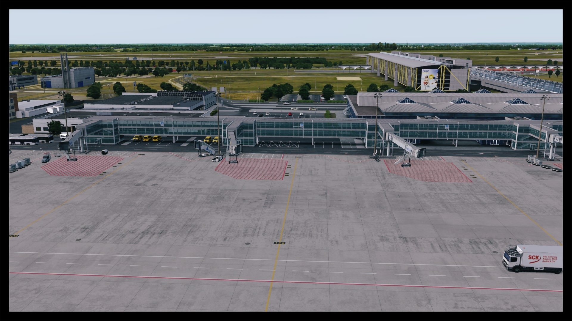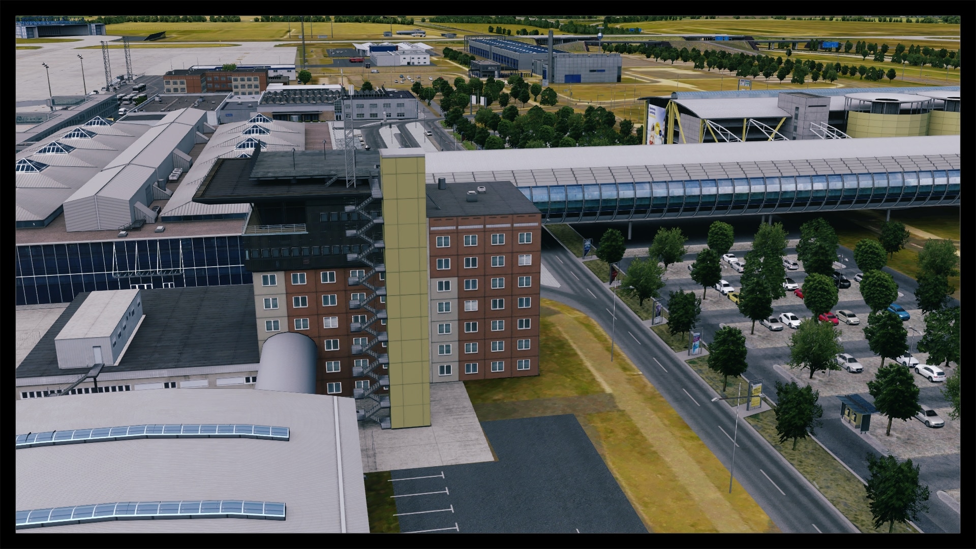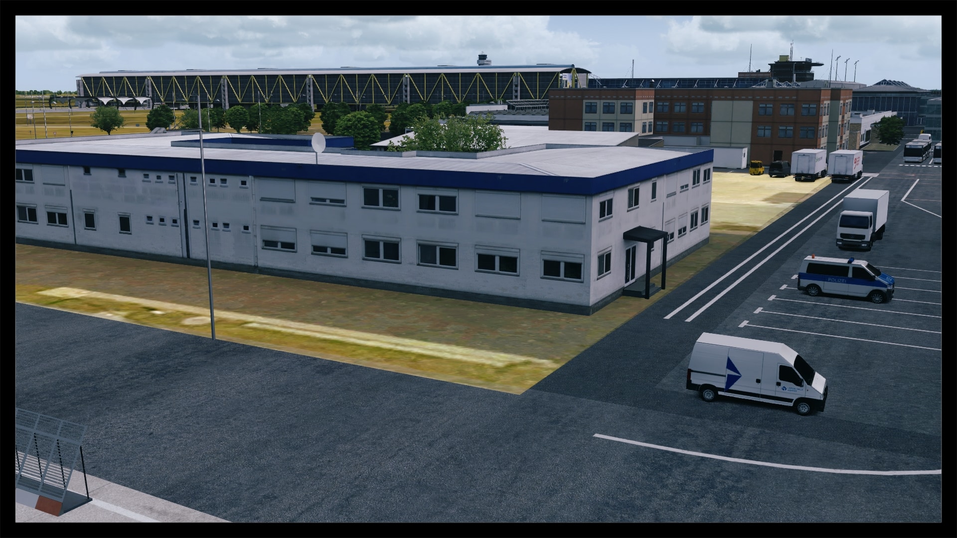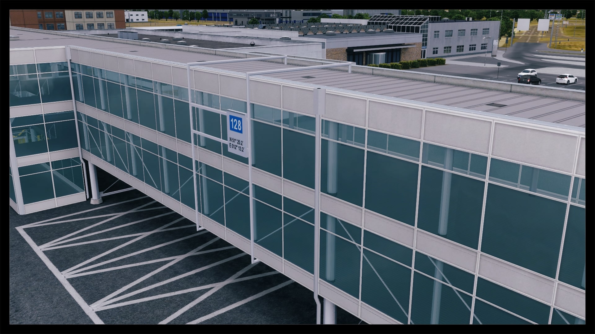 Jedoch fällt auch auf, dass kein Docking Guidance System umgesetzt wurde. Nach Abgleich mit Google Earth und einem YouTube Video existiert in der Realität jedoch eines. Ansonsten ist das Gebäude gut modelliert, hat Detaillierungen in Form von Klimaanlagen, Belüftungseinrichtungen und Geländern. Die Texturierung entspricht dem Original, ist unaufgeregt und sauber. Dies gilt auch für die Gebäude und Objekte in unmittelbarer Umgebung.