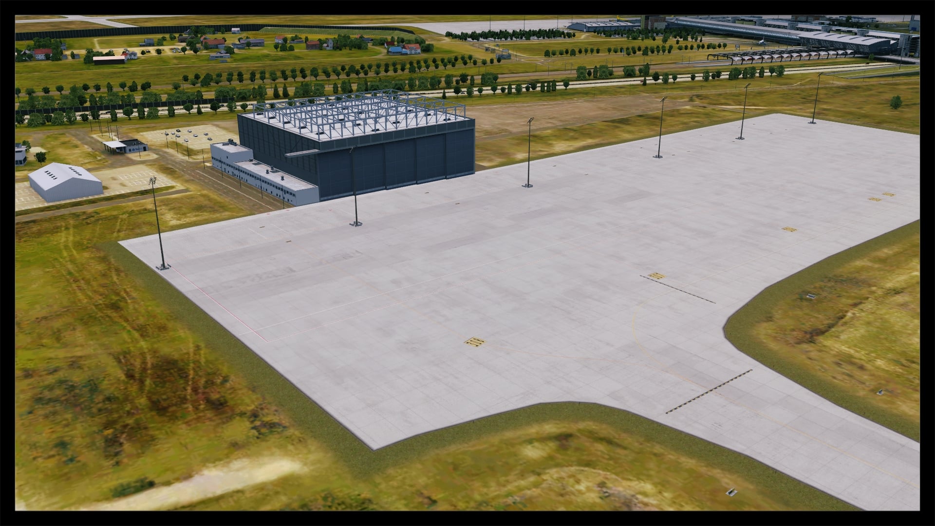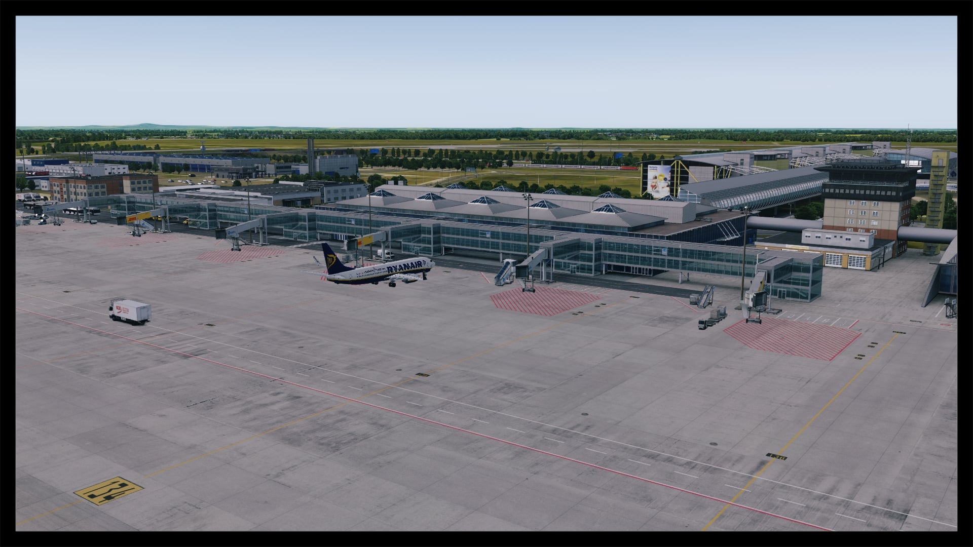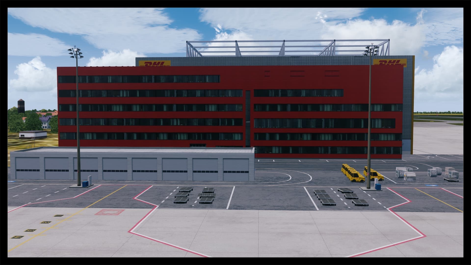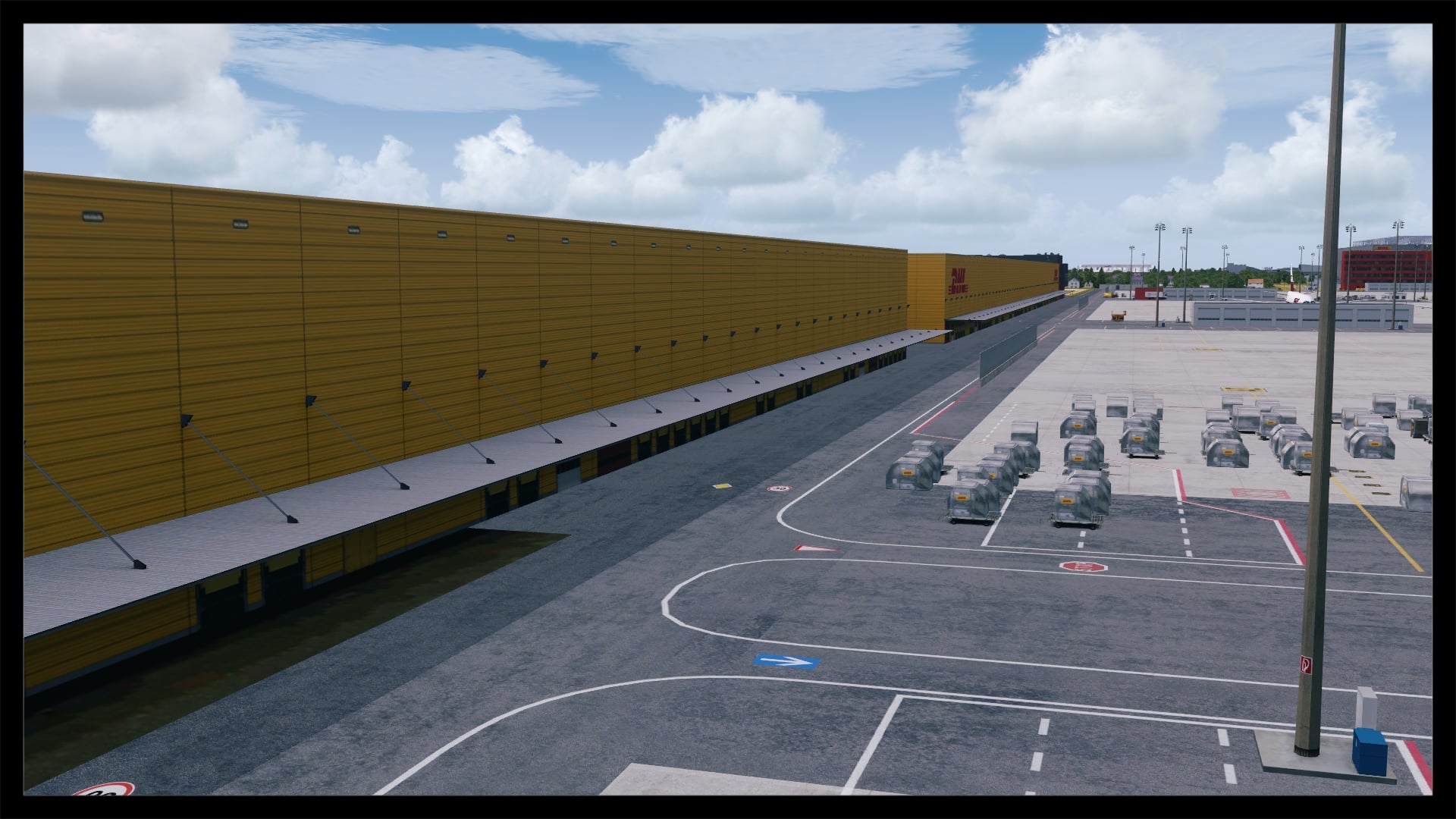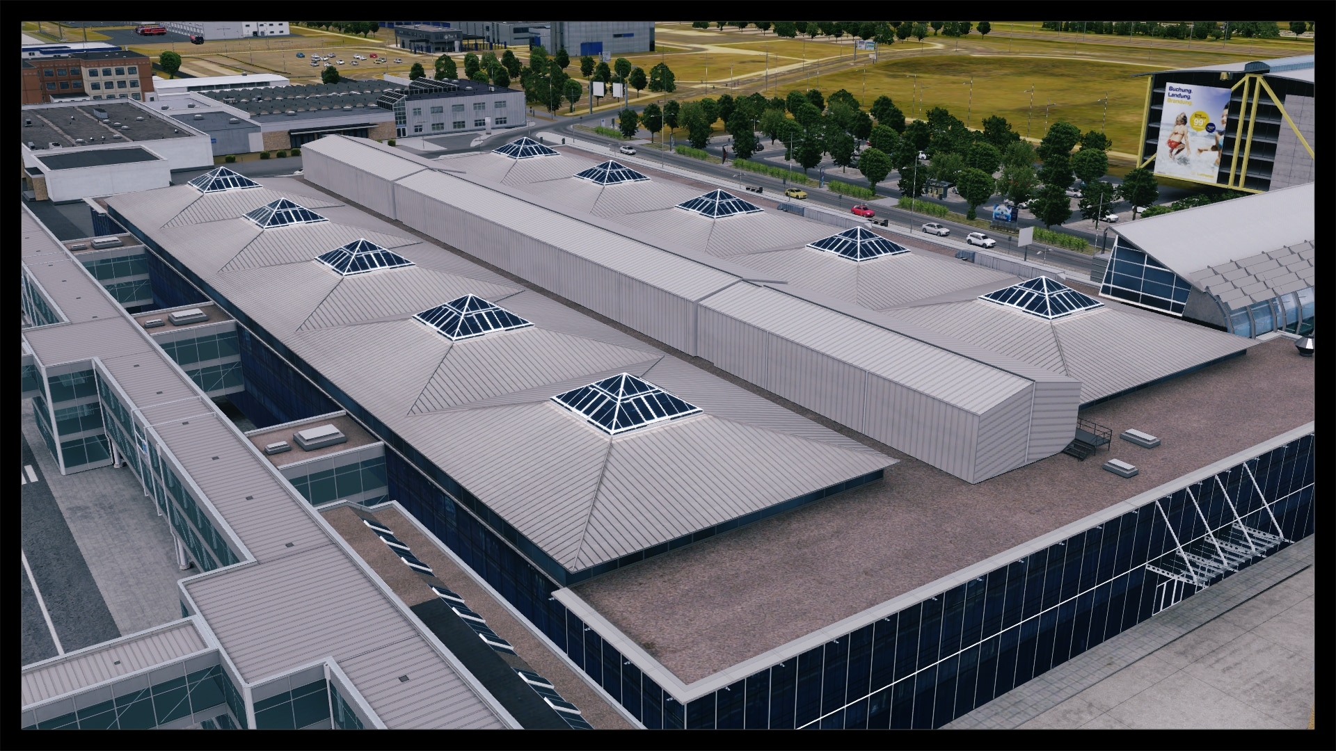 Jedoch fällt auch auf, dass kein Docking Guidance System umgesetzt wurde. Nach Abgleich mit Google Earth und einem YouTube Video existiert in der Realität jedoch eines. Ansonsten ist das Gebäude gut modelliert, hat Detaillierungen in Form von Klimaanlagen, Belüftungseinrichtungen und Geländern. Die Texturierung entspricht dem Original, ist unaufgeregt und sauber. Dies gilt auch für die Gebäude und Objekte in unmittelbarer Umgebung.