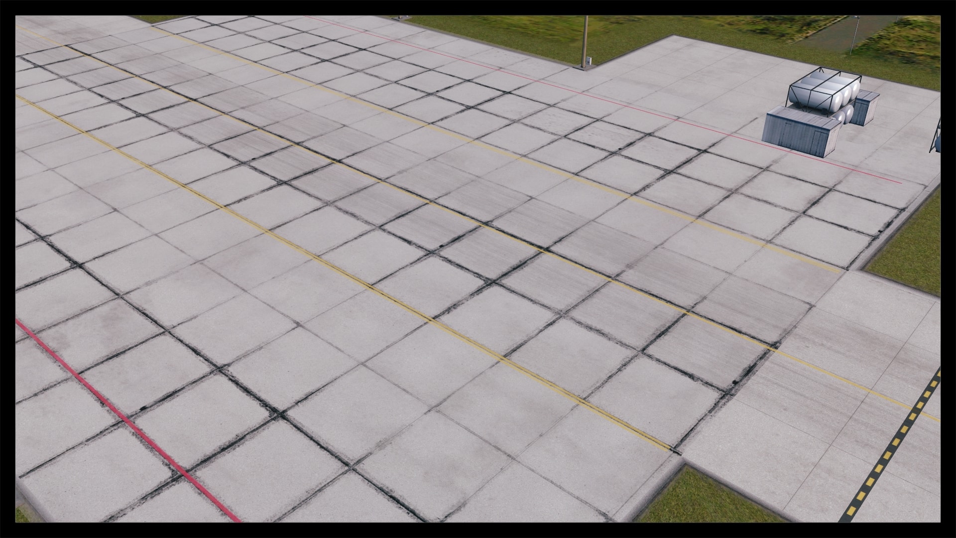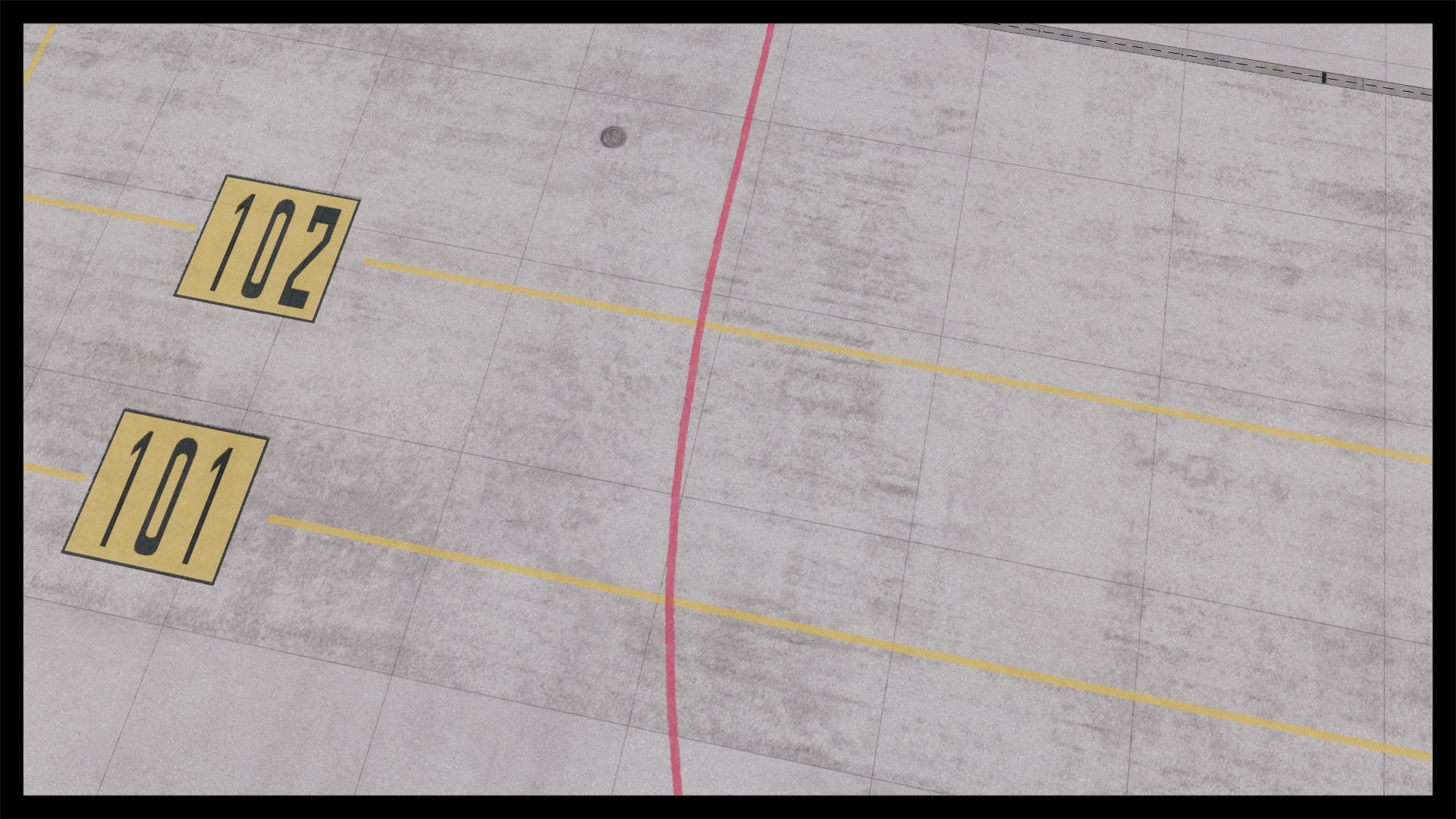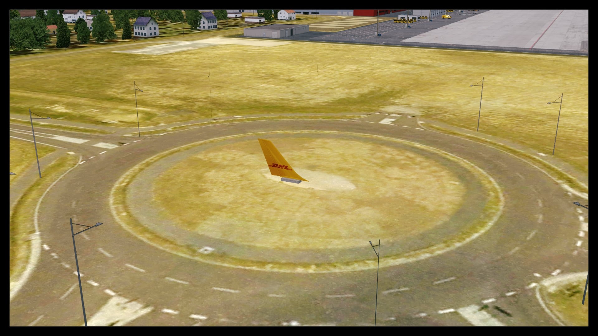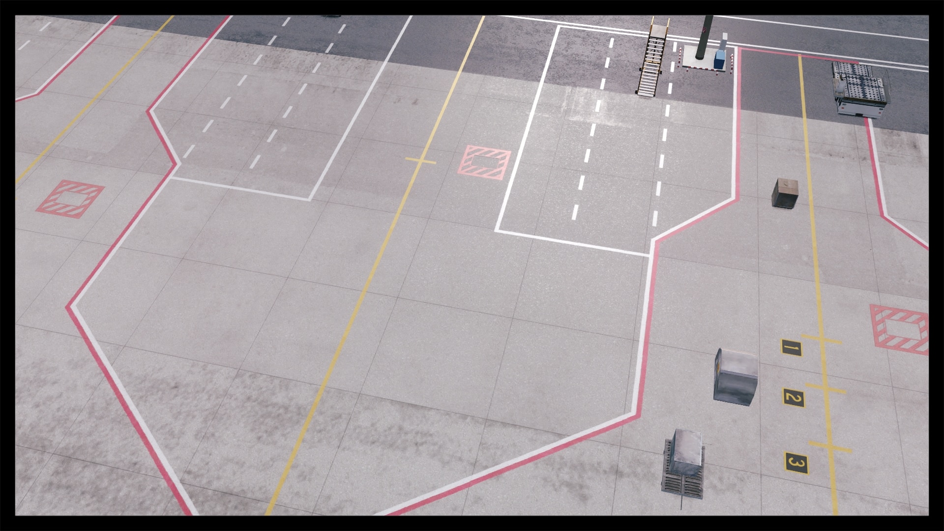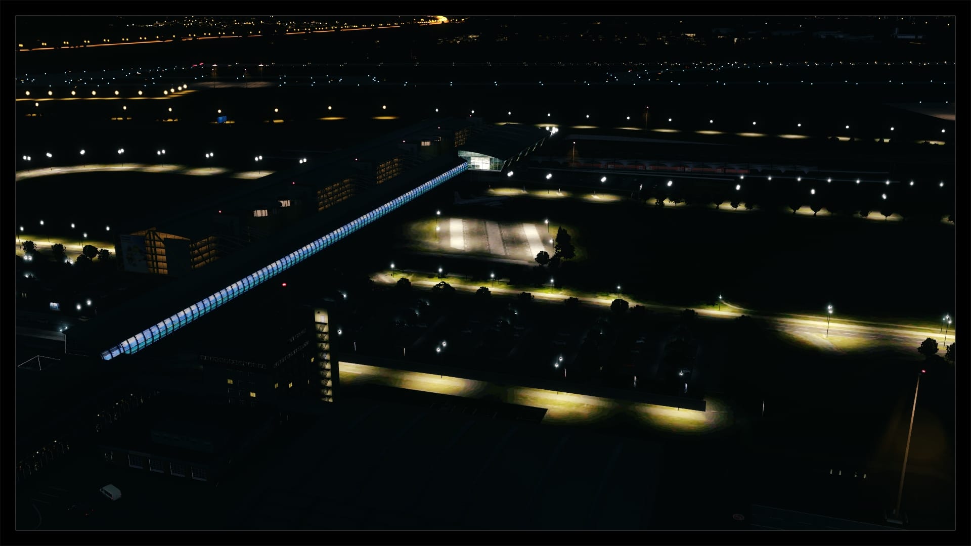 Jedoch fällt auch auf, dass kein Docking Guidance System umgesetzt wurde. Nach Abgleich mit Google Earth und einem YouTube Video existiert in der Realität jedoch eines. Ansonsten ist das Gebäude gut modelliert, hat Detaillierungen in Form von Klimaanlagen, Belüftungseinrichtungen und Geländern. Die Texturierung entspricht dem Original, ist unaufgeregt und sauber. Dies gilt auch für die Gebäude und Objekte in unmittelbarer Umgebung.