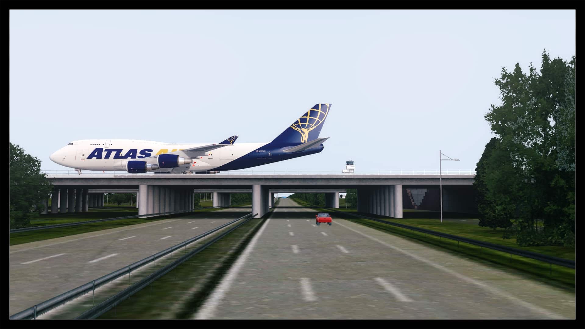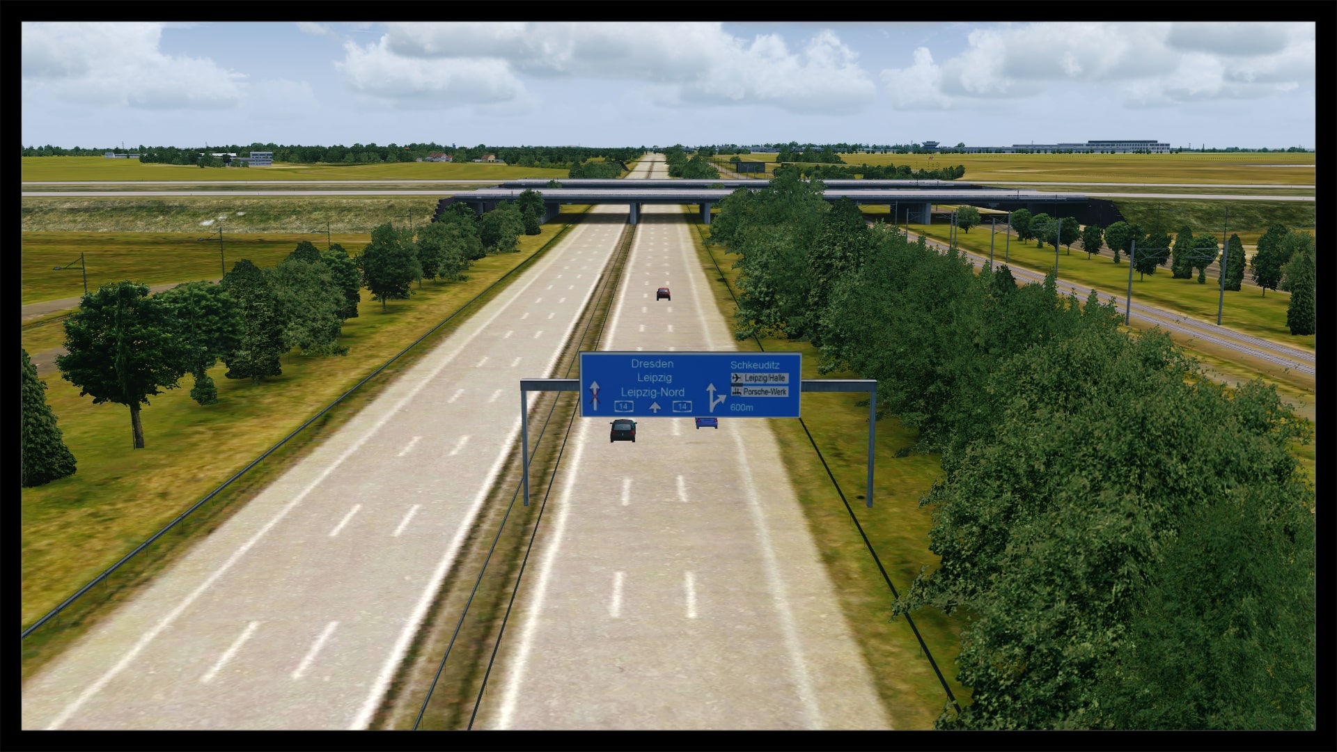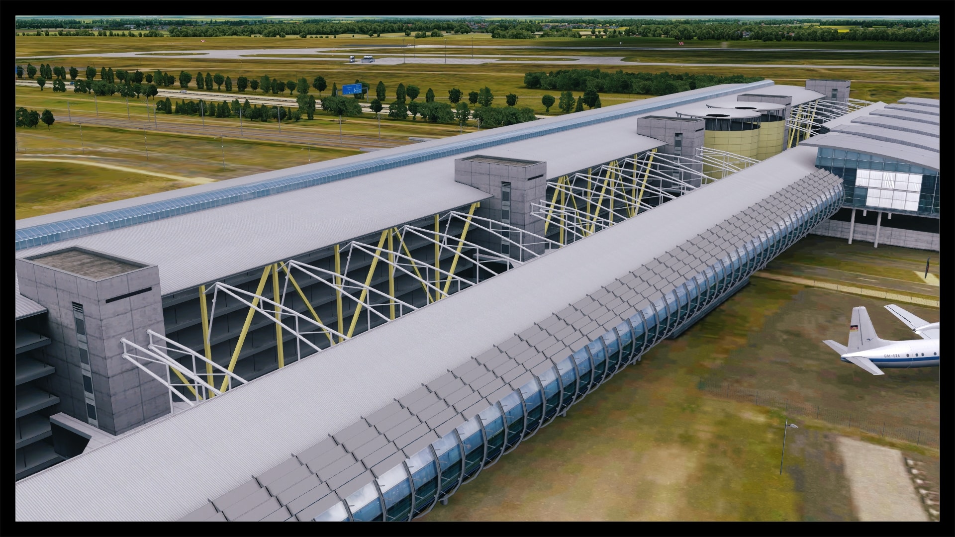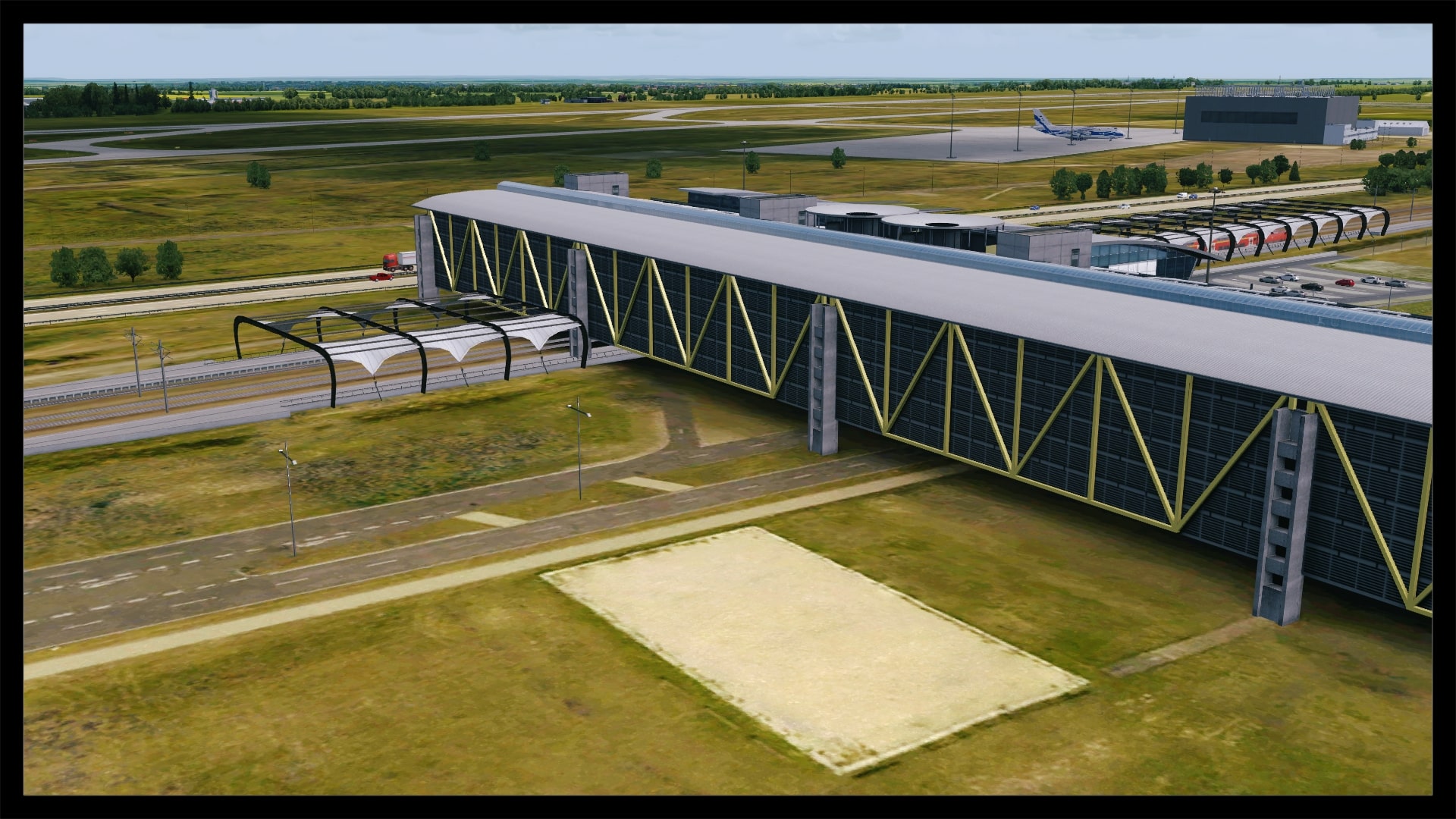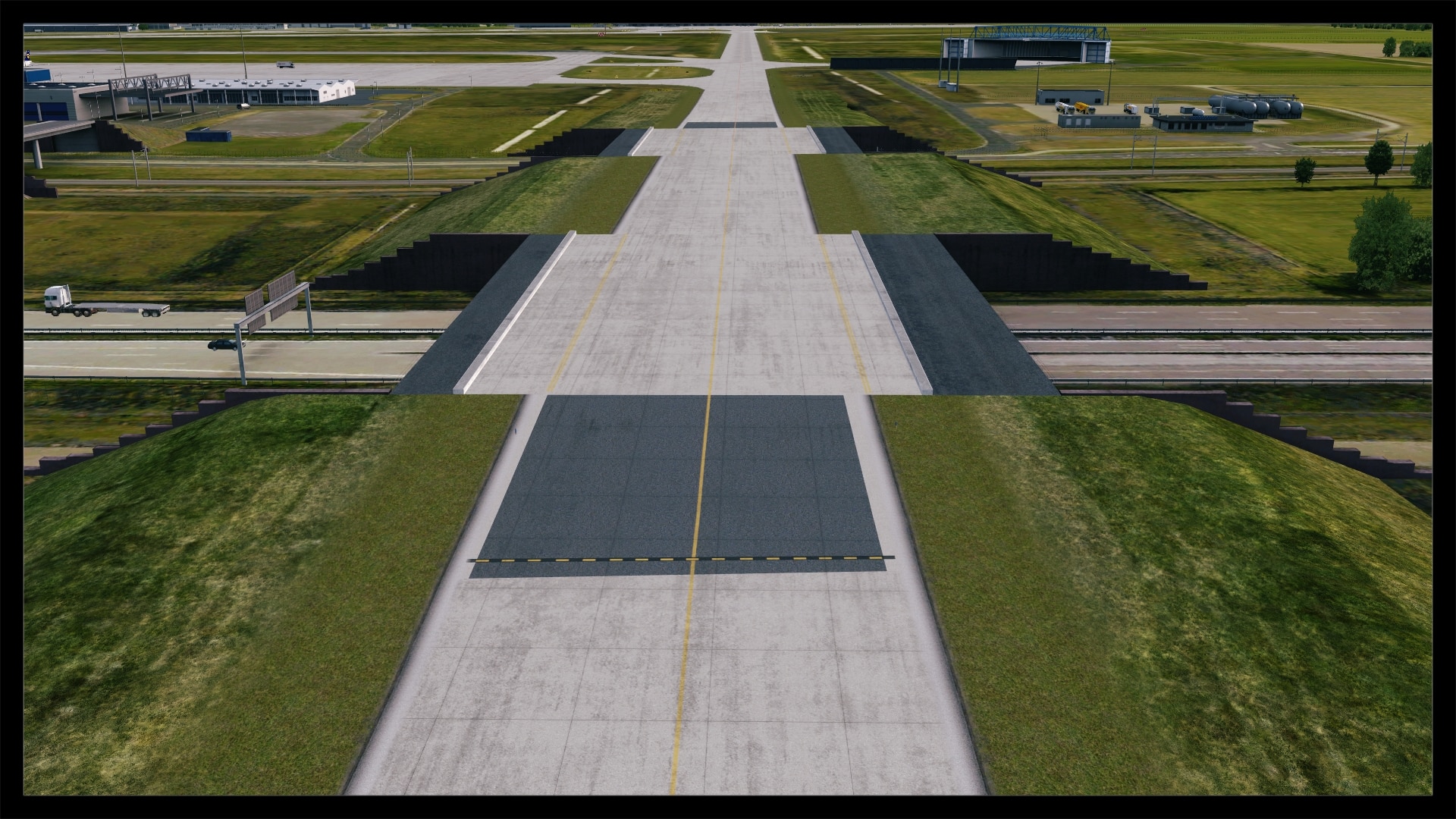 Die Flugzeugbrücken über die A14 sind voll funktionsfähig, hier springt kein Flieger, auch Klippenbildung oder ein Durchscheinen der darunter liegenden Szenerie sucht man vergebens. Jedoch schaffen AI Flieger nicht den Aufstieg, sie rollen auf der Platzhöhe durch die Brücke.