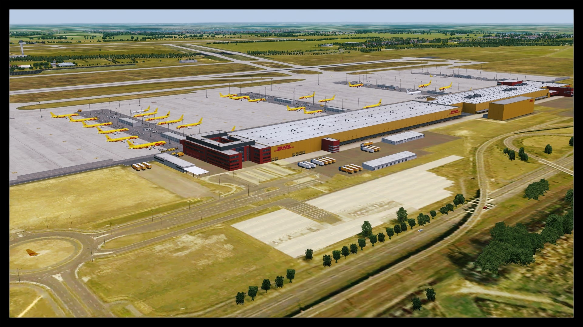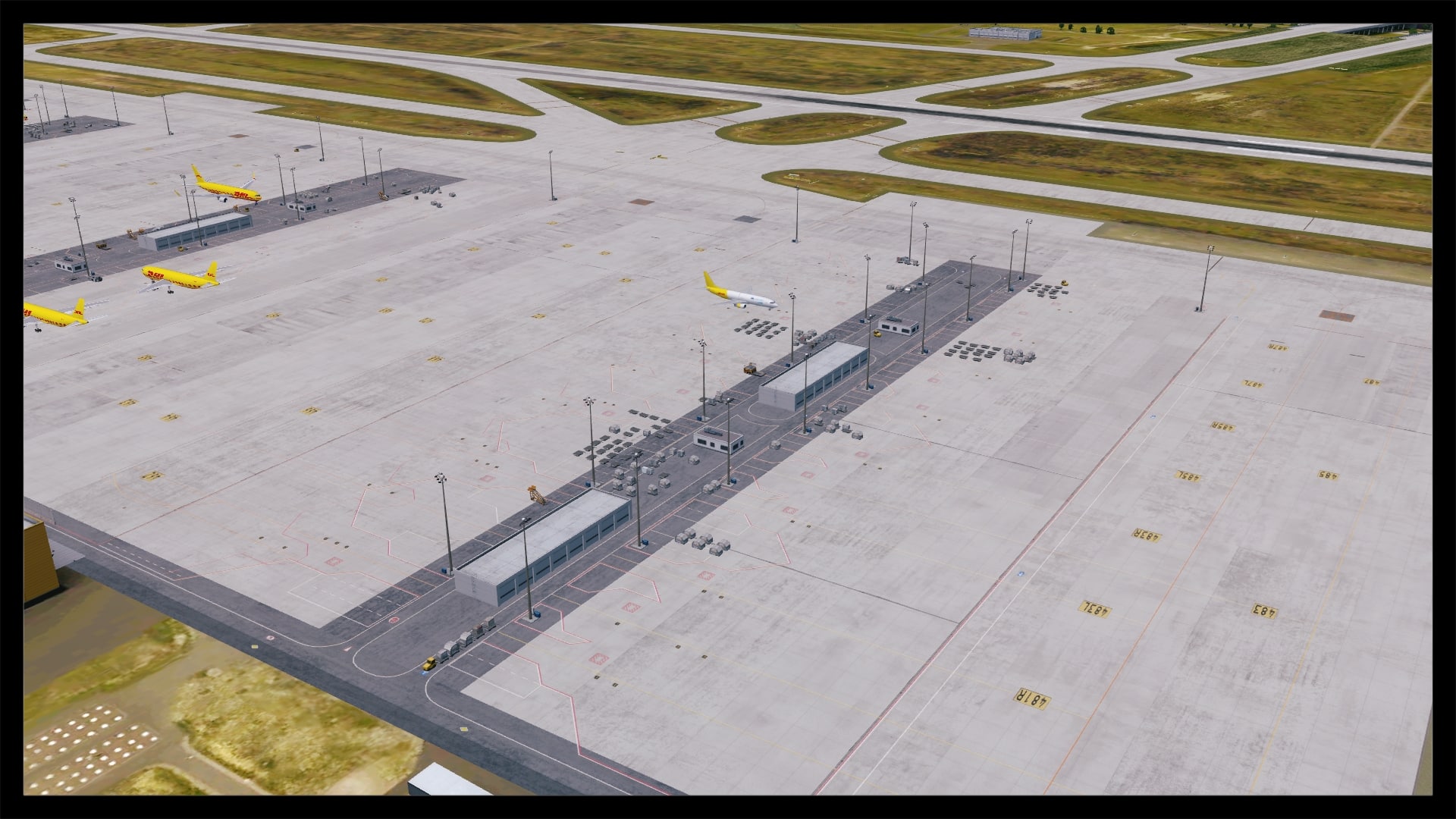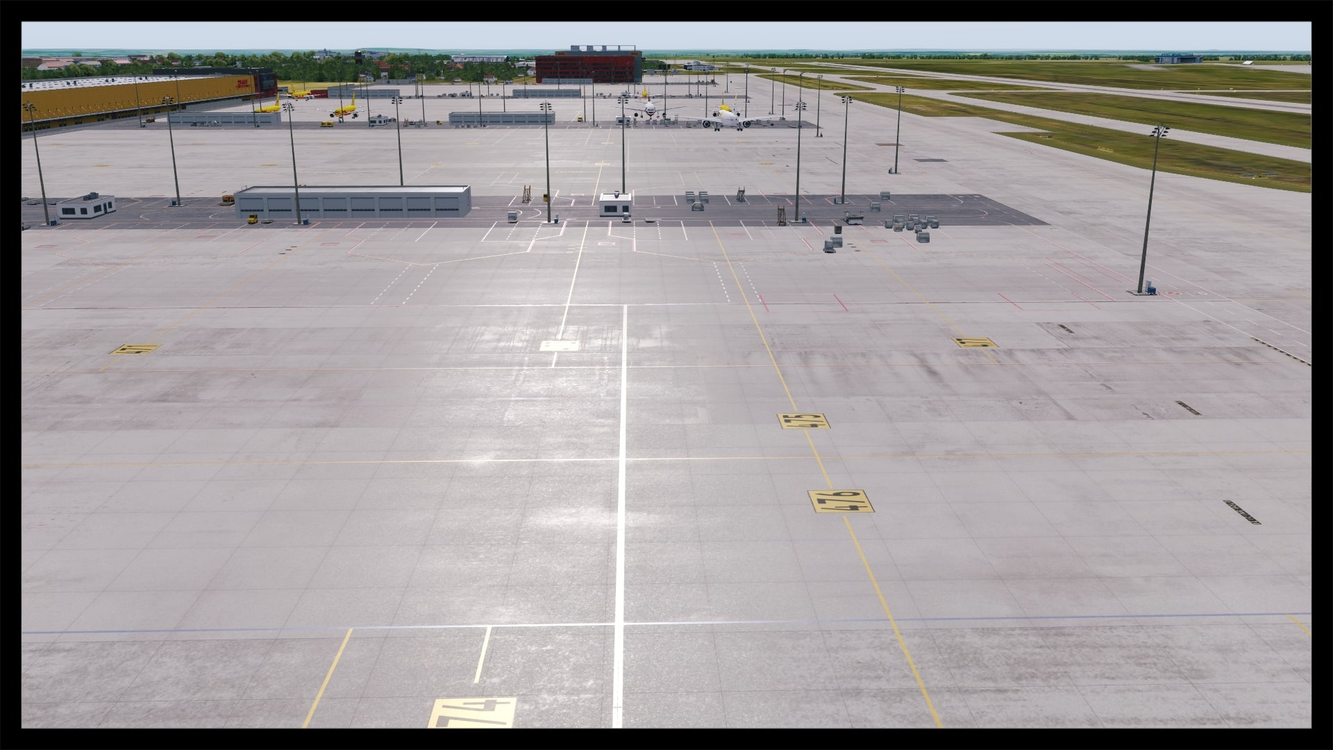 Die Landebahn- und Rollwegtexturen, inklusive Markierungen, sind über jede Kritik erhaben. Sie sind scharf, verschmutzt und nicht zu aufdringlich. Nach einem kurzen Abgleich mit Google Earth stimmen sogar die dargestellten Farbabweichungen in bestimmten Bereichen mit dem Original überein. Die Verschmutzung der Parkpositionen am Terminal ist nicht sehr stark und entspricht damit auch der Realität, gleiches gilt für die DHL Cargo Area.