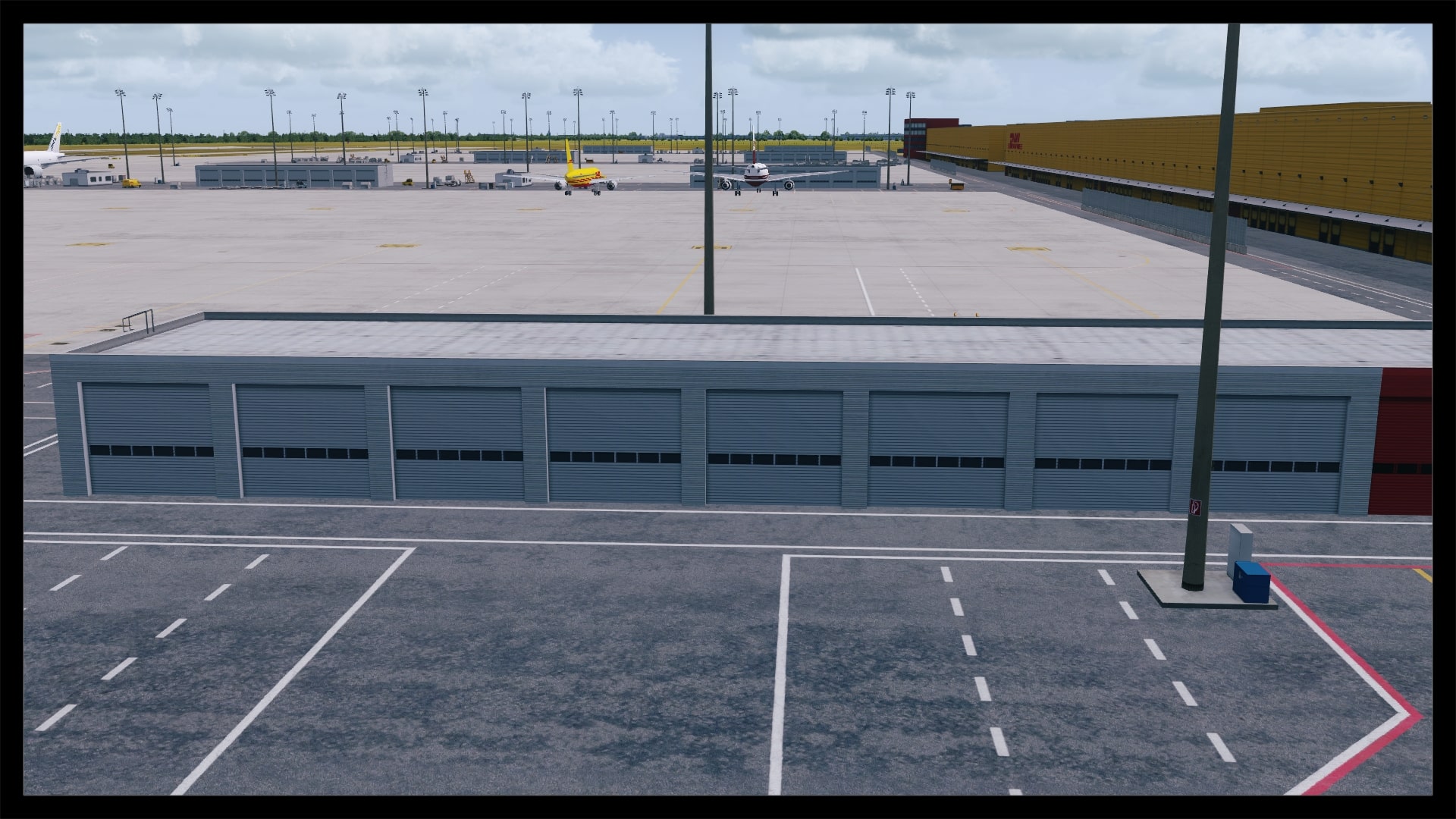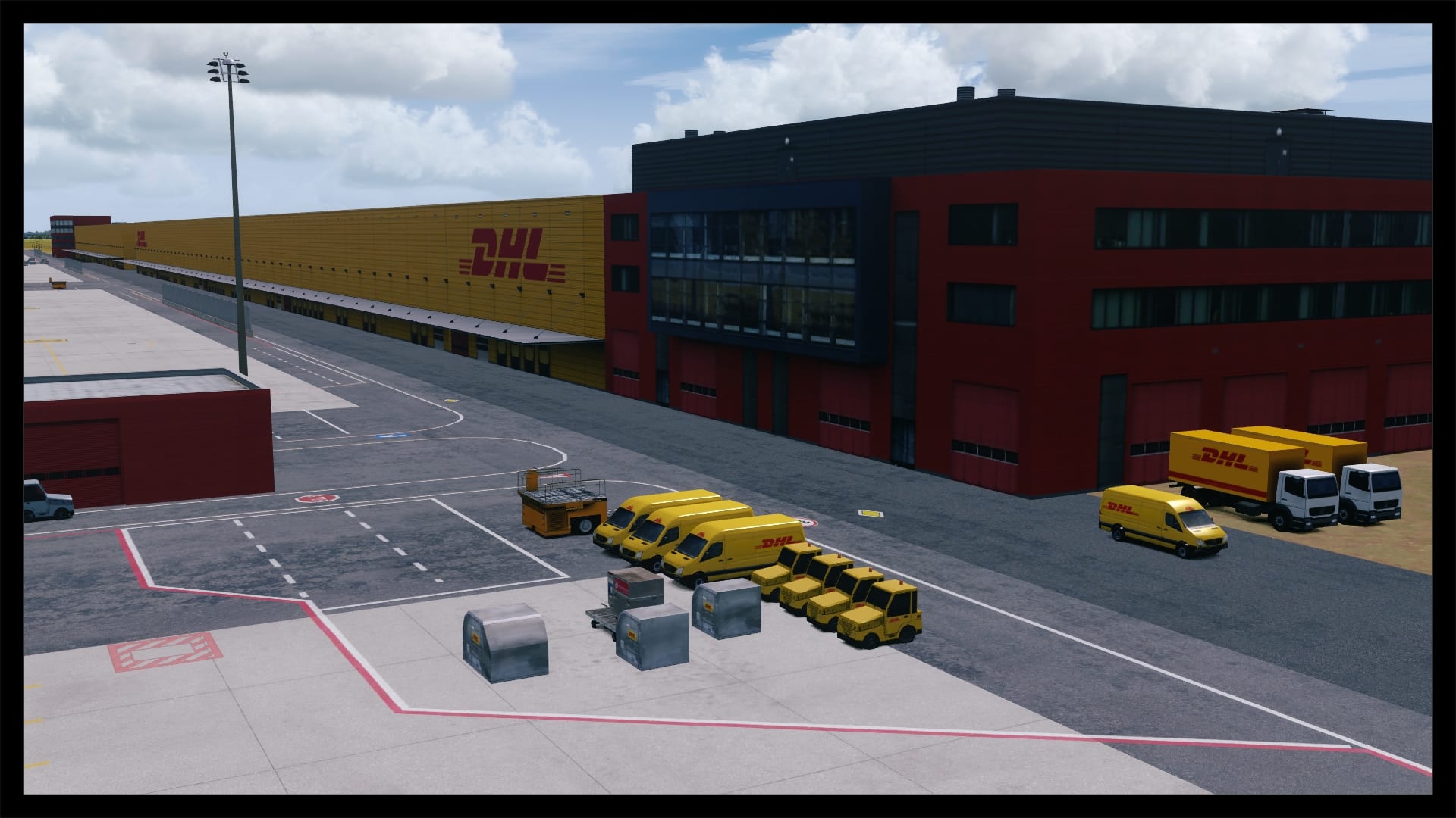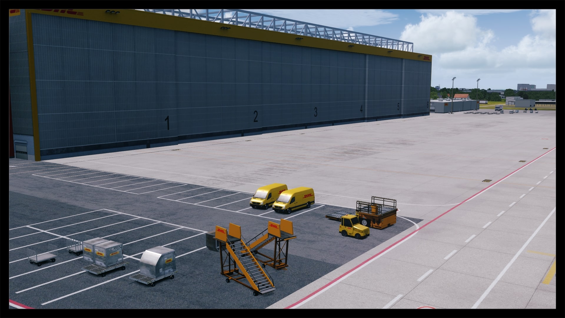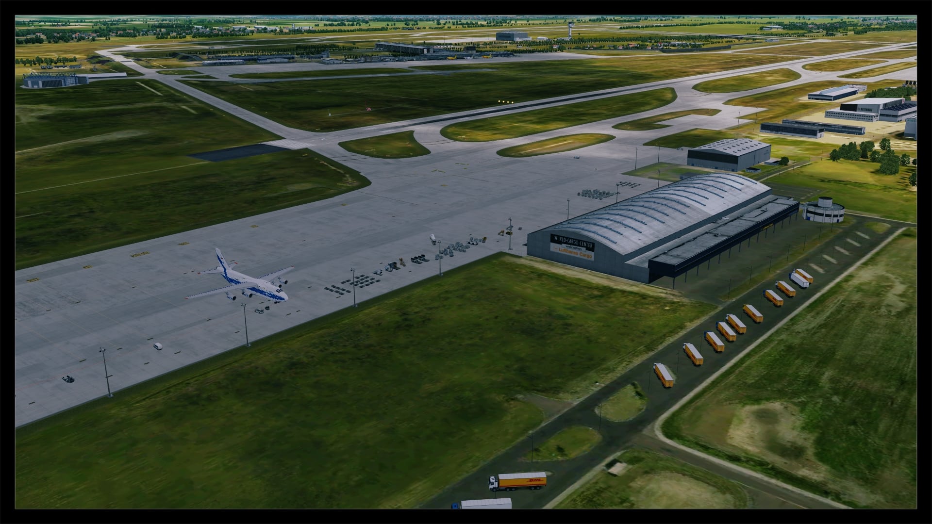 Für viele sicherlich auch ein großes Kaufargument, ist die Möglichkeit, den DHL-Europa-Verkehr oder eine der anderen vielen Frachtverbindungen nun ordentlich nachfliegen zu können. Digital Design hat auch hier ganze Arbeit geleistet. Die Bodentexturen haben die gleiche Qualität wie im übrigen Flughafenbereich. Auch die Verschmutzung ist realistisch gehalten. Die Gebäude, vornehmlich die DHL Logistikhalle und der Hangar, sind solide modelliert und ausreichend, z.B. mit Belüftungsanlagen u.ä., detailliert, ohne dabei spartanisch zu wirken. Auch die zahlreichen Container und Fahrzeuge beleben das Bild. Klar, an die reale Anzahl von Containern kommt die Szenerie nicht ran, aber das ist auch nicht nötig. Alles in allem macht das Ankommen am Frachtbereich genauso viel Spaß wie am Terminal.