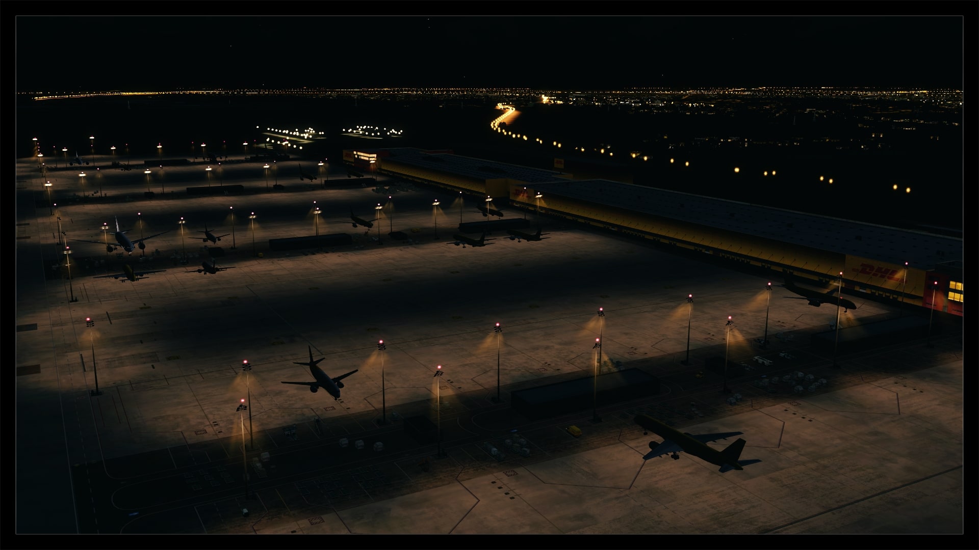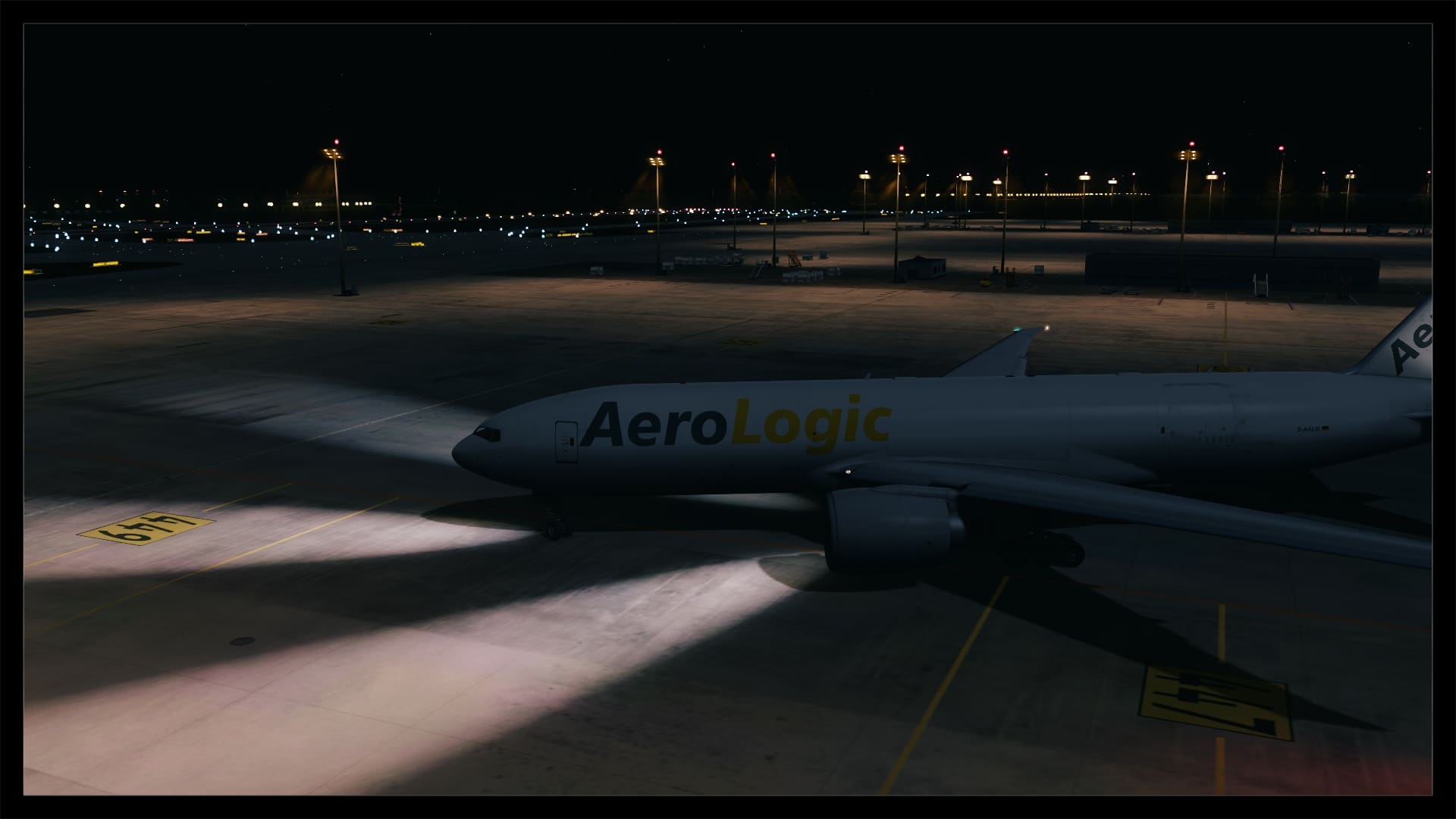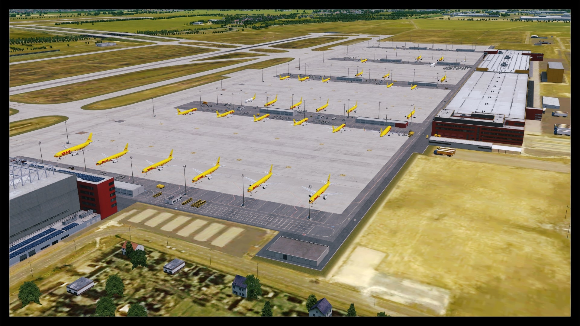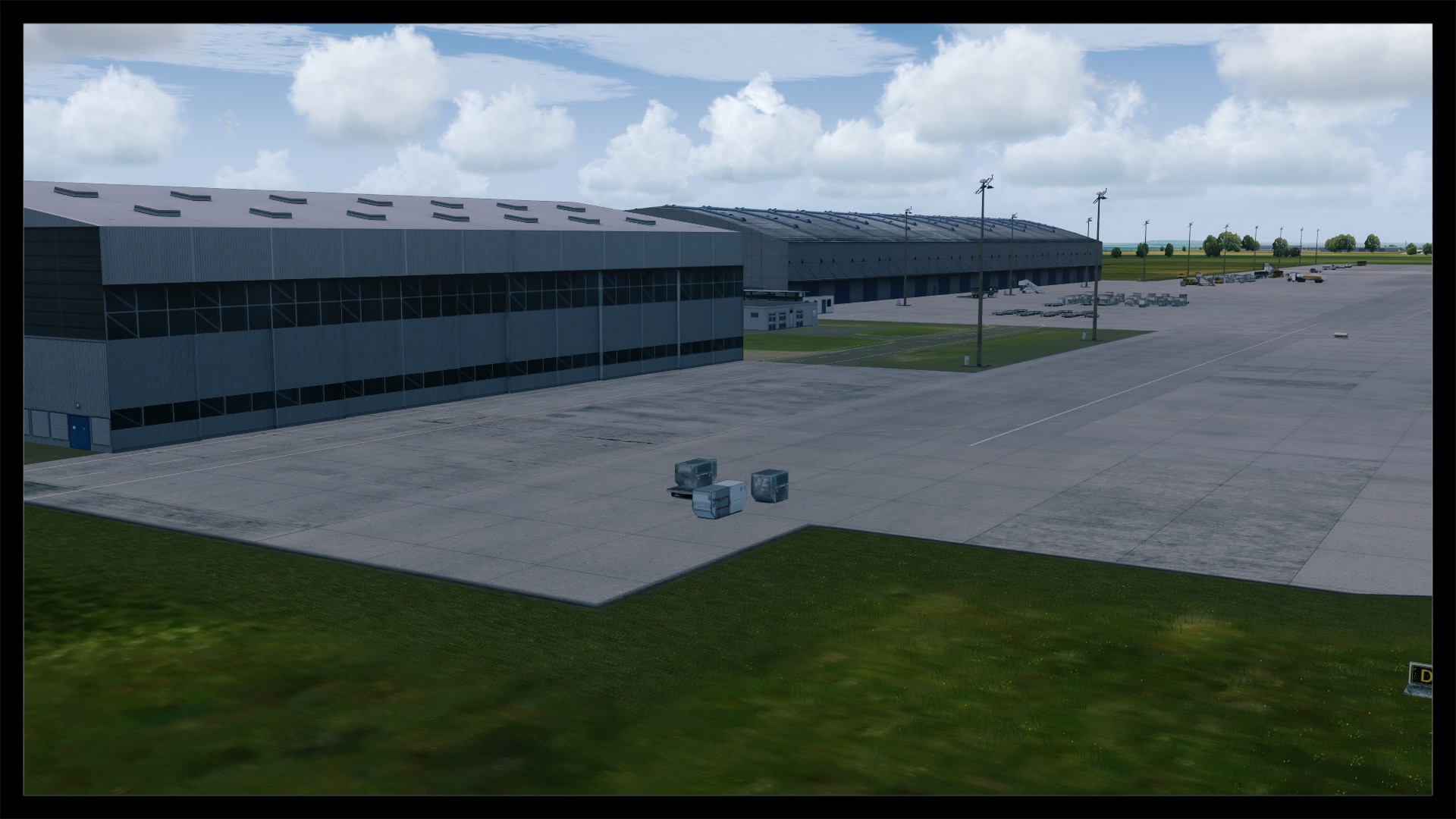 Für viele sicherlich auch ein großes Kaufargument, ist die Möglichkeit, den DHL-Europa-Verkehr oder eine der anderen vielen Frachtverbindungen nun ordentlich nachfliegen zu können. Digital Design hat auch hier ganze Arbeit geleistet. Die Bodentexturen haben die gleiche Qualität wie im übrigen Flughafenbereich. Auch die Verschmutzung ist realistisch gehalten. Die Gebäude, vornehmlich die DHL Logistikhalle und der Hangar, sind solide modelliert und ausreichend, z.B. mit Belüftungsanlagen u.ä., detailliert, ohne dabei spartanisch zu wirken. Auch die zahlreichen Container und Fahrzeuge beleben das Bild. Klar, an die reale Anzahl von Containern kommt die Szenerie nicht ran, aber das ist auch nicht nötig. Alles in allem macht das Ankommen am Frachtbereich genauso viel Spaß wie am Terminal.