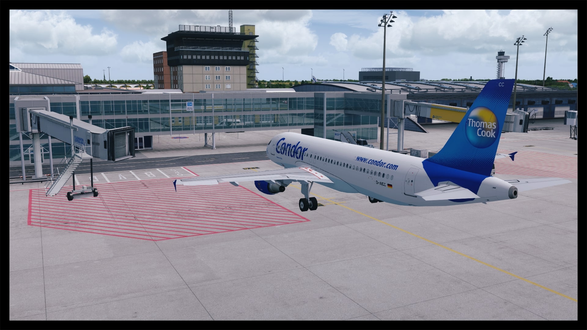 Beim Einbiegen auf die Parkposition fallen einem sofort die sauber gearbeiteten Fluggastbrücken (SODE) auf, sowie der einsehbare jedoch nicht ausmodellierte Einstiegsbereich der Fluggäste.