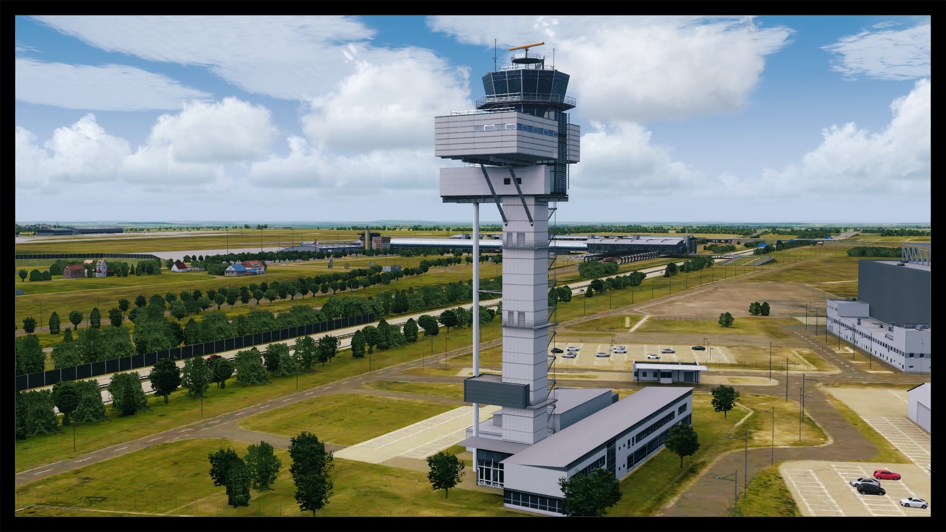 Einmal quer über den Platz, fast in der Mitte befindet sich der Tower. Sein Design gleicht denen in Frankfurt und Berlin (SXF) und scheint die Blaupause für die eben genannten zu sein. Die Detaillierung ist ordentlich. So ist die Treppe, welche sich außen Tower befindet umgesetzt, auch zahlreiche Stahlträger und Antennen sind zu finden.