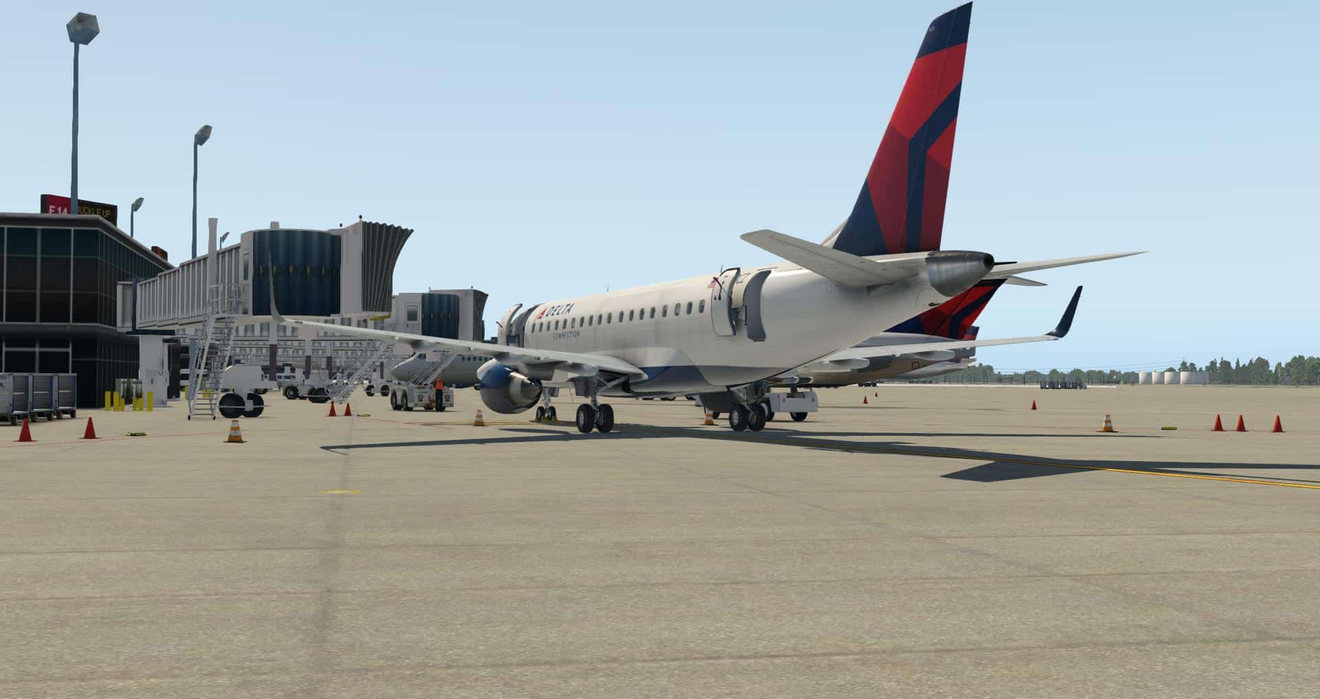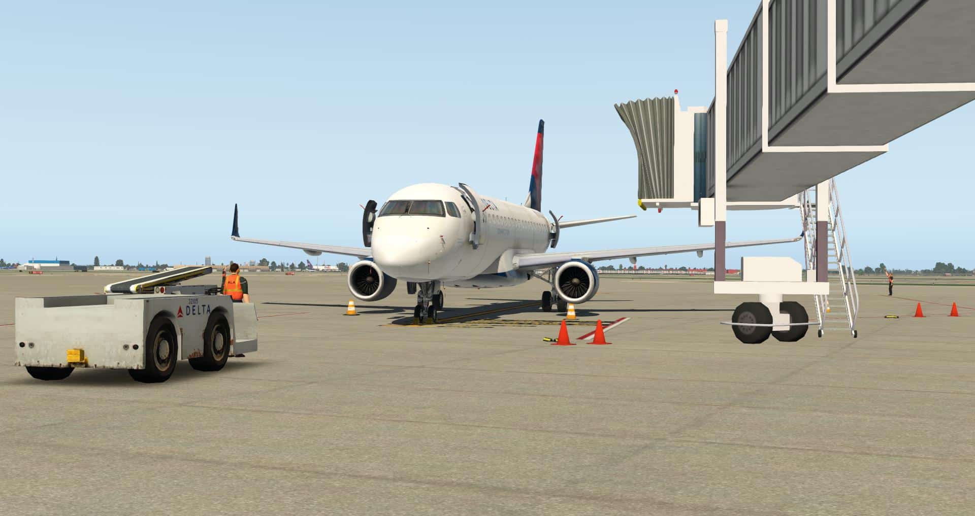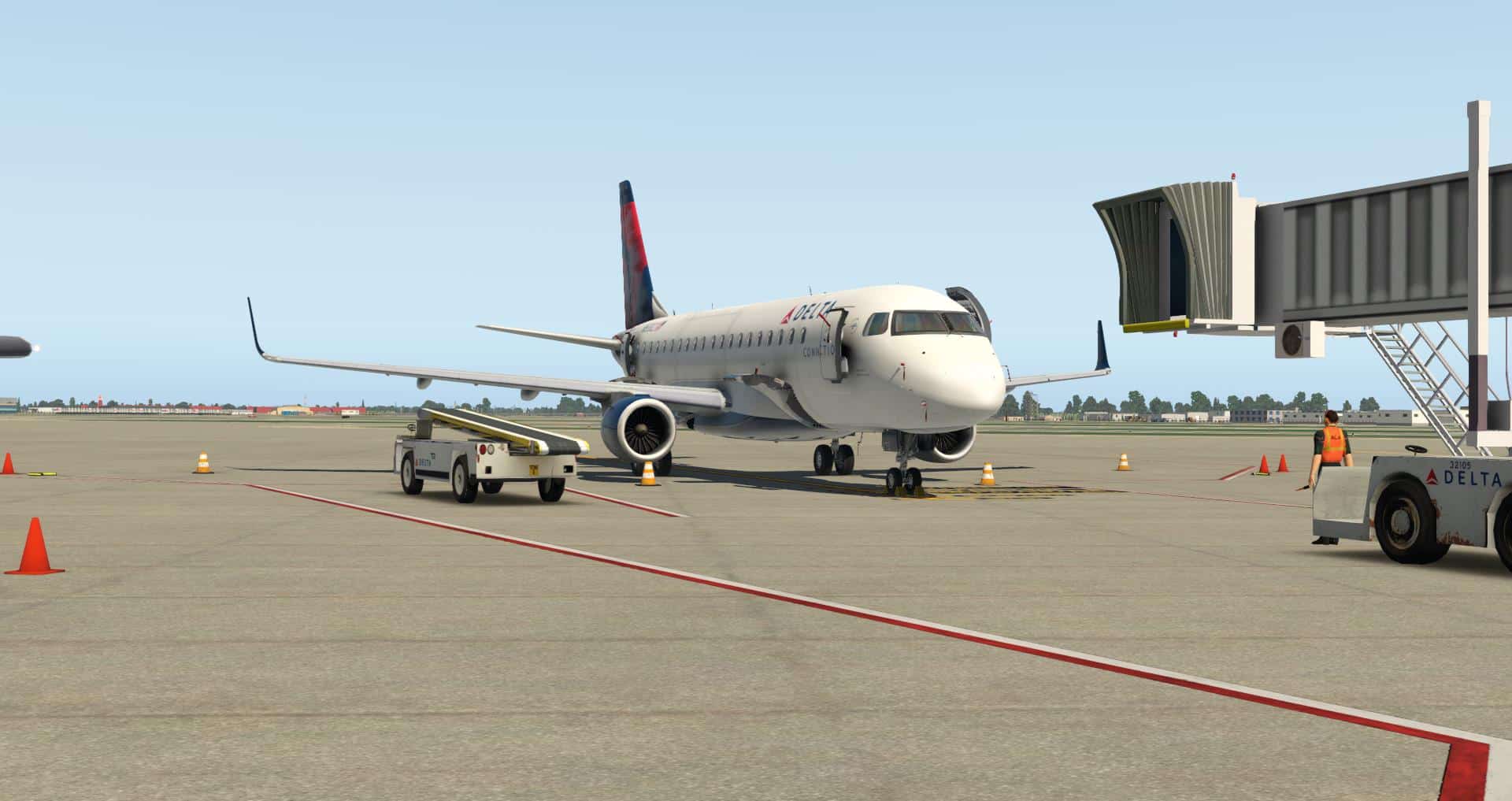 Nun, was machen wir dann mal für den ersten Eindruck? Wir stellen uns mit der Embraer 175 in Delta-Connection-Livery nach Minneapolis und bereiten uns für einen kurzen Testflug vor. Wir finden die N633CZ von Compass Airlines – cold and dark – am Morgen vor und stellen mithilfe des entsprechenden Menüs ein bisschen Equipment ans Flugzeug und öffnen die Türen. Fürs erste widmen wir uns aber dem Walkaround und schauen uns an, was es an dieser Umsetzung der E175 denn alles so zu sehen gibt.