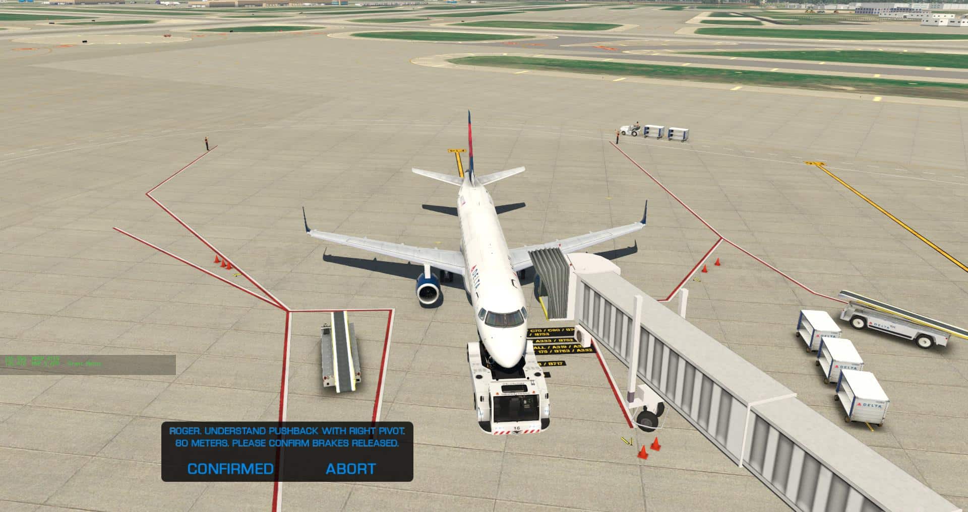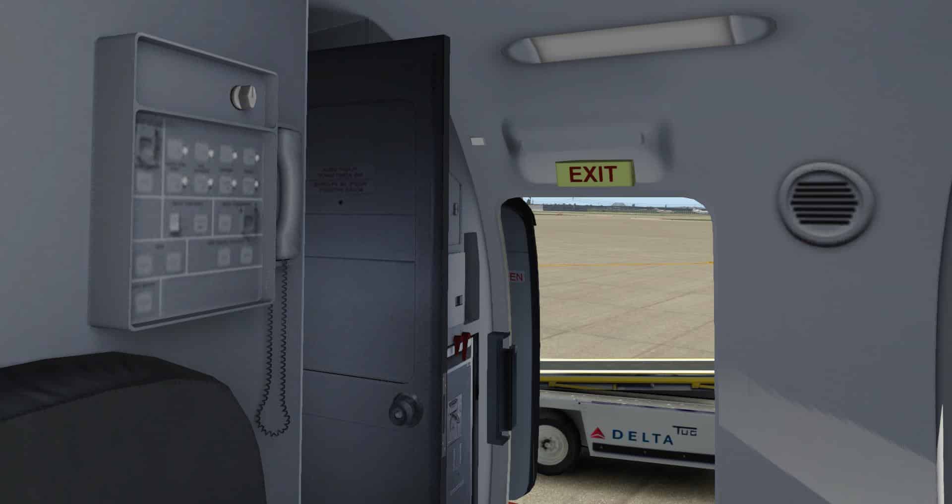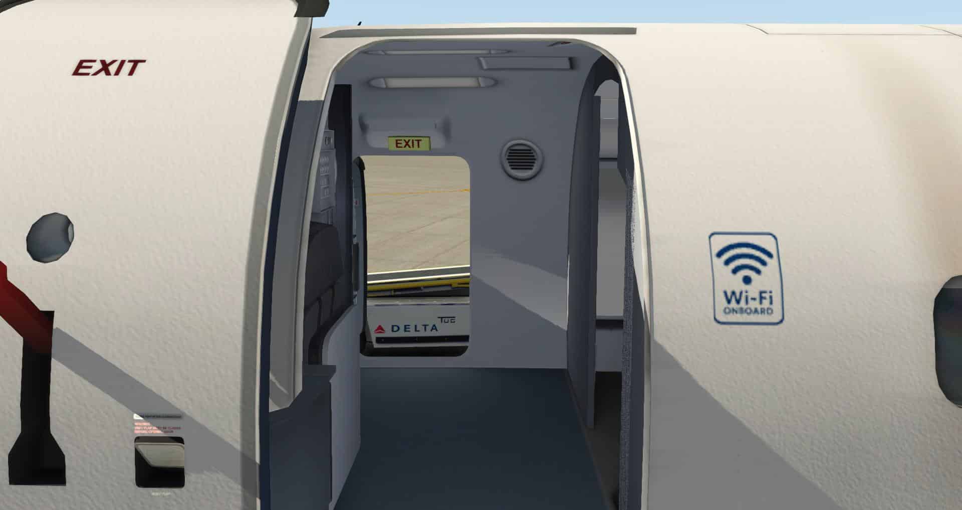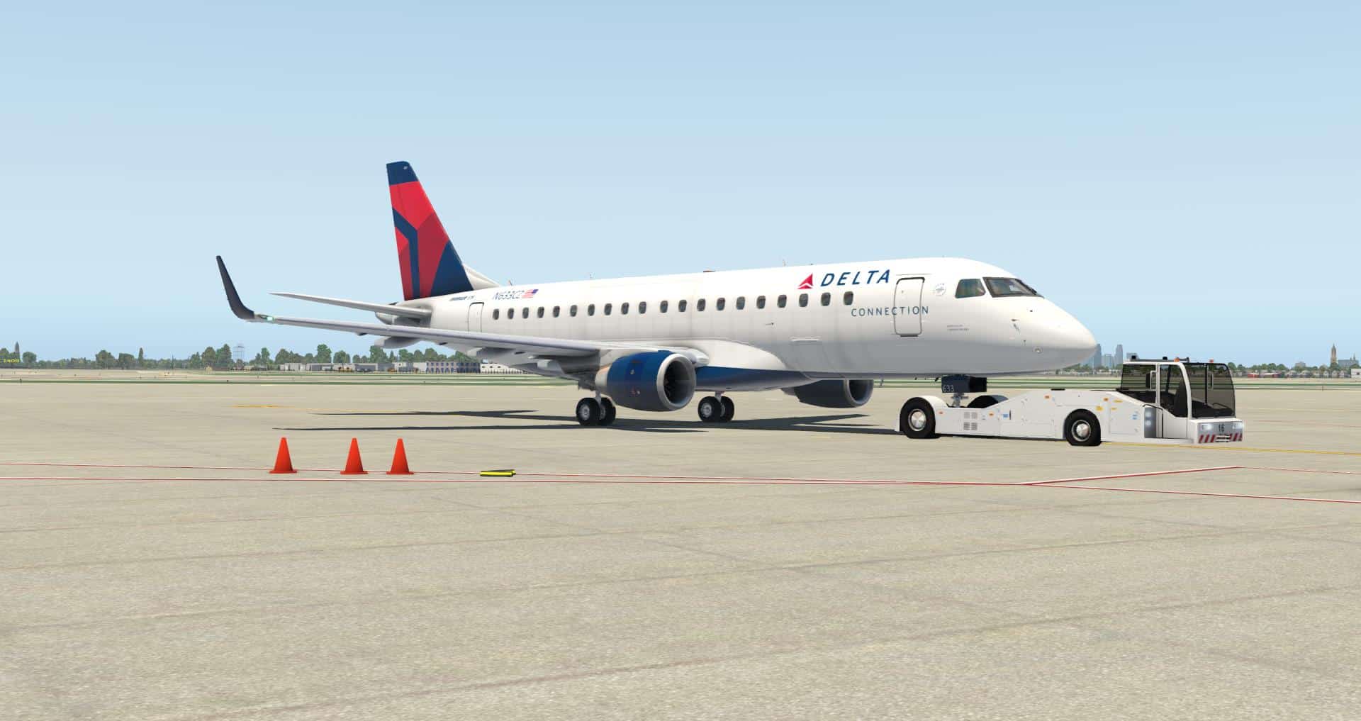 Nun, was machen wir dann mal für den ersten Eindruck? Wir stellen uns mit der Embraer 175 in Delta-Connection-Livery nach Minneapolis und bereiten uns für einen kurzen Testflug vor. Wir finden die N633CZ von Compass Airlines – cold and dark – am Morgen vor und stellen mithilfe des entsprechenden Menüs ein bisschen Equipment ans Flugzeug und öffnen die Türen. Fürs erste widmen wir uns aber dem Walkaround und schauen uns an, was es an dieser Umsetzung der E175 denn alles so zu sehen gibt.