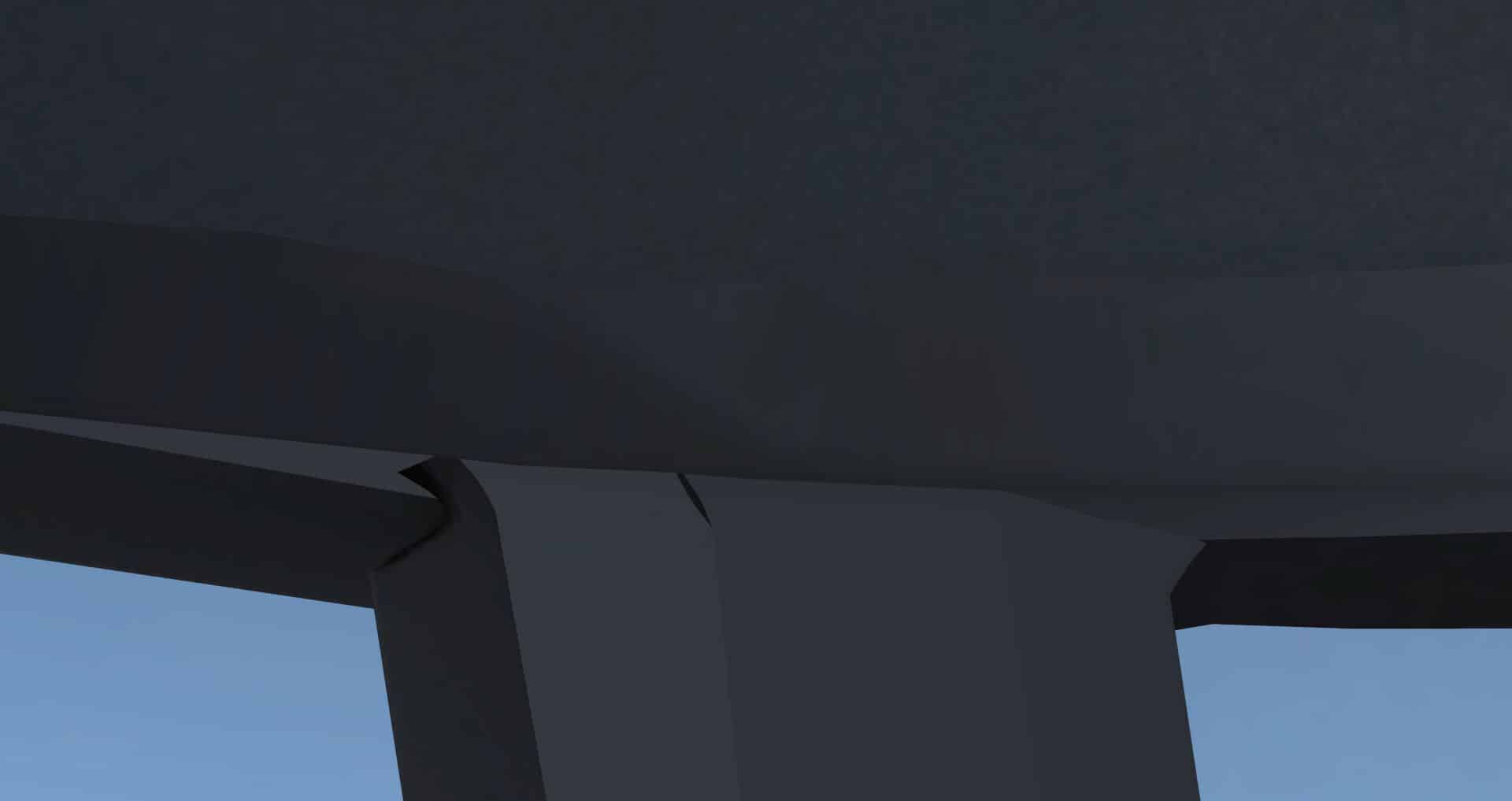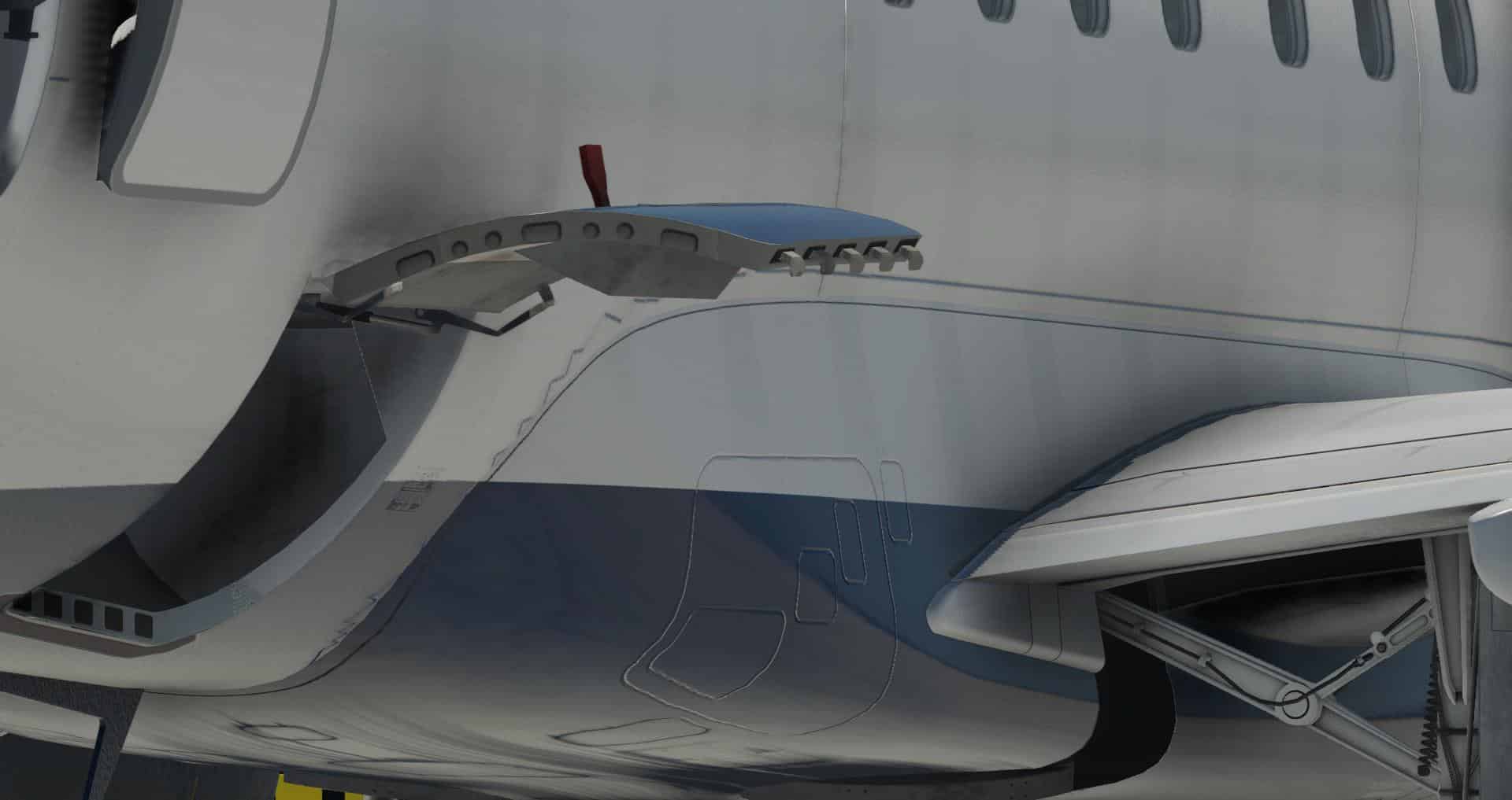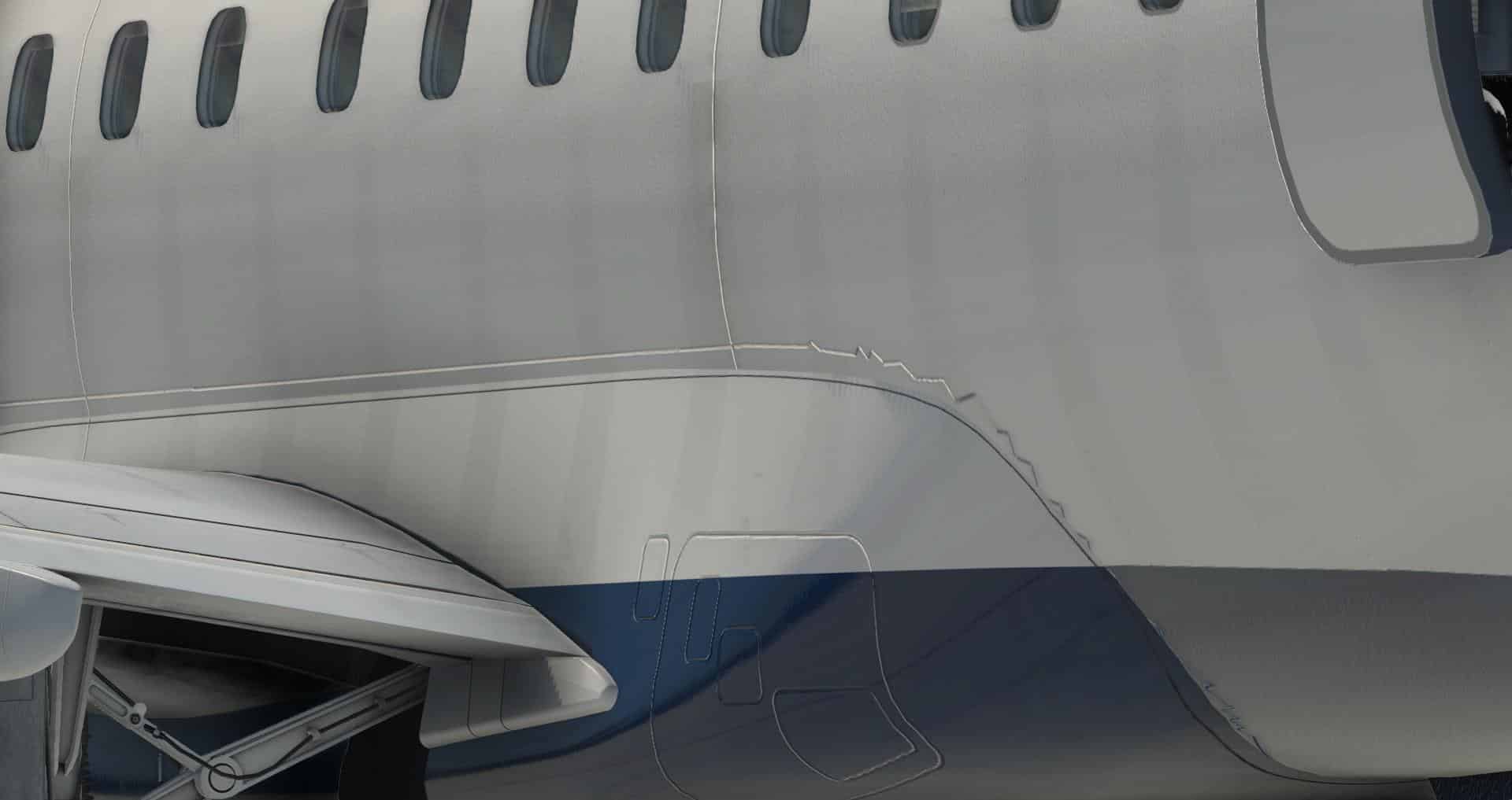 Was außen, zumindest bei der Embraer E175 sichtbar ist, ist abgesehen von der üblichen „Fuge“ beim Übergang zwischen Rumpf und Flügelmittelkasten eine weitere Linie, die zickzackförmig einen ähnlichen Verlauf (mit ein bisschen Abstand zur eigentlich Fuge) und wirkt wie ein Riss. Wenn ich an meine Zeit auf dem Vorfeld denke oder mir Fotos der realen Vorbilder ansehe, kann ich dies nicht bestätigen, ich muss hier also davon ausgehen, dass dies nicht beabsichtigt ist. Natürlich habe ich überprüft, ob das ein Problem bei einzelnen Liveries sein könnte, allerdings spielt die Lackierung selbst keine Rolle. Bei der E195 ist diese Zickzack-Linie auch vorhanden, aber deutlich schwächer ausgeprägt als bei der E175, von der der folgende Screenshot stammt. (Nachtrag an dieser Stelle: Wie in den Kommentaren erörtert wurde, sind die Riefen tatsächlich real auch vorhanden, was ich schließlich nach weiterem Abgleich mit Videos und Fotos bestätigen konnte.)