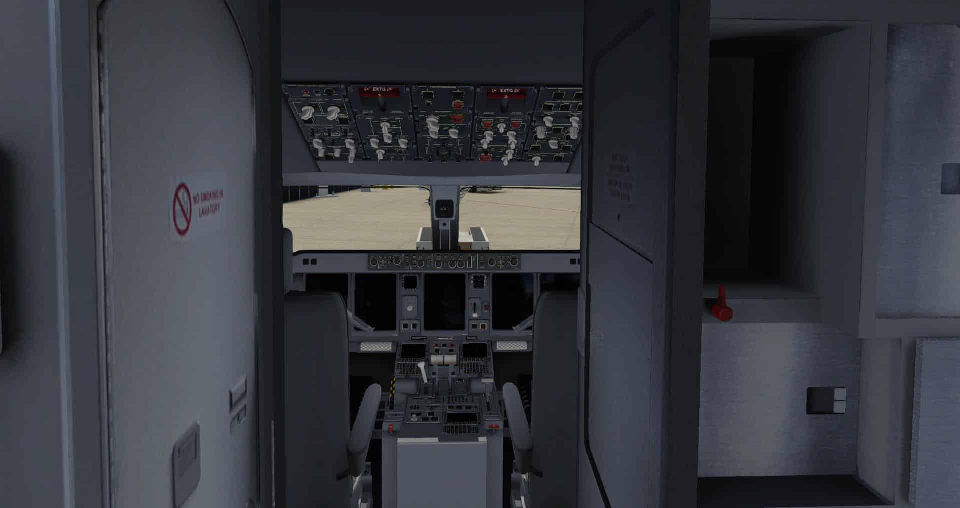 Wir steigen ins Flugzeug durch die Tür 1L und blicken einmal nach rechts, einmal nach links und sind von beiden Richtungen angetan. Links sieht das Cockpit auf den ersten kurzen Blick einladend aus, zur rechten Hand sieht aber auch die Passagierkabine sehr gut aus. Und das sage ich als jemand, dem diese Dreingaben – nichts anderes sind ausmodellierte Kabinen für mich – nicht sonderlich wichtig sind. Wir drehen uns kurz nach rechts und gehen durch den Gang bis hin zur Galley im Heck der Kabine durch und kommen schließlich mit einem leichten Grinsen zum Cockpit zurück. Nicht, dass sich meine Sichtweise in Hinblick auf die Notwendigkeit von ausmodellierten Passagierkabinen geändert hat, aber gegen Detailreichtum wie in diesem Falle habe ich nun wirklich nichts.