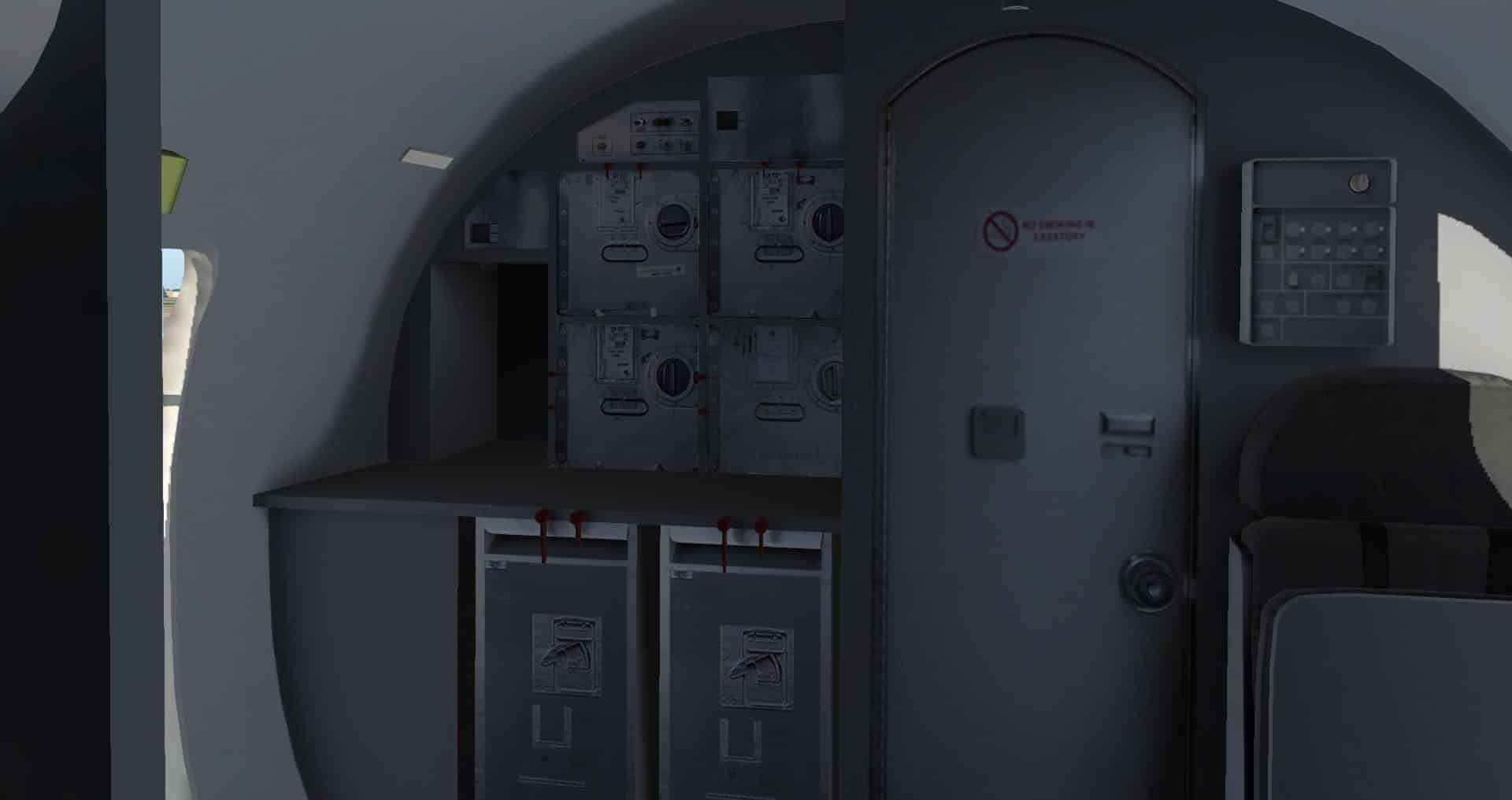 Einladend – Anders kann man das schlecht beschreiben. Ich hatte es schon anklingen lassen, ich bin persönlich so gar kein Verfechter von ausmodellierten Kabinen. Während eines normalen Fluges auf VATSIM findet man mich dort nie, sondern ausschließlich im Cockpit bzw. in einer Außenansicht, falls ich Screenshots machen möchte. Dennoch kann ich ja schlecht ausschließlich von mir ausgehen. Ich lese gar nicht so selten Nachfragen nach Passagierkabinen in Flugzeugen, die sie (noch) nicht implementiert haben. Ich kann mich damit nicht identifizieren, aber das spricht ja für die Diversität an Vorlieben bei Addon-Flugzeugen. X-Crafts hat hier in der Kabine sehr solide Arbeit geleistet. Die Texturen sind alle mindestens ausreichend scharf (wer zoomt schon dicht an das Kabinenmanagementpanel heran?), die meisten Objekte sind sogar detailliert modelliert wie beispielsweise die gelatchten Trolleys und Fächer in der Galley oder in der vorderen Kabine. Wer auf Eye-Candy steht, ist hier gut aufgehoben.