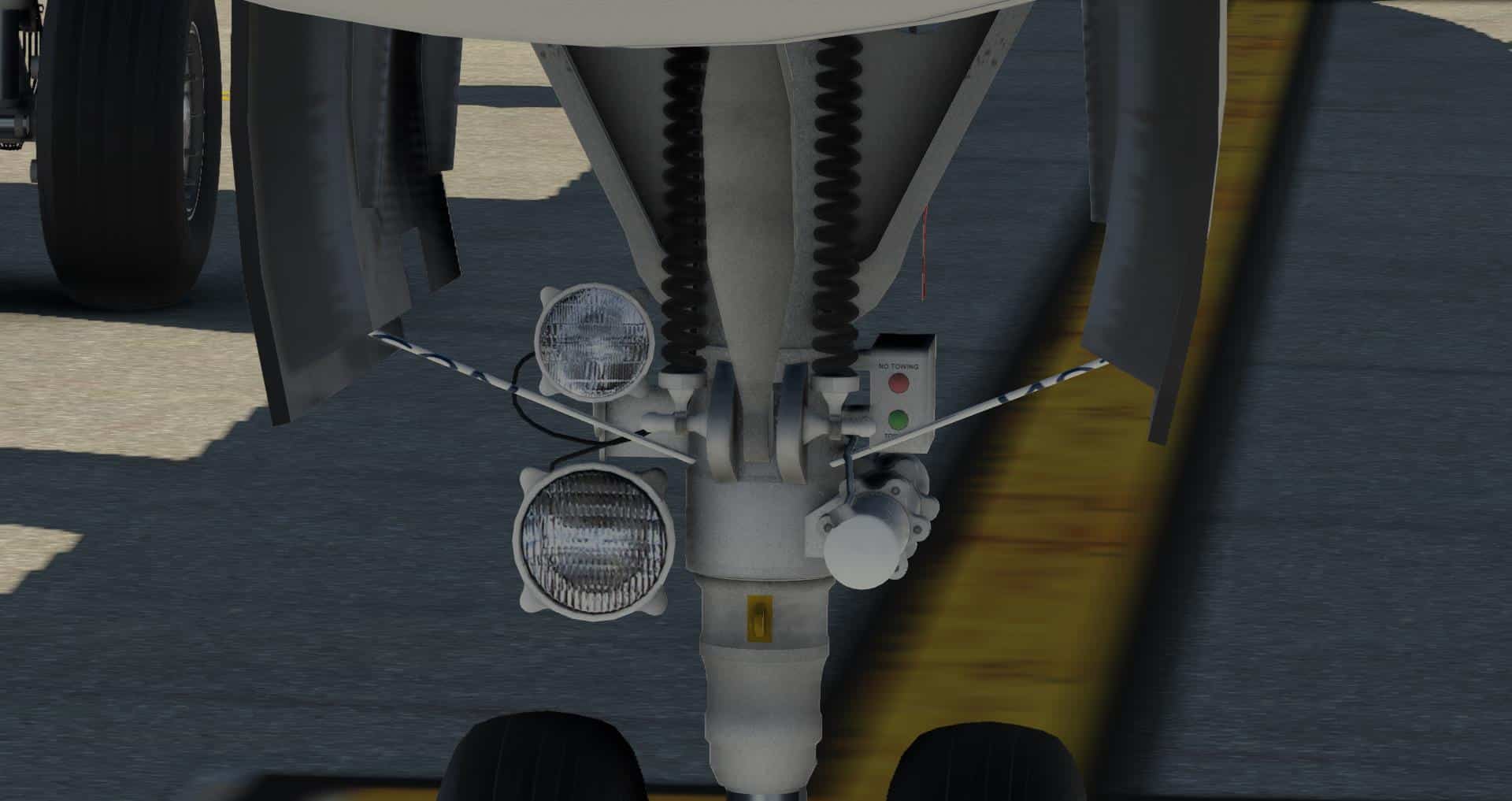 Ich bin nun eine Weile nicht mehr am Hamburger Flughafen und entsprechend weit zurück liegt der letzte reale „outside check on arrival“ bei einer Embraer E175, aber X-Crafts hat hier sehr vernünftige Arbeit geleistet, die Liebe fürs Detail ist beeindruckend. Um das zu sehen, muss man sich zum Beispiel das Fahrwerk oder die Spoilers hochfahren und darunter schauen. Was findet man so? Kabel, Schläuche… sucht euch etwas aus… ich kann nicht für jeden einzelnen Schlauch bürgen, dass er an der korrekten Stelle ist, aber es kommt einem alles sehr bekannt vor und wer das Flugzeug nicht aus dem realen Leben kennt, der findet zumindest alles nachvollziehbar und glaubhaft. Mir ganz besonders in Erinnerung geblieben ist die Deaktivierung der Nosewheel-Steering für den Pushback, die bei den meisten Flugzeugen mit einem Nosewheel-Steering-Bypass-Pin erfolgt, der für die Dauer des Pushbacks eingeschoben wird. Bei der Embraer E-Jets-Serie erfolgt dies einfach per Knopfdruck am Nosegear. Natürlich ist der Knopfdruck selbst nicht simuliert, aber die Buttonbox am Nosegear ist akkurat modelliert.
