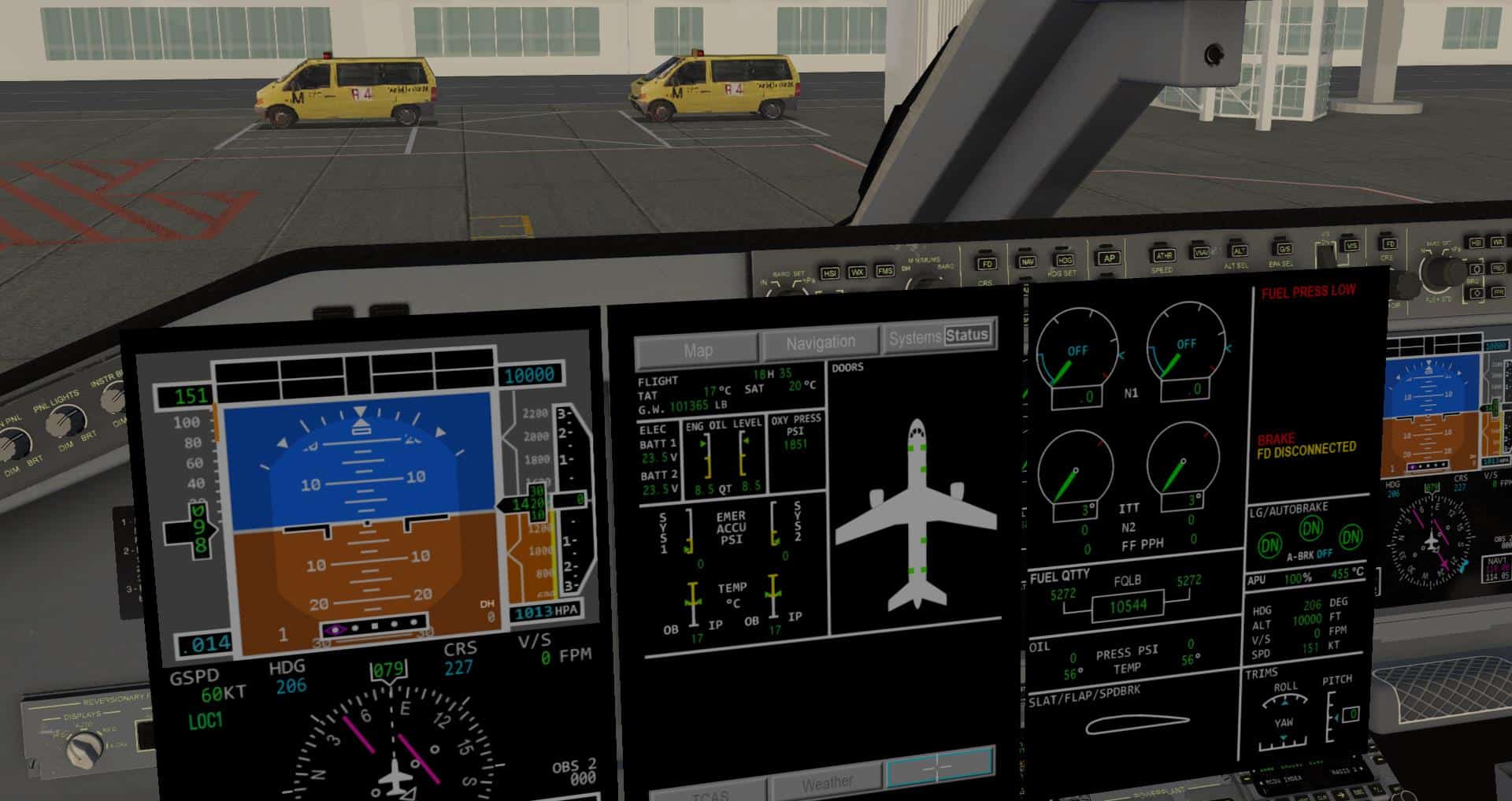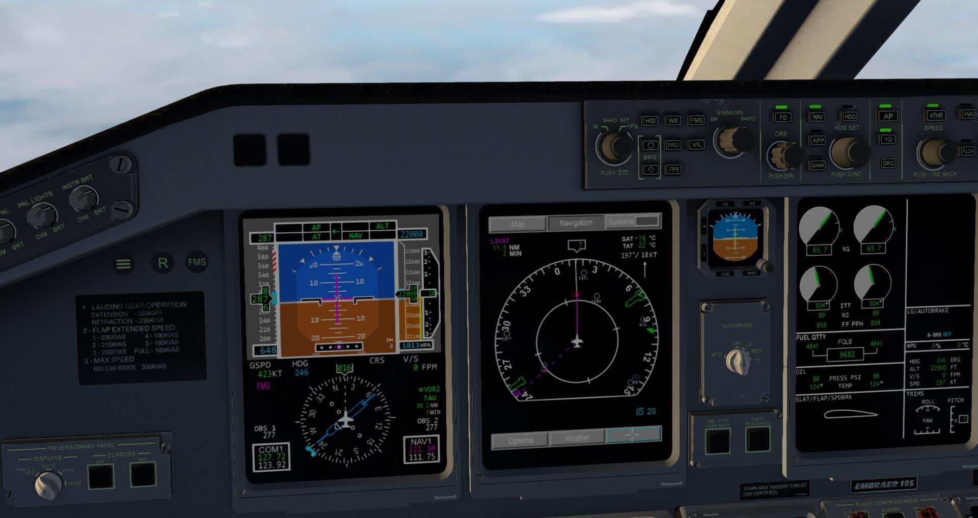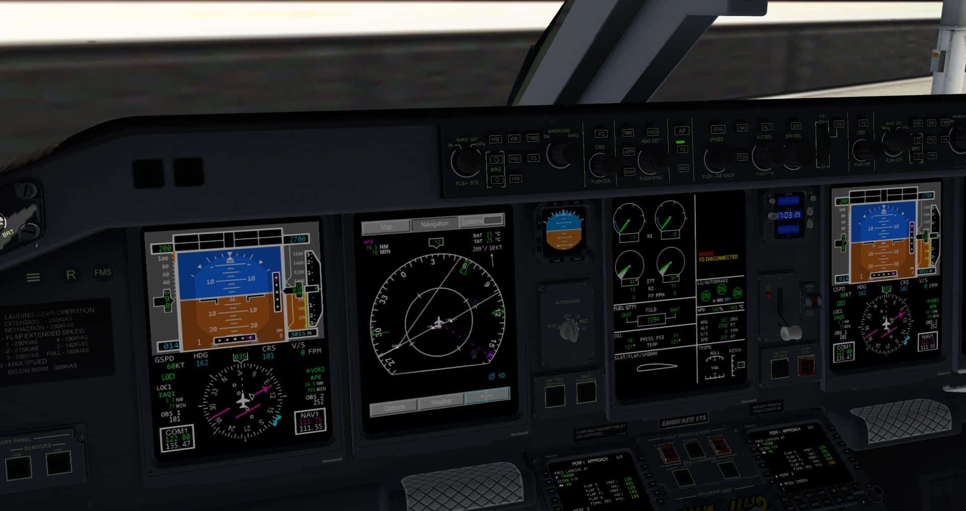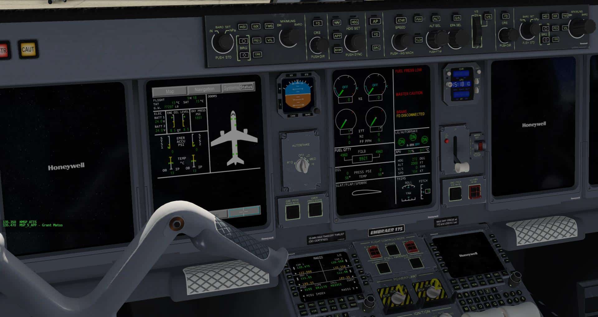 Systemtiefe? Nun ja… das ist wohl der Punkt, auf den ich vorher am meisten gehofft hatte. Eine Embraer mit einigermaßen vernünftiger Systemtiefe war meine Hoffnung. So etwas grob in die Richtung, die JARDesign so gegangen ist. Nichts, womit man Study-Level-Sim-Liebhaber (der ich auch, aber nicht ausschließlich, bin) hinter dem Ofen hervorholen möchte, aber eine solide Geschichte, die sich dem realen Vorbild schon gut annähert.