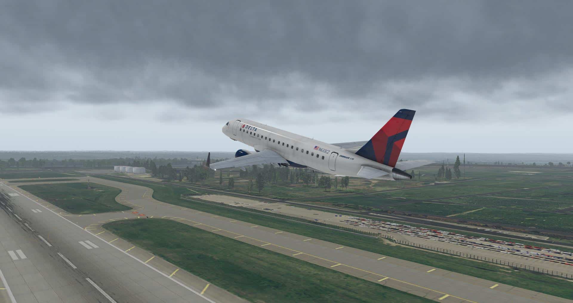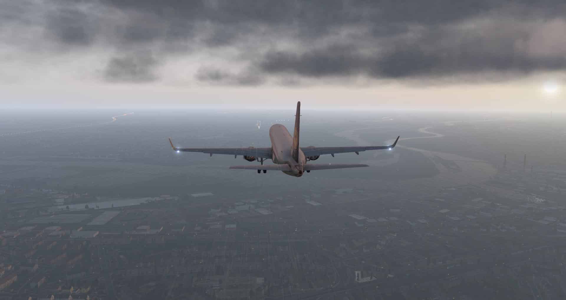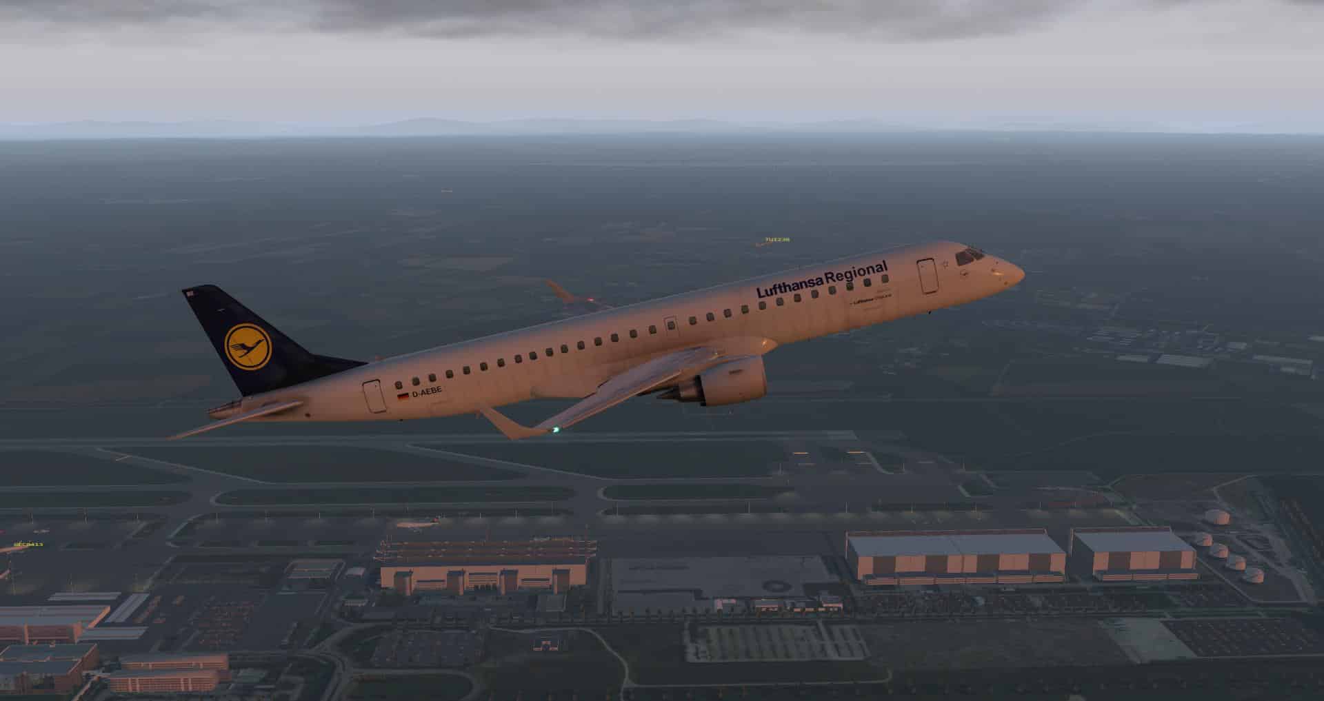 Wir rollen zum Rollhalt der Piste 12R, schalten das Strobelight und die Landelichter an, rollen auf die Piste und starten. Hier merken wir, dass wir es hier mit einem FADEC, wie es im realen Vorbild eingesetzt wird, nicht zu tun haben. Vollschub heißt Vollschub, was eben auch bedeutet, dass die Triebwerke nicht entsprechend der aktuellen Umgebungsparameter gedrosselt werden, wie es bei Airbus, den neuen Boeings und eben auch bei den E-Jets Usus ist. Im Display ist sogar eine Markierung vorhanden, die ein maximales Thrustsetting markieren sollte. Dummerweise hält sich nichts daran. Weder das Mapping des virtuellen Schubreglers, noch – Achtung, das ist schon ein kleiner Spoiler – der Autothrottle. Aber fürs erste Schwamm drüber. Wir legen manuell ein Thrustsetting in der Nähe der entsprechenden Markierung an und können bald rotieren und im Steigflug erstmals ein Händchen für das Flugzeug entwickeln. Entsprechend der relativ geringen Größe vermittelt die E175 einen eher handlichen Eindruck, allerdings ohne überbordend agil zu wirken, was sehr angenehm ist. Leider sorgt das im Interieur sehr leise Triebwerksgeräusch dafür, dass das Hands-on-Fliegen (Autopilot und Autothrottle aus) nicht einfacher wird, weil man das Gefühl für das Thrustsetting so weitaus schlechter bekommt. Natürlich kann man X-Plane-intern nachjustieren und das Soundlevel erhöhen. Dann ist es aber auch bei meinen anderen Flugzeugen erhöht, mit denen ich lautstärkemäßig wiederum eigentlich sehr zufrieden war. Von außen ist das Geräuschlevel hingegen nachvollziehbar.