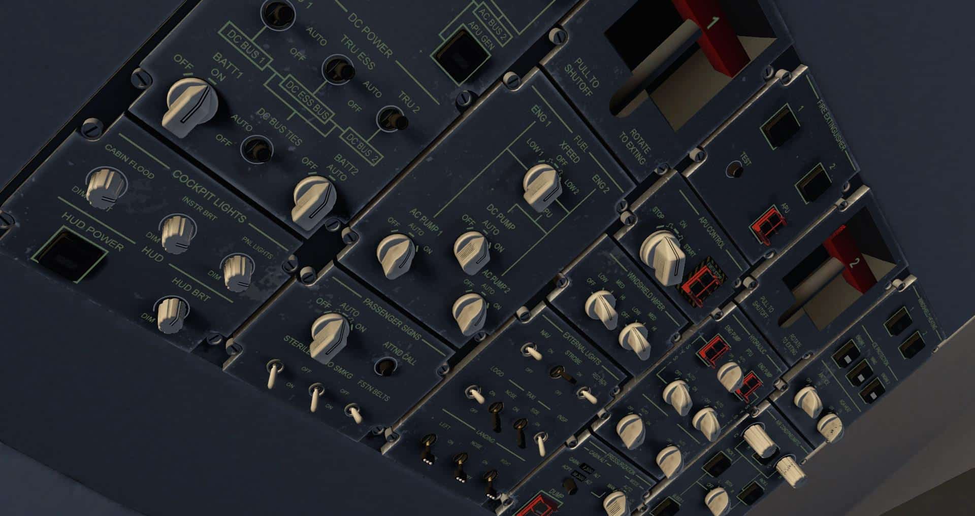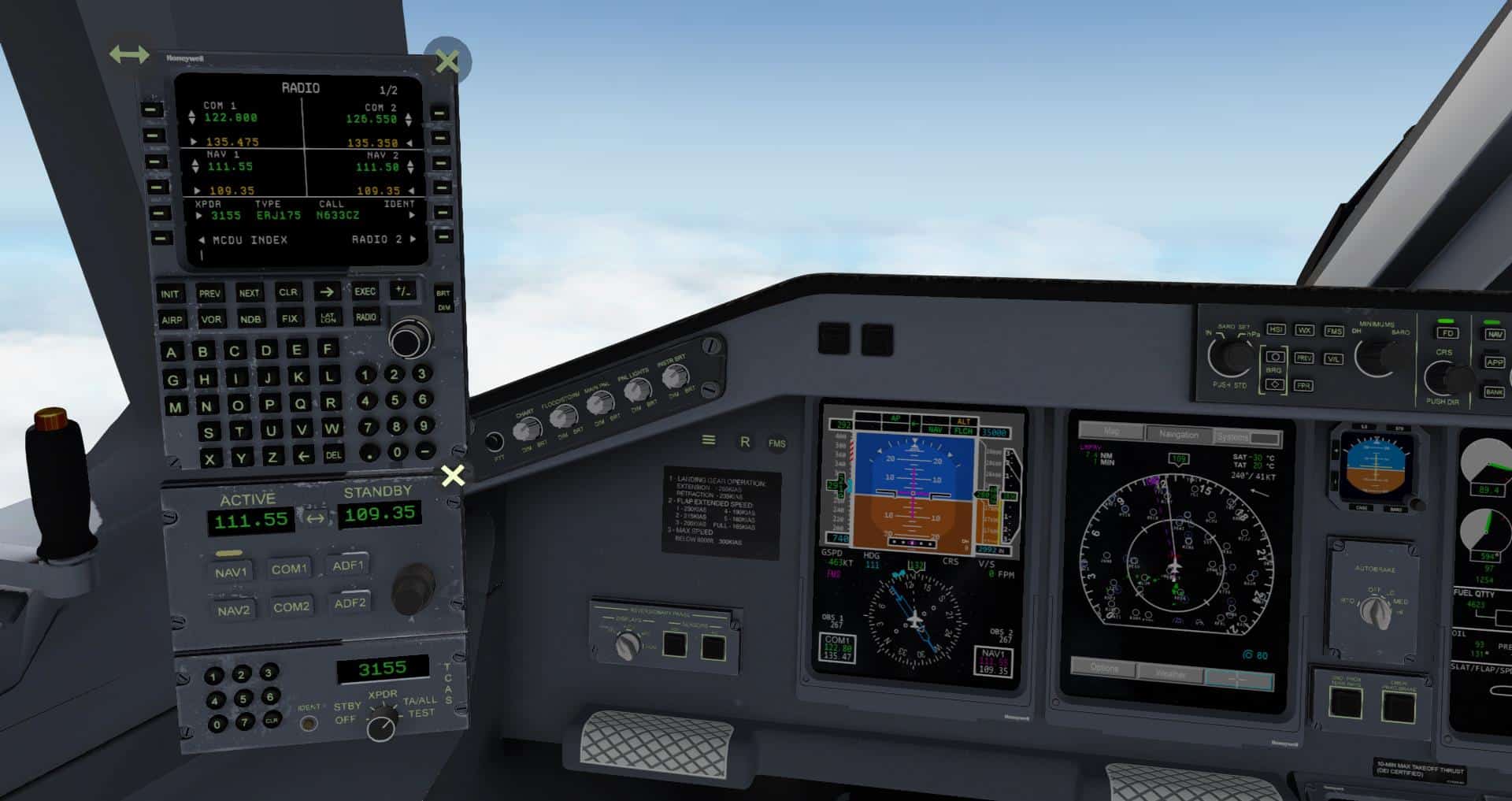 Kommen wir ins Cockpit, setzt sich der Eindruck erst einmal fort. Es wurde sehr detailliert gearbeitet, alle Schalter und Knöpfe (auch die nicht bedienbaren) sind modelliert. Dem groben Vergleich mit YouTube-Videos halten beide X-Crafts Embraer E-Jets ohne große Mühe stand. Zumindest solange das Flugzeug cold and dark ist und entsprechend keine Displays angeschaltet sind. Ich gehe hier noch gar nicht dezidiert auf die Systeme ein, aber optisch haben die Displays, die auf X-Planes Standardinstrumenten aufsetzen, zusätzlich einen großen Nachteil. Sie sind unscharf. Ohne weiteres benutzbar, gerade mit den klugen Popout-Displays, die perspektivisch und etwas größer vor den modellierten Displays eingeblendet werden, aber dennoch kein Vergleich zu eigens gestalteten und umgesetzten Anzeigen. Für jemanden wie mich, der seinen Fokus definitiv aufs Cockpit und die Systeme legt, ist das ein Stück weit enttäuschend. Der eigentlich sehr gute optische Eindruck – auch im Cockpit – wird in meinen Augen hier doch ein wenig getrübt.