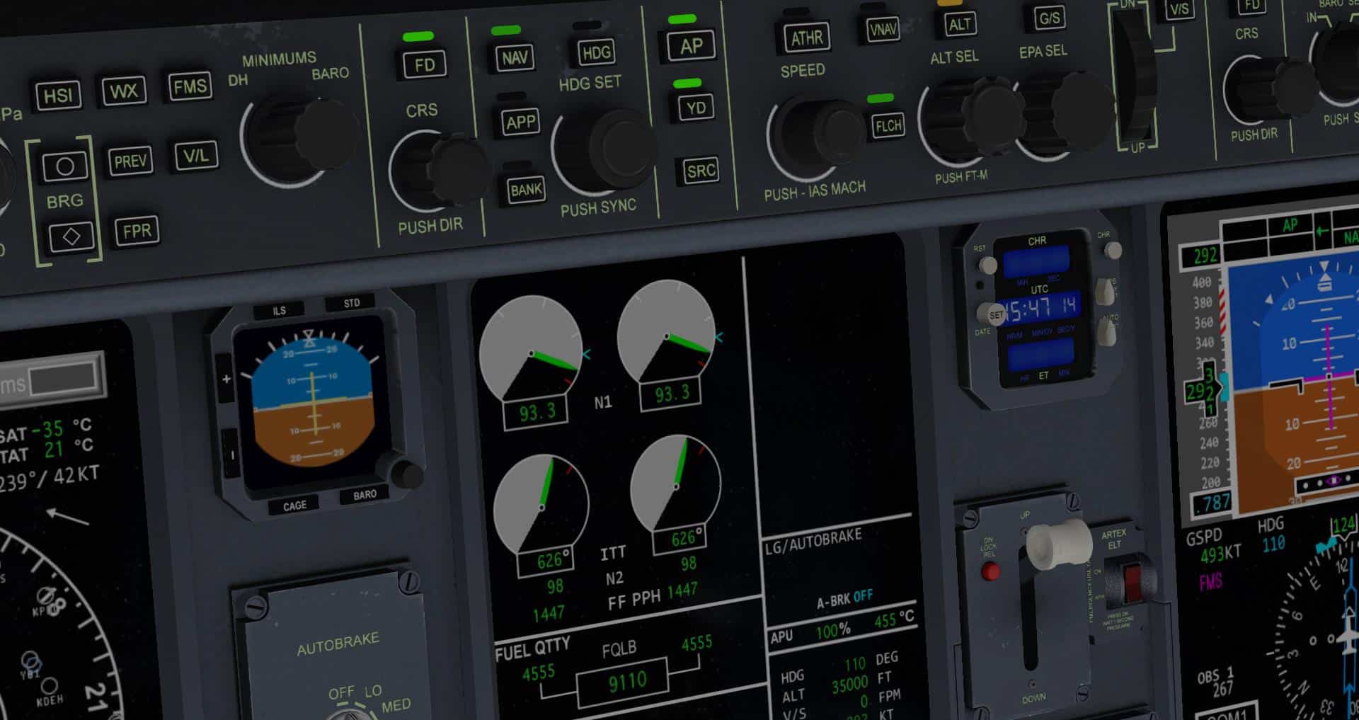 Über das vermutlich gar nicht implementierte FADEC habe ich bereits geschrieben. Es wird mit einer blauen Markierung (ähnlich wie im realen Vorbild) das Thrust Limit angezeigt, wobei man die Engines ohne weiteres darüber schieben kann. Dazu schiebt eben auch der Autothrottle die Schubhebel darüber hinaus einfach aufs Maximum, was das Ganze komplett ad absurdum führt. Der nett gemeinte Hinweis der Entwickler, unter Autopilot beim Übergang von Level Flight auf Steigflug mit FLCH und Autothrottle, im Climb (wo man den Autothrottle übersteuern kann), den Schub ein wenig zurückzunehmen, weil man sonst sehr steil steige, zeigt den Anspruch der Entwickler. „Arbeite gegen den implementierten Autothrottle, um eine halbwegs realistische Climb-Performance zu erhalten.“ Für mich kann es das leider nicht sein.