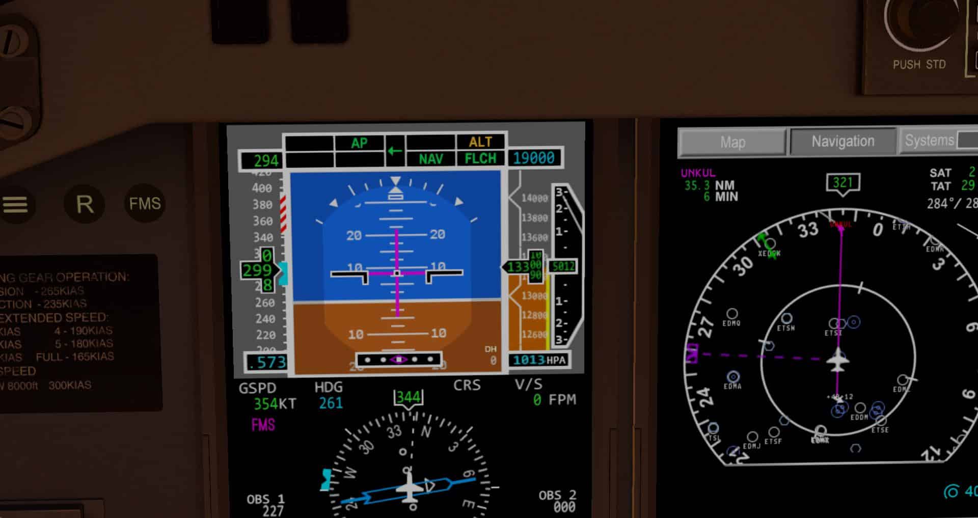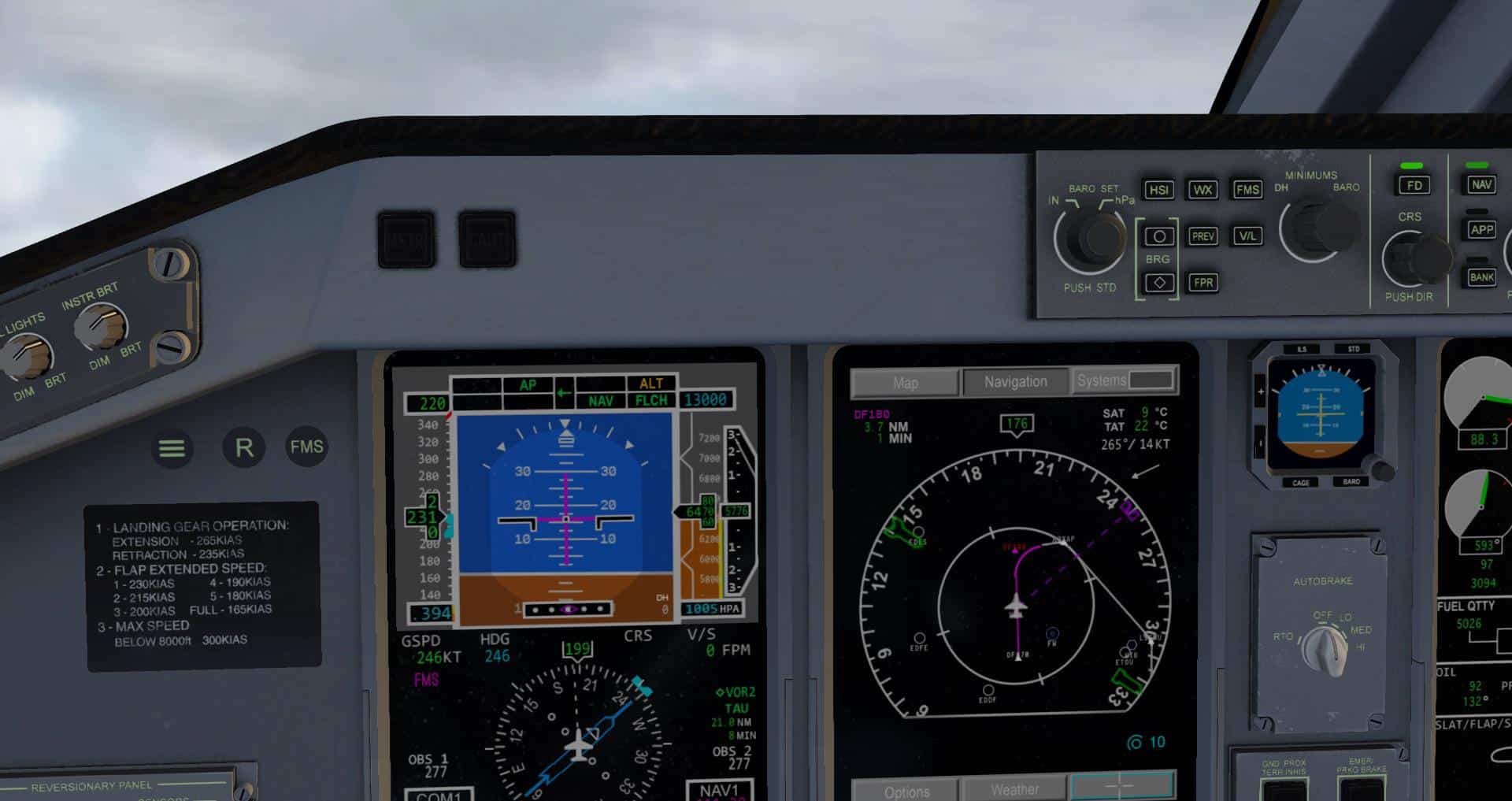 Allgemein finde ich es sehr schade, dass im Grunde alles Elementare der Standard-X-Plane-Logik überlassen wurde. Beim NAV-Display fällt das am meisten auf, wobei man dies zumindest leidlich lesbar belassen konnte mit ein wenig Tweaken (dafür ist die maximal anzeigbare Range kleiner als sie es standardmäßig wäre). Die Unschärfe lässt sich aber nicht wegdiskutieren, der fehlenden Klarheit wird allerdings mit der sehr klugen und hilfreichen Popout-Mechanik der Displays des Kapitäns entgegengewirkt.