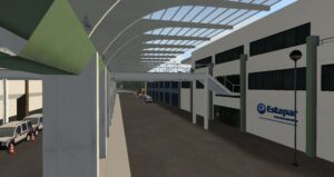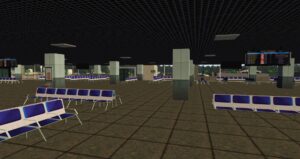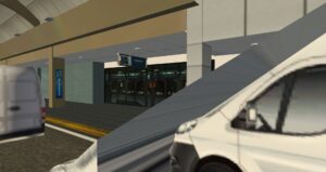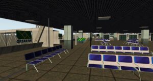 Und wenn wir an das Terminal heran fahren sehen wir einen der typischen Autogate Einweiser. Damit funktionieren hier auch die Autogate Dienste der Finger. Wie man außerdem bei einem Blick durch die Fenster sehen kann, haben wir hier keine einfachen Texturen, sondern Innenräume.