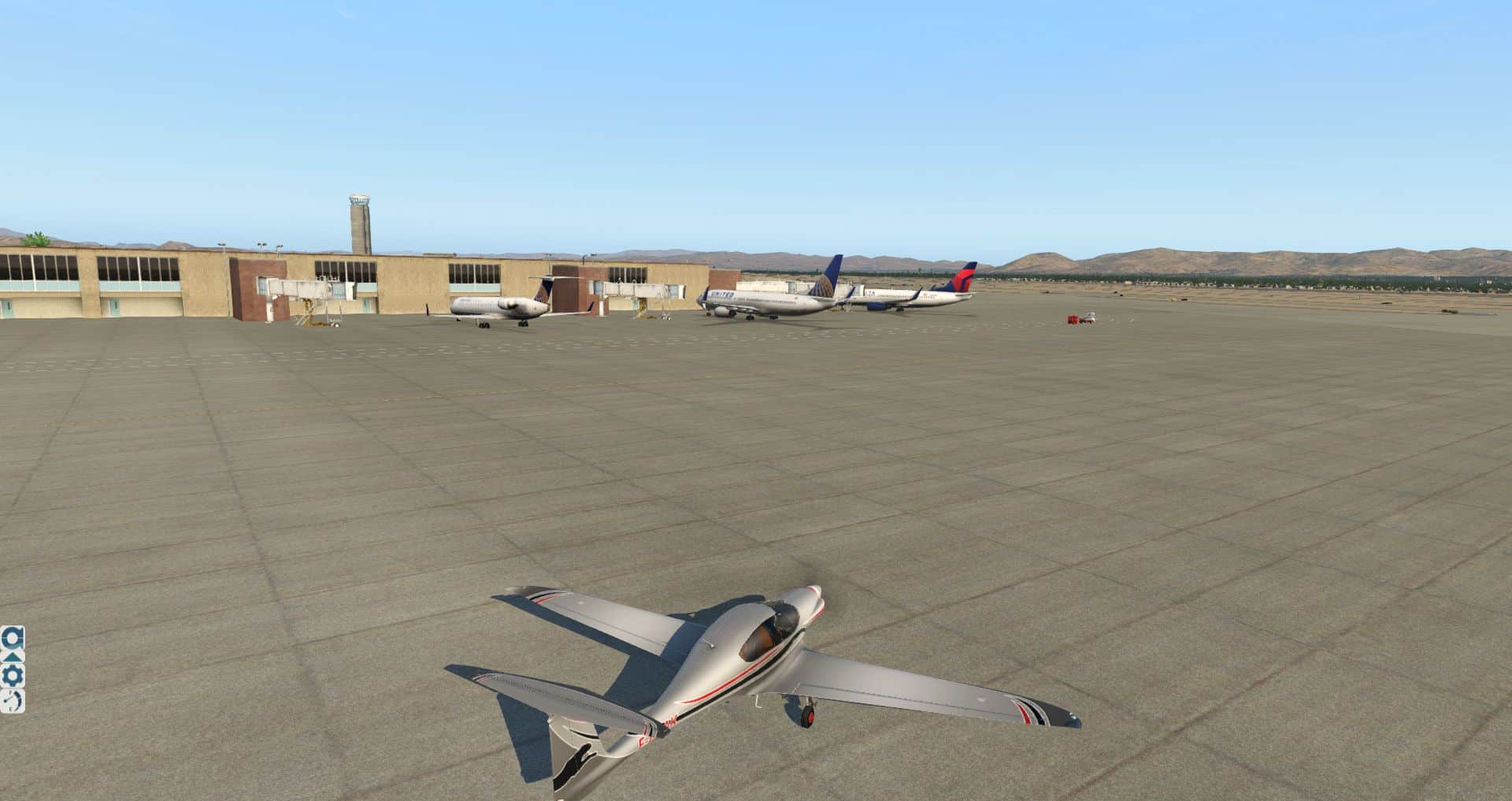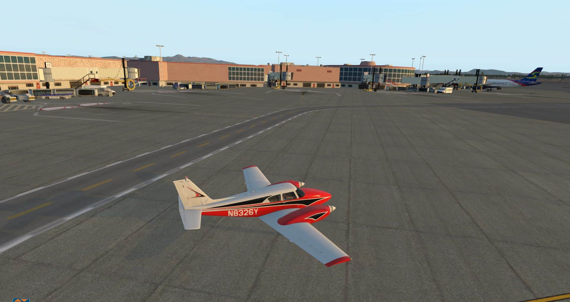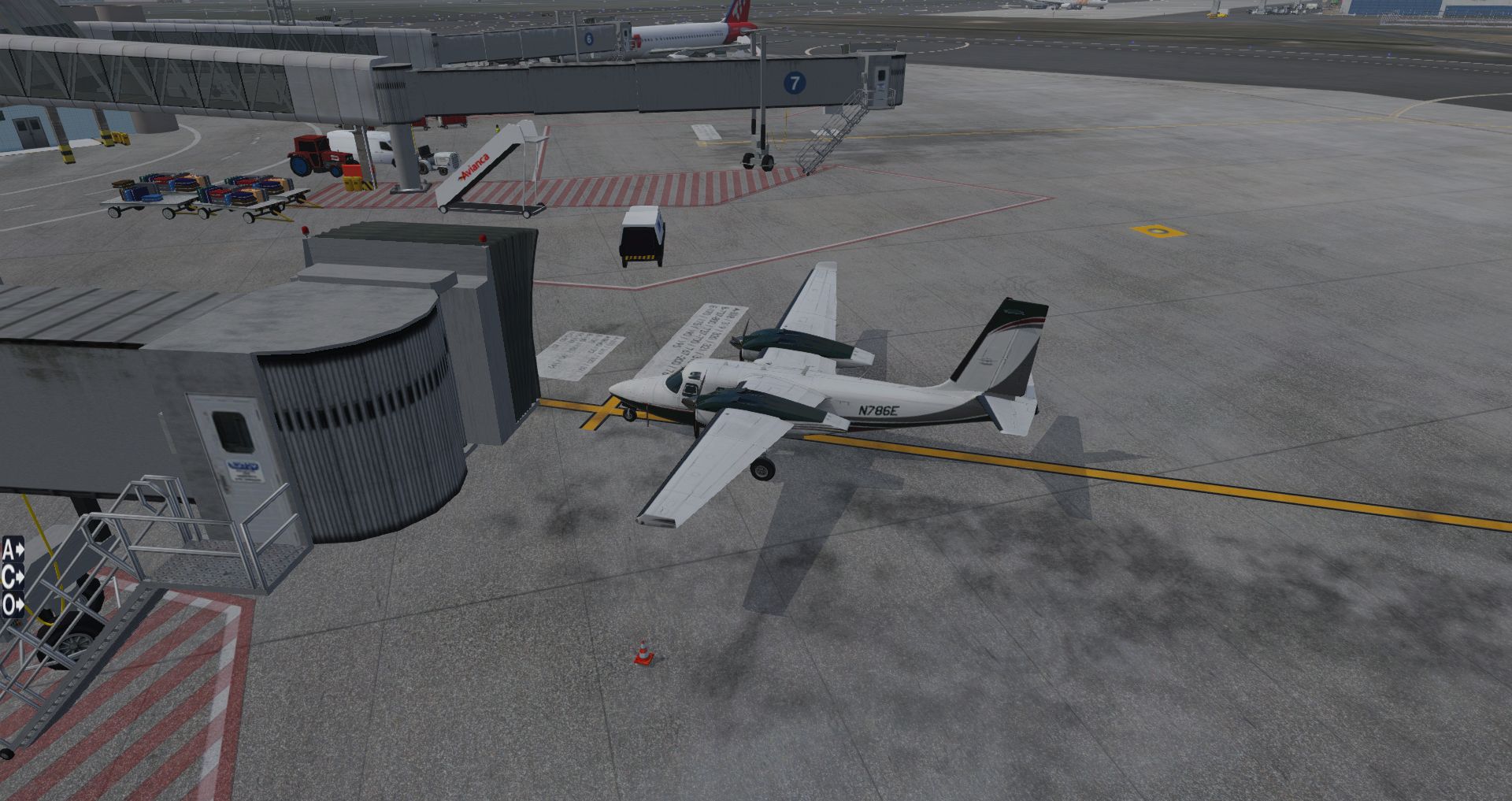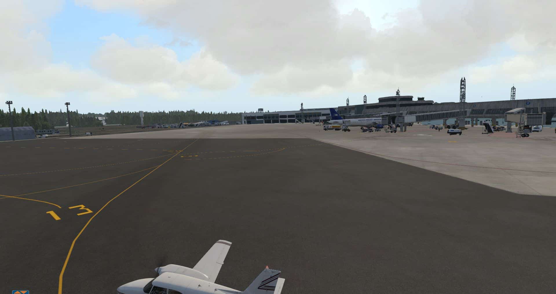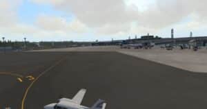 Wir starten zuerst mit einer Twin Comanche. Wir sehen sofort recht detaillierte Gebäude mit reflektierenden Fenstern, wie auch die etwas gealterten Terminalgebäude während die Finger relativ sauber und neu wirken.
