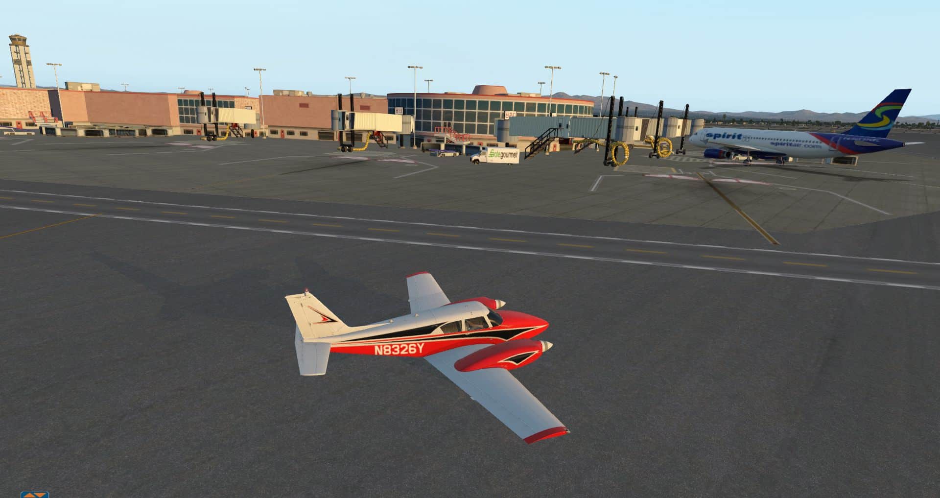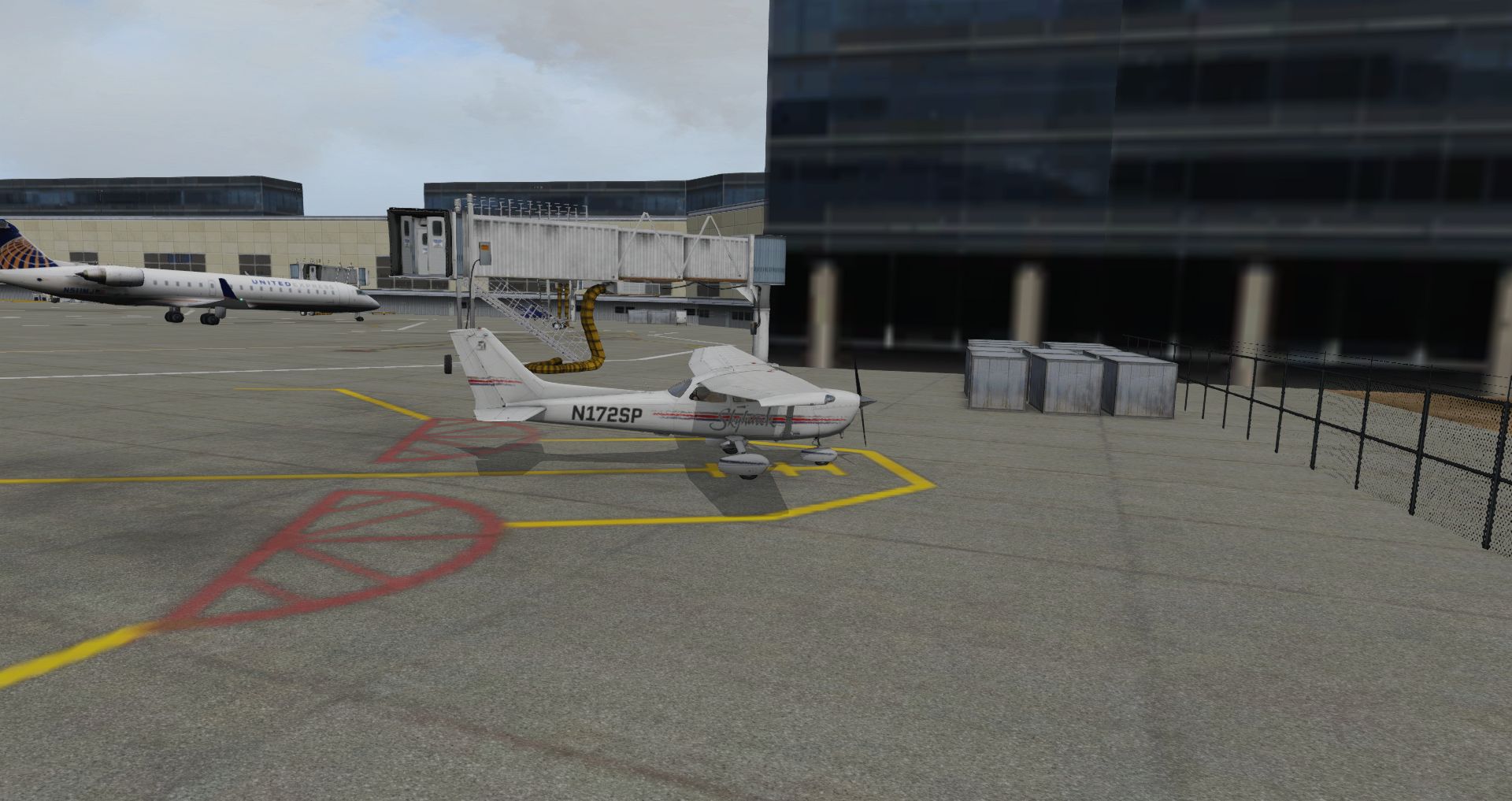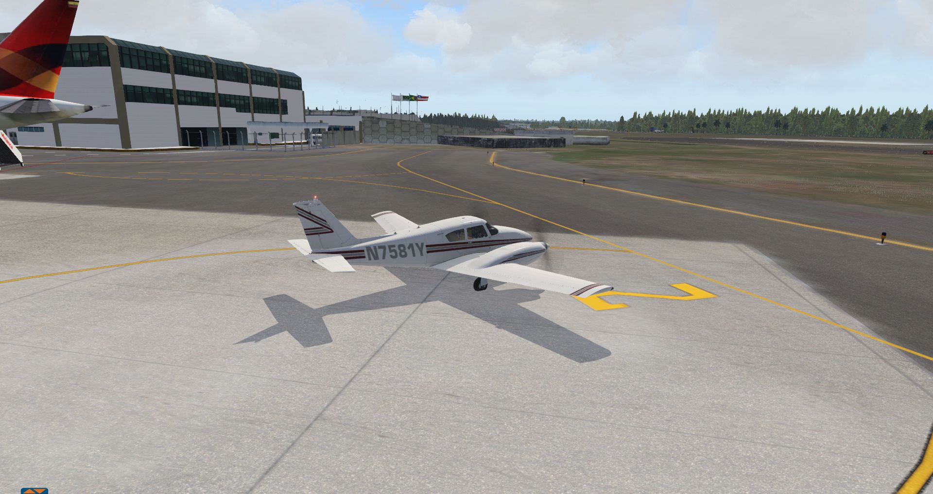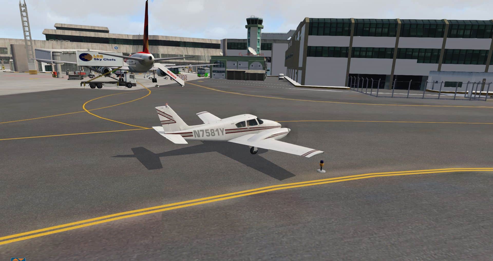 Wir starten zuerst mit einer Twin Comanche. Wir sehen sofort recht detaillierte Gebäude mit reflektierenden Fenstern, wie auch die etwas gealterten Terminalgebäude während die Finger relativ sauber und neu wirken.