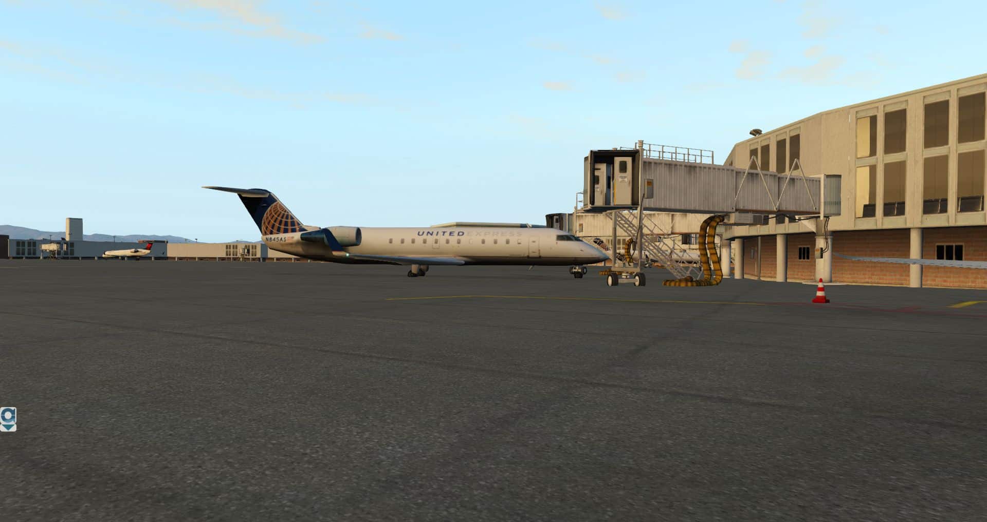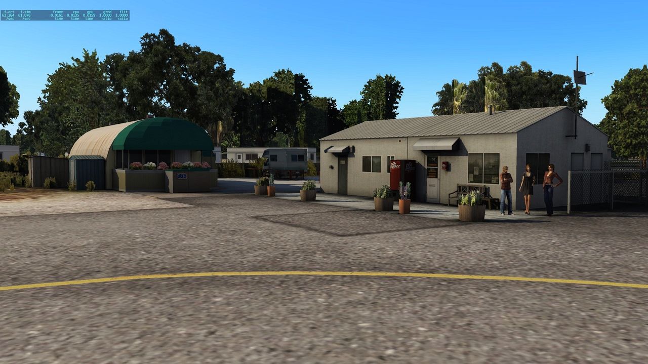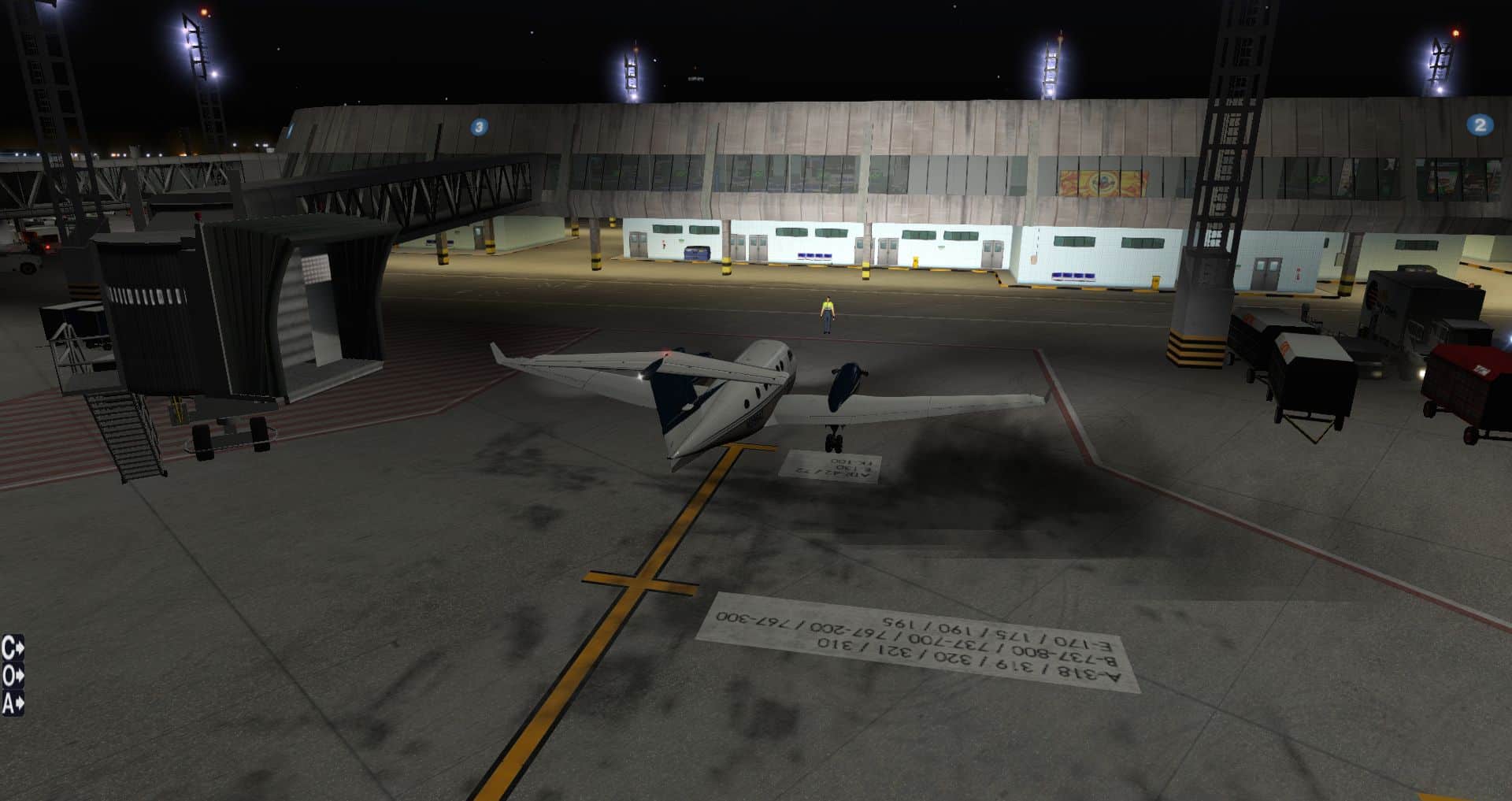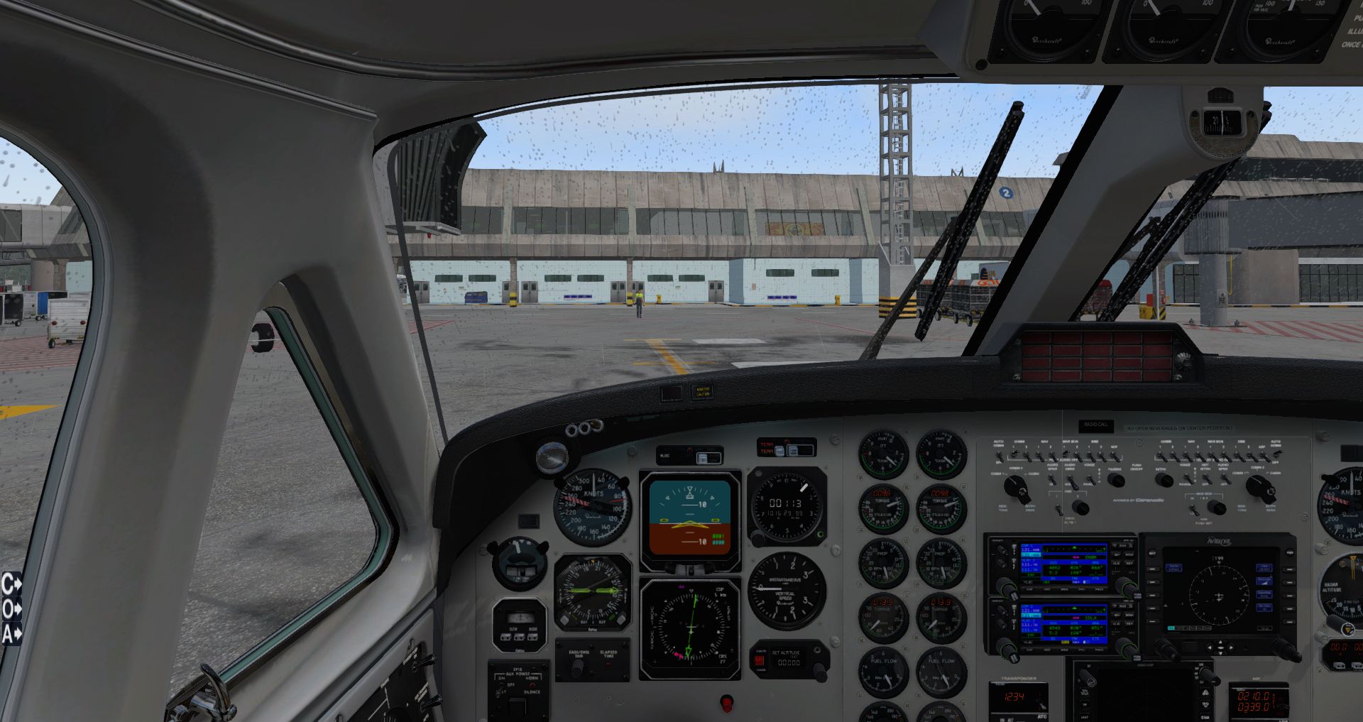 Wir starten zuerst mit einer Twin Comanche. Wir sehen sofort recht detaillierte Gebäude mit reflektierenden Fenstern, wie auch die etwas gealterten Terminalgebäude während die Finger relativ sauber und neu wirken.